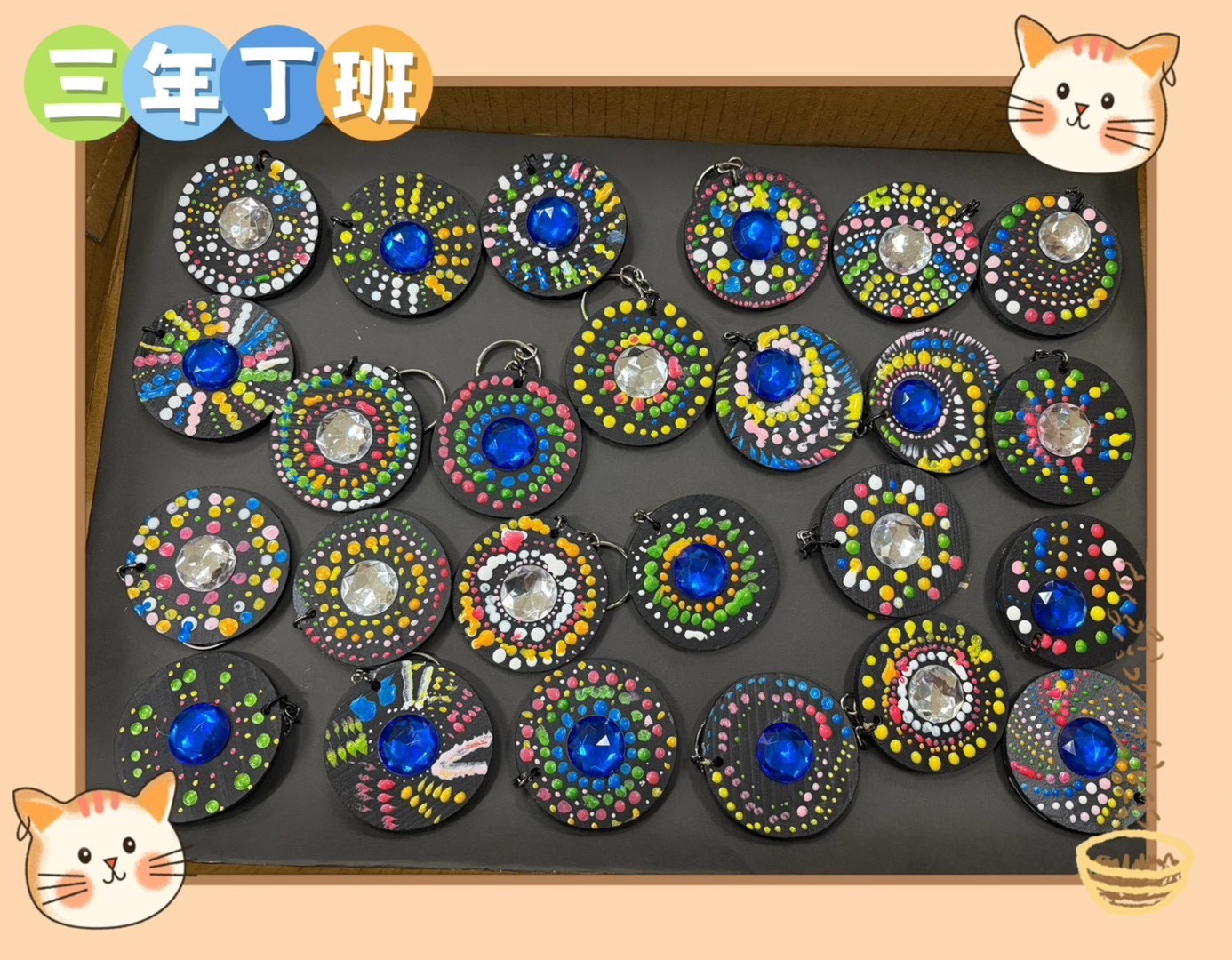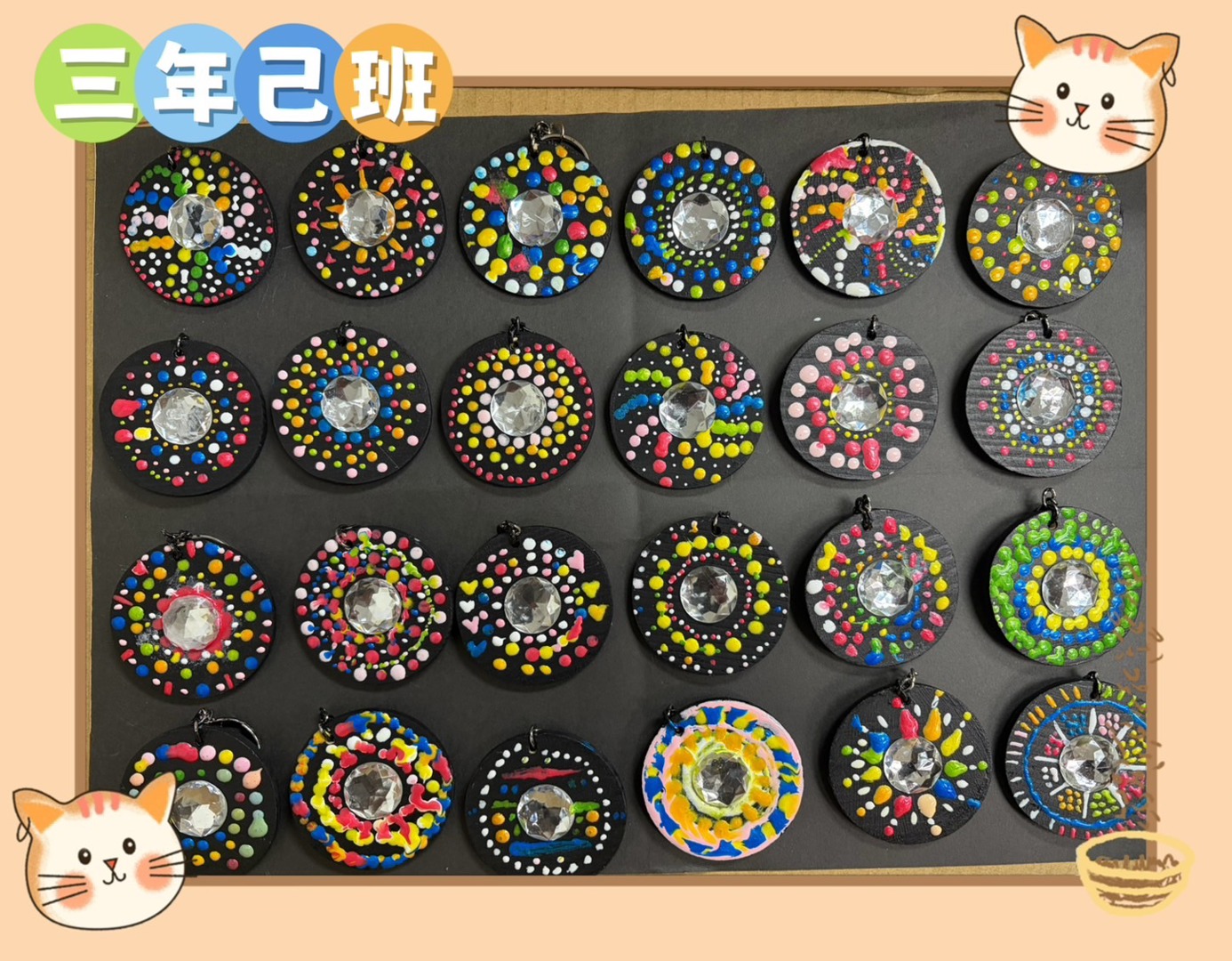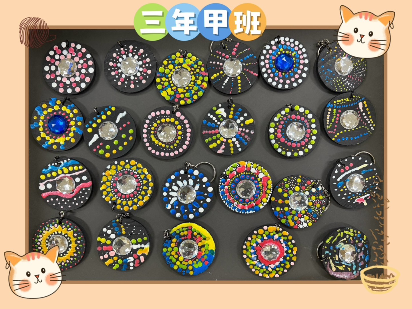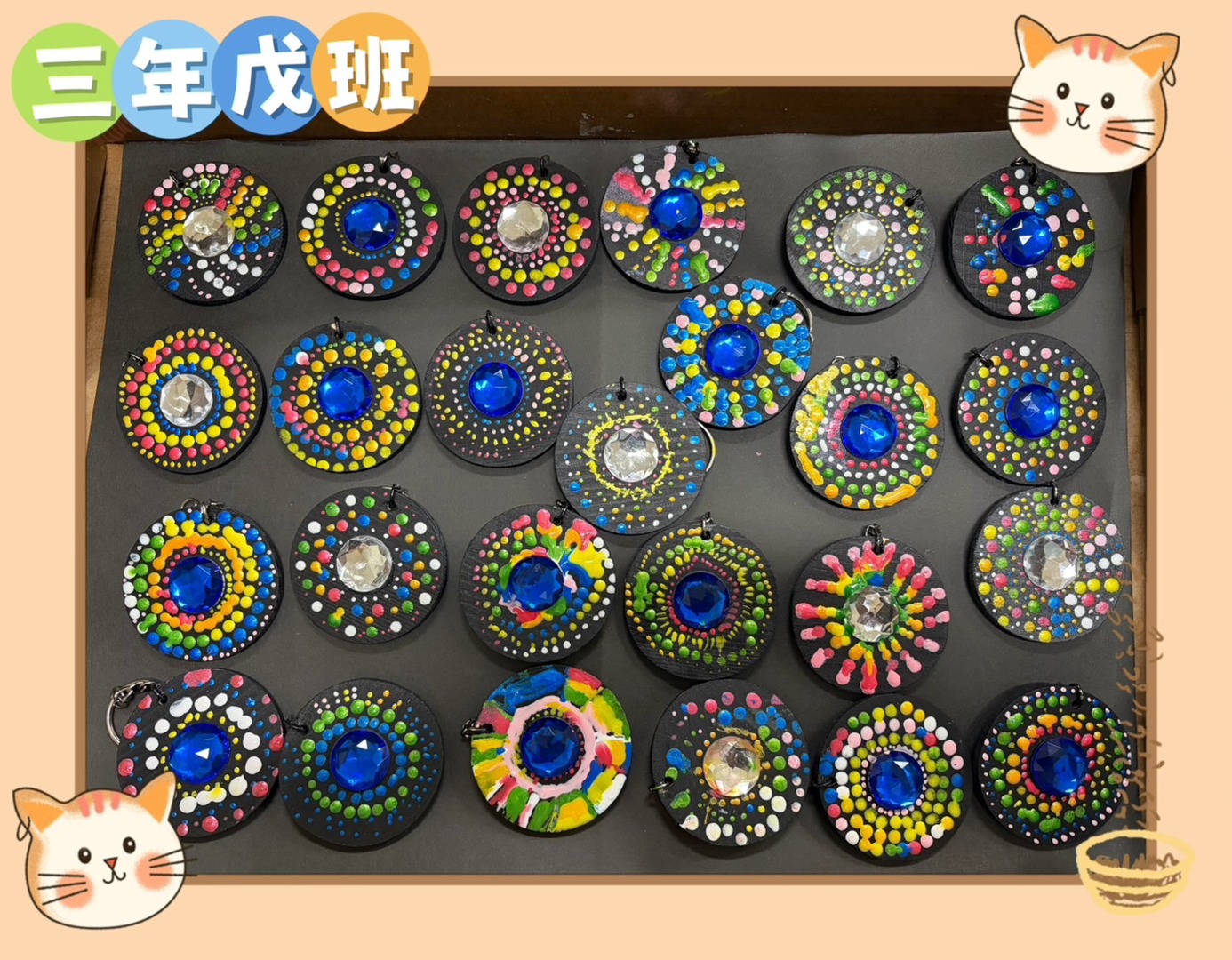 少棋老師以活潑有趣的教學方式,引導孩子從觀察生活中的各種形狀出發,進一步認識基礎三原色的概念,並理解色彩之間的混合與變化。課程中透過色彩學的簡單介紹,讓學生在操作中學習如何搭配顏色,培養美感與創造力。老師帶領孩子運用基本的點描技法進行彩繪,從點的排列與疊加中感受畫面的節奏與層次之美。最後結合曼陀羅圖案設計,讓學生將自己的創作延伸為實用的鑰匙圈作品,不僅提升學習動機,也增添完成作品的成就感。在過程中,孩子們專注投入、勇於嘗試,展現出豐富的想像力與個人風格,讓藝術學習充滿樂趣與驚喜。