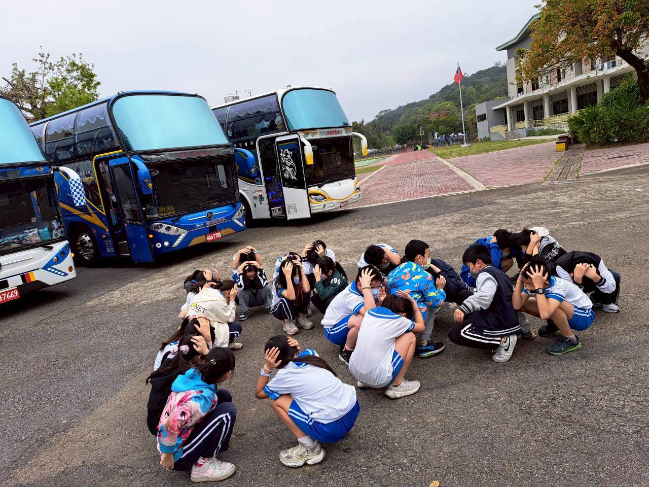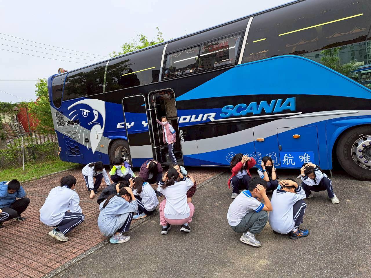 當日上午,學務主任親自到場叮嚀學生相關注意事項,提醒同學全程聽從老師與工作人員指揮,遵守團體行動規範,並隨時留意自身安全。隨後,學校安排學生進行遊覽車逃生演練,在教師與領隊的指導下,學生依序下車並迅速移動至安全位置,熟悉緊急應變流程。