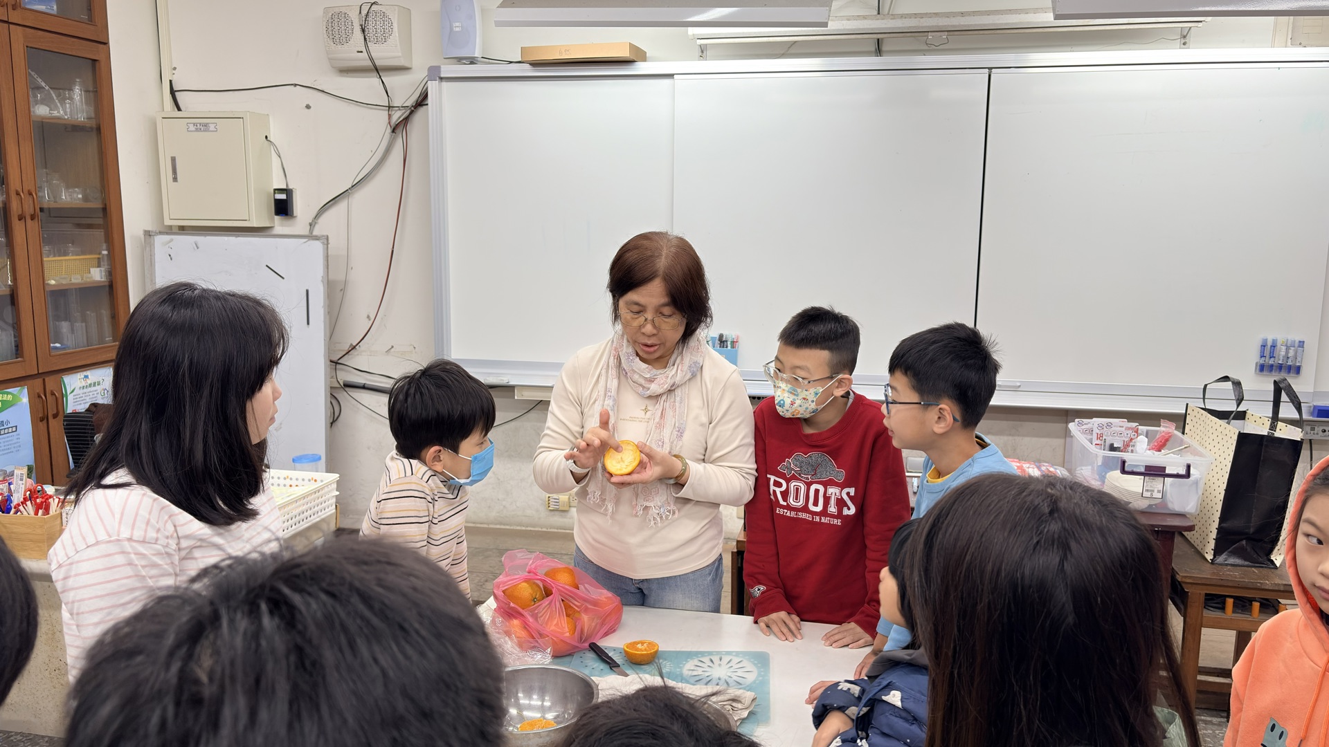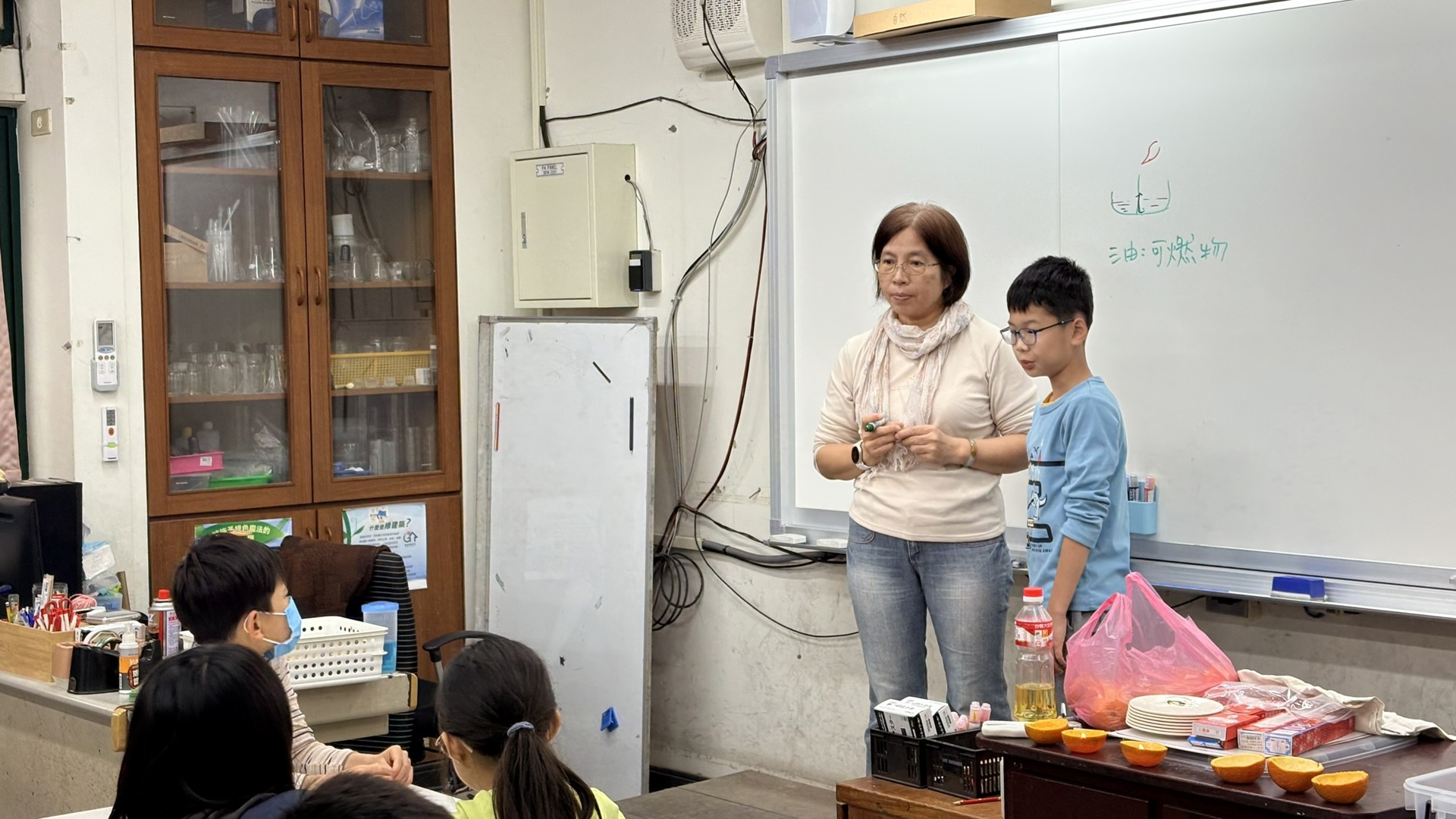老師首先示範挖空橘子果肉,巧妙運用留下的「橘絡」與日常食用的「沙拉油」,引導孩子們製作「橘子油燈」。