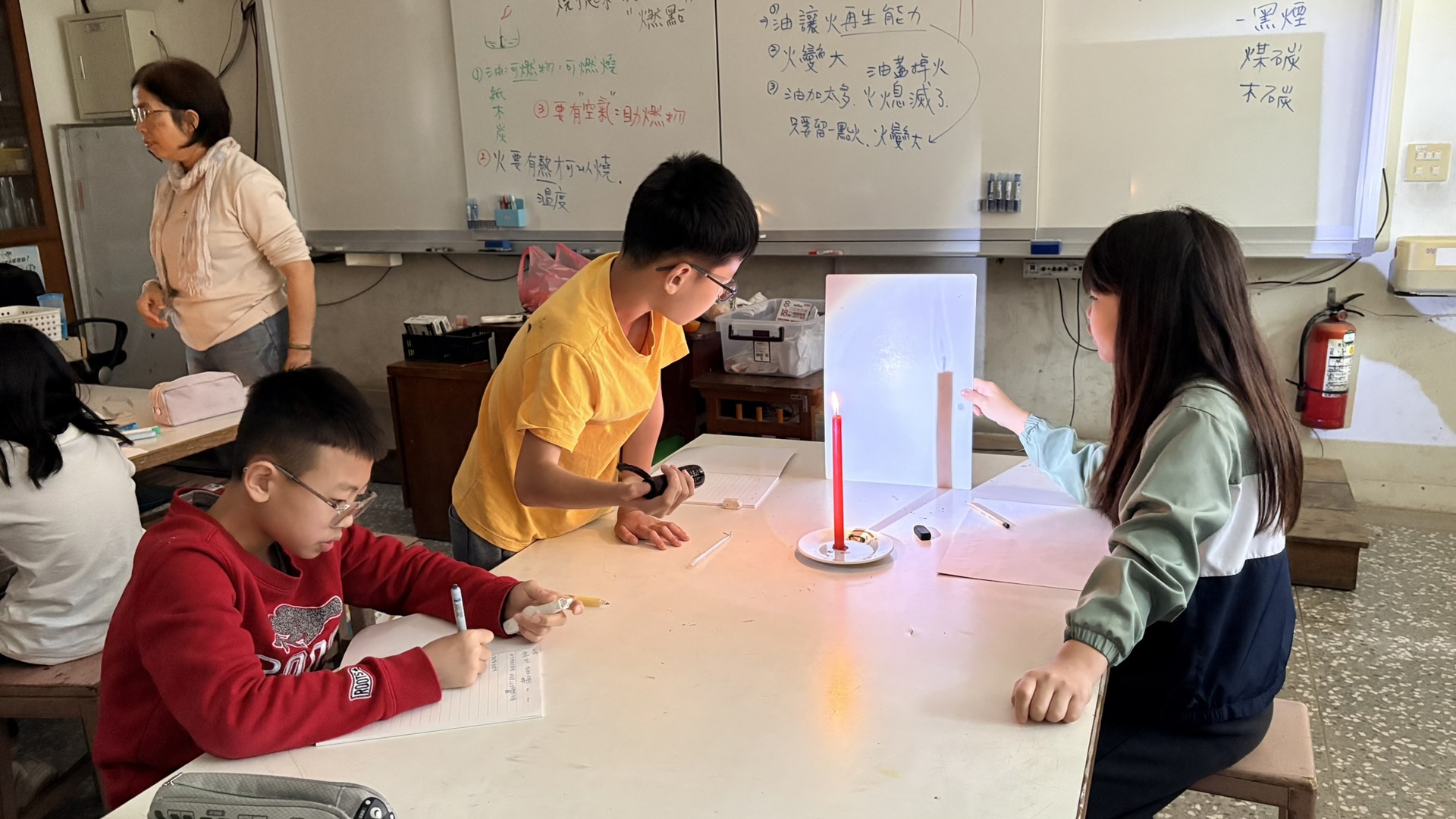 課程的另一波高潮,是讓學生擠壓橘子皮,當「橘皮油」接觸到火源時,瞬間綻放出點點微小的火花,宛如仙女棒一般!老師藉此視覺震撼,進一步帶入了「粉塵燃燒」的進階概念,厚植校園防災素養。最後,藉由觀察「燭火投影」的狀態,完整了這堂結合光影與燃燒的精彩課程。