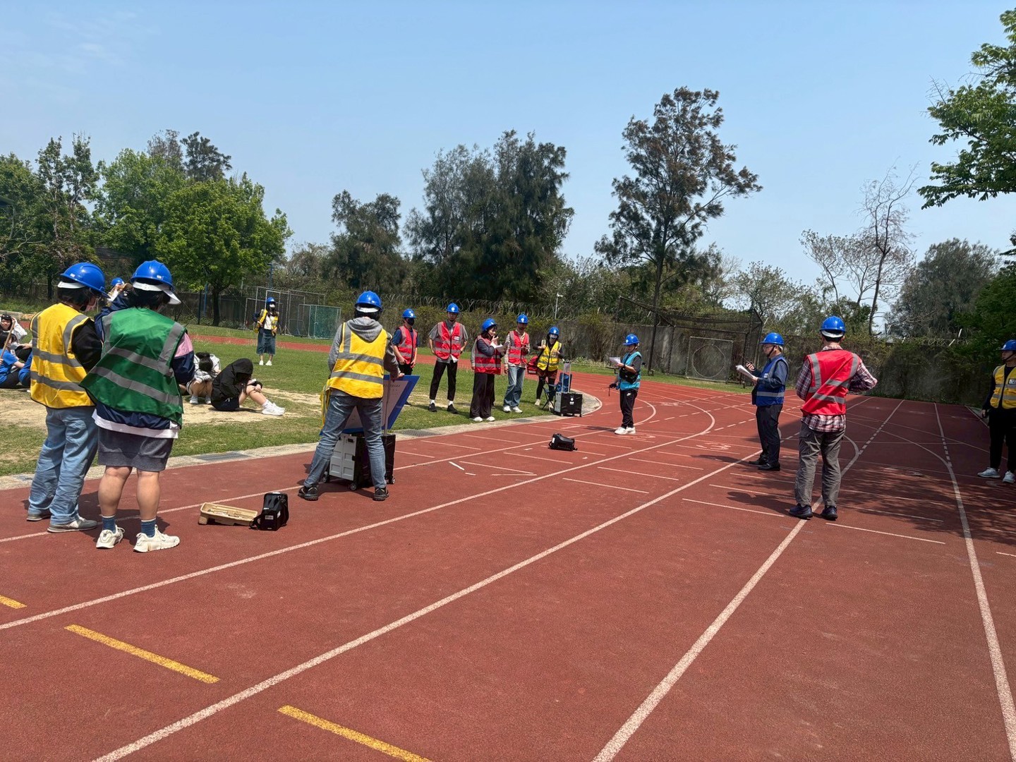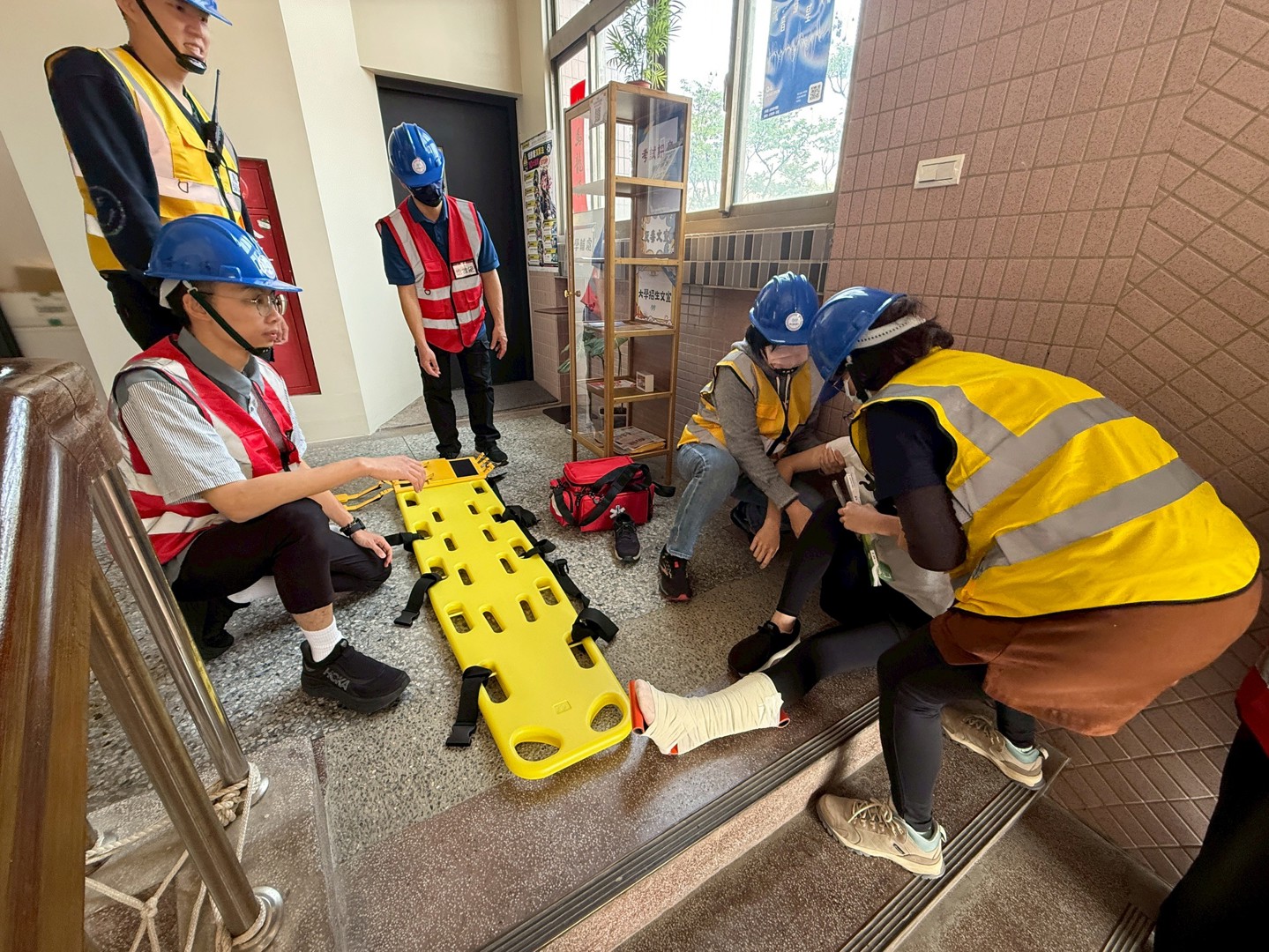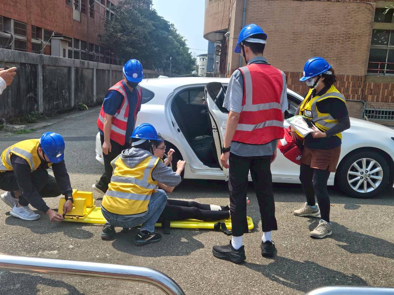 演練過程中,迅速完成通報及人數清點。綜合演練情境包括:學生疏散過程中受傷之緊急救護與送醫處置、建築物受損之危樓封鎖與管制,以及儲藏室起火之初期滅火應變,各項情境均順利執行,整體演練圓滿完成。