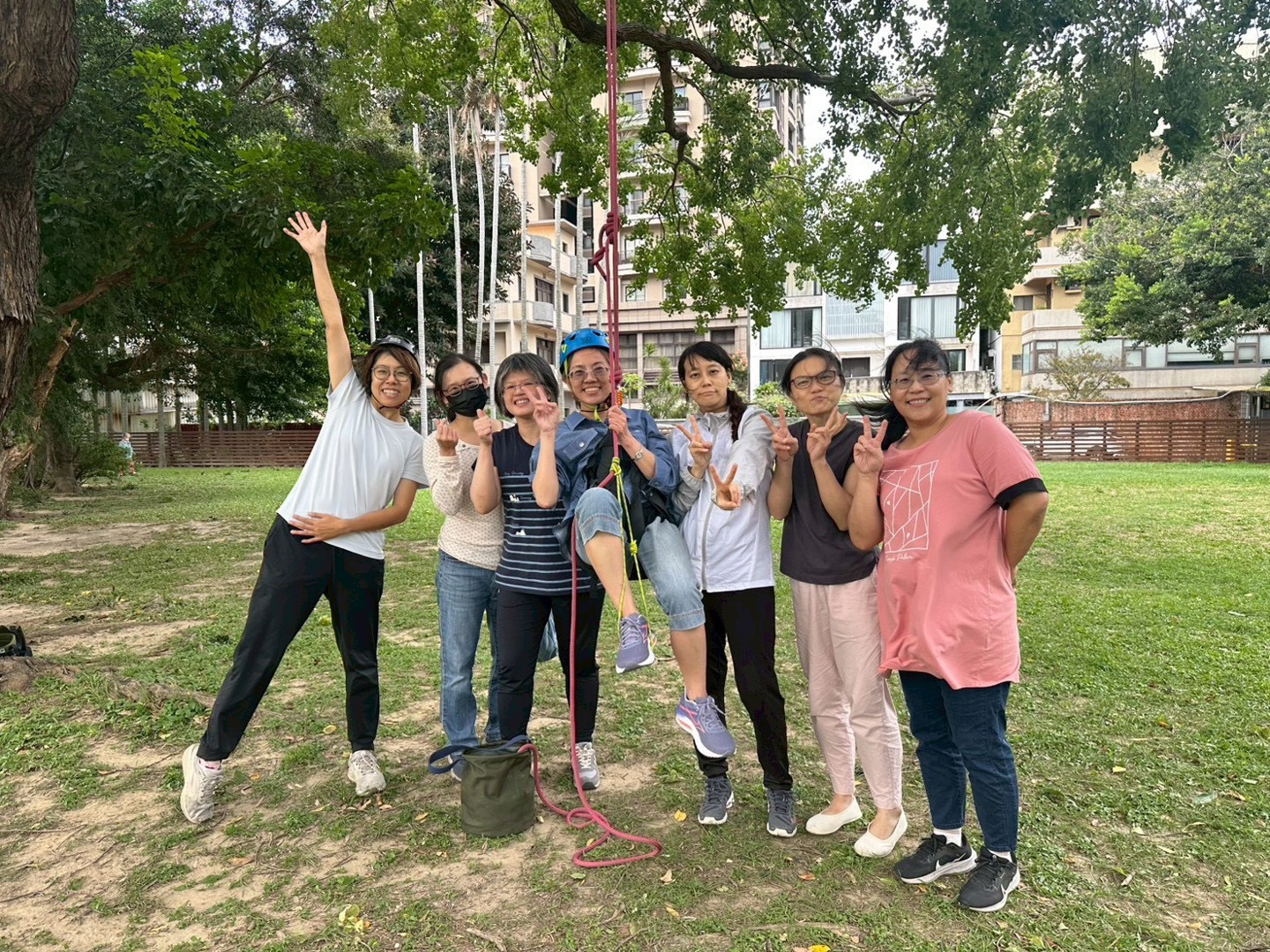 在課程正式推動前,教師團隊已於去年11月由欣雯老師領軍,率先進行實地體驗與專業研習。透過親身參與攀樹活動,教師們深入了解課程流程、安全機制及教學重點,為後續課程實施做好充分準備,並與家長進行溝通說明,展現東門教師團隊對教學品質的高度重視。