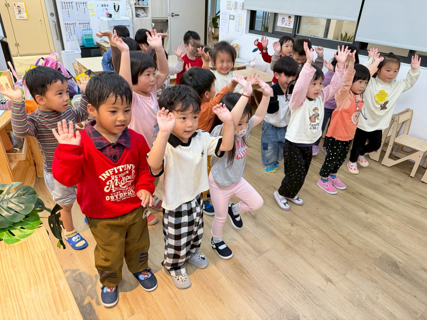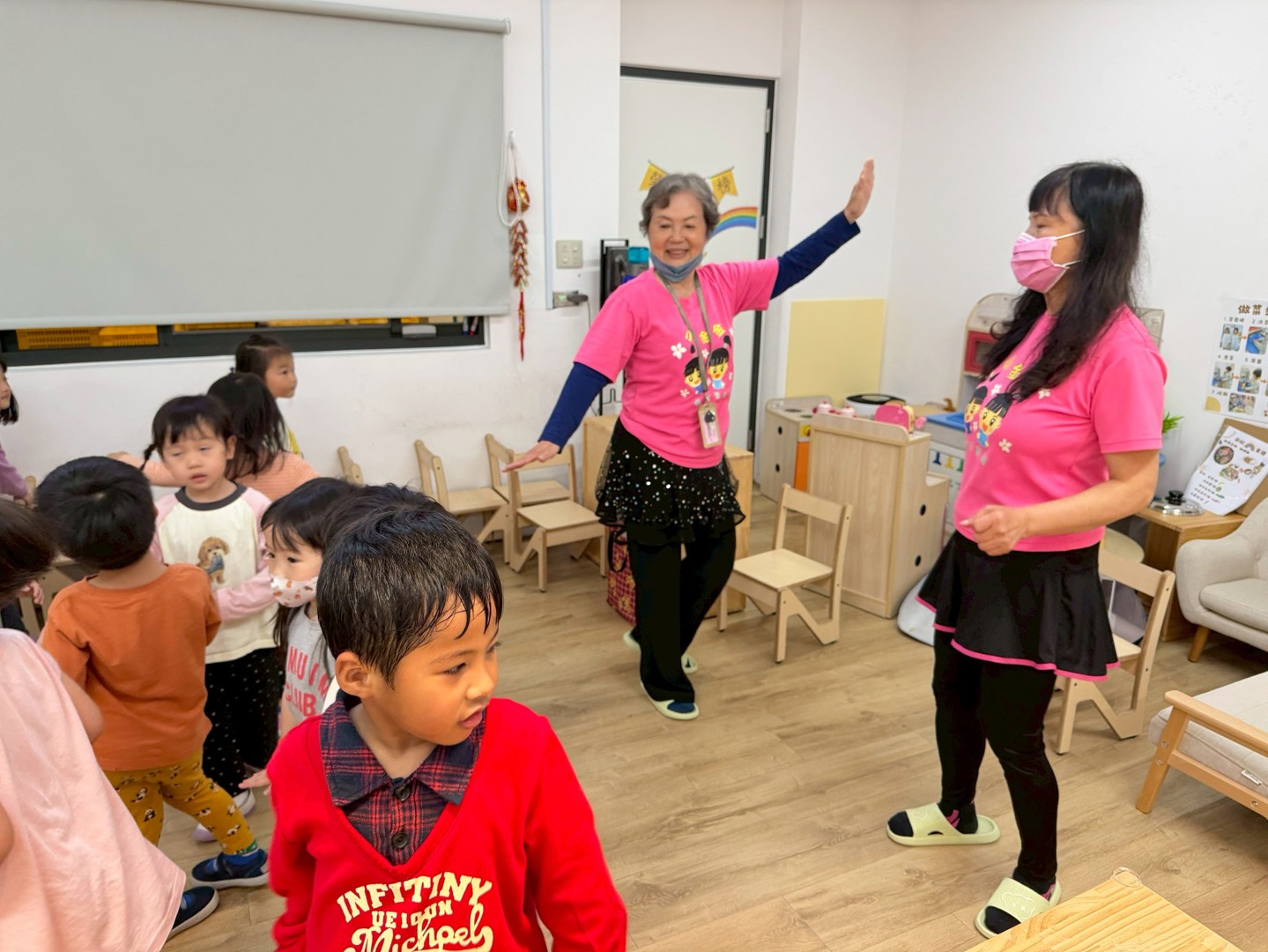本週彩虹寶貝們跟著老師一起認識新的本土語歌謠〈羊咩咩〉,在輕快的旋律中開心唱唱跳跳,充滿參與感與笑聲。