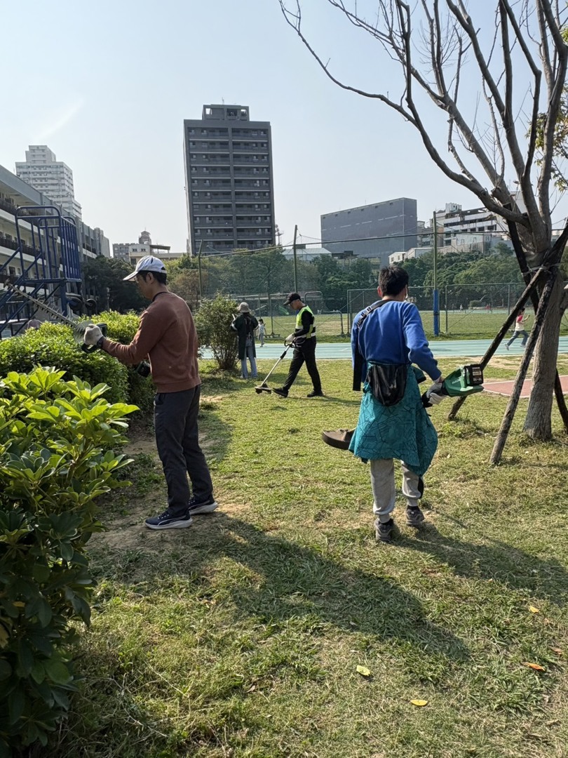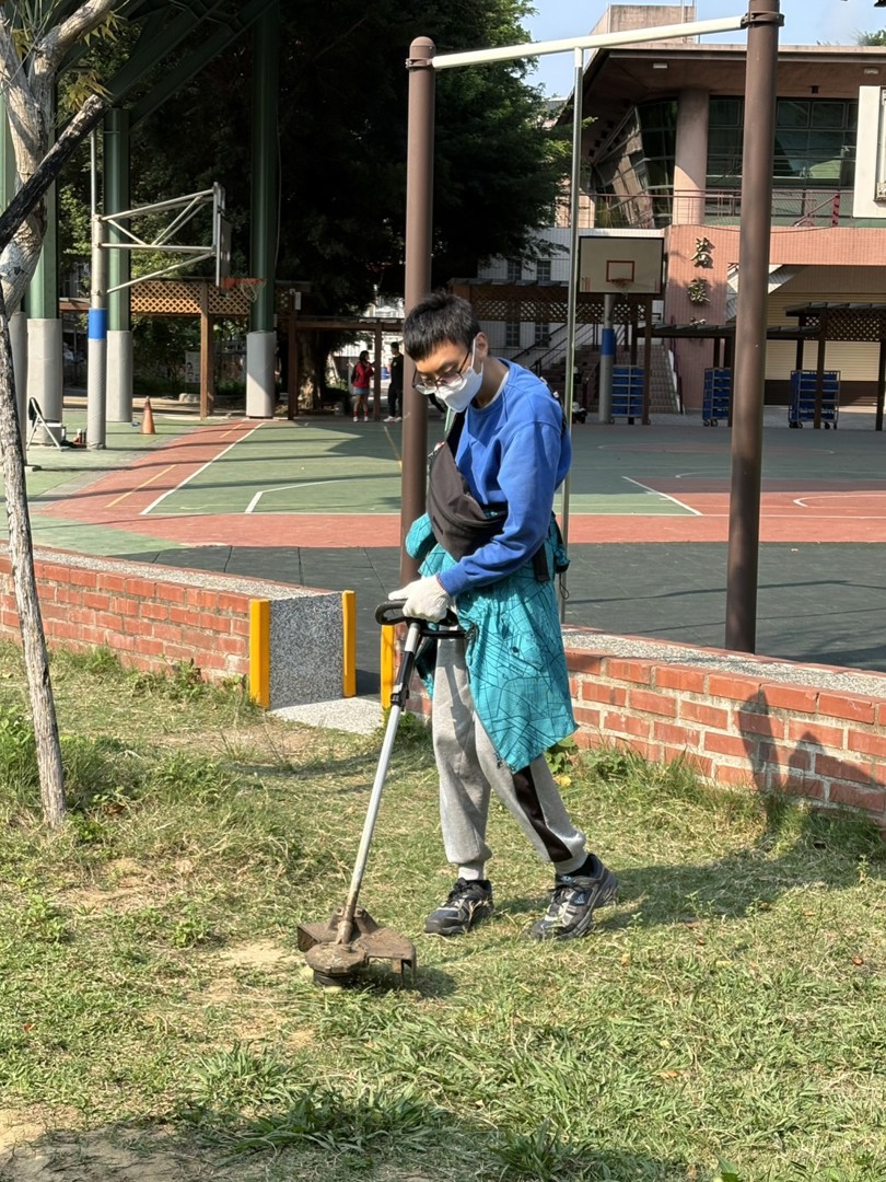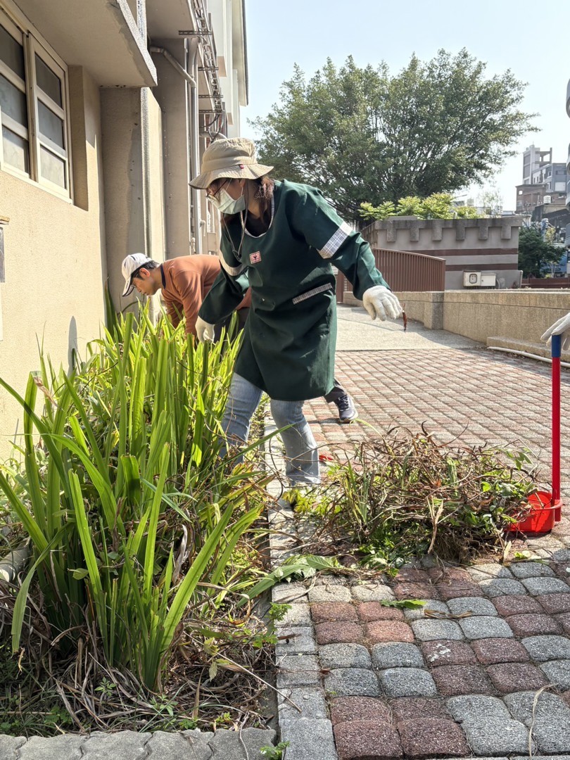 今起鋒面接近並通過,北部與東北部將轉涼,趁著天氣轉為不穩定前,一早總務主任招集了最愛校的總務處服務人員進行操場旁三角區域環境綠美化工作。