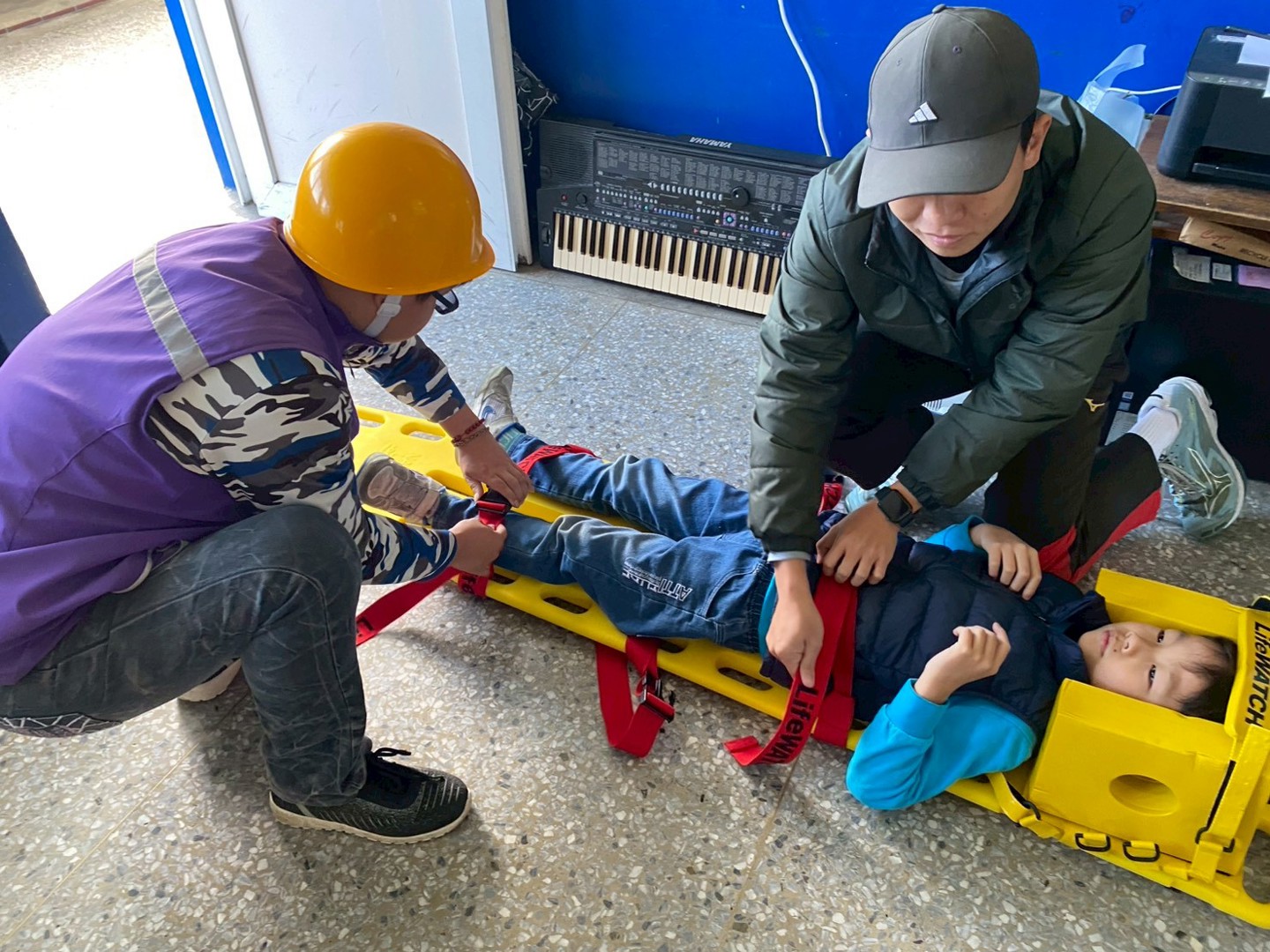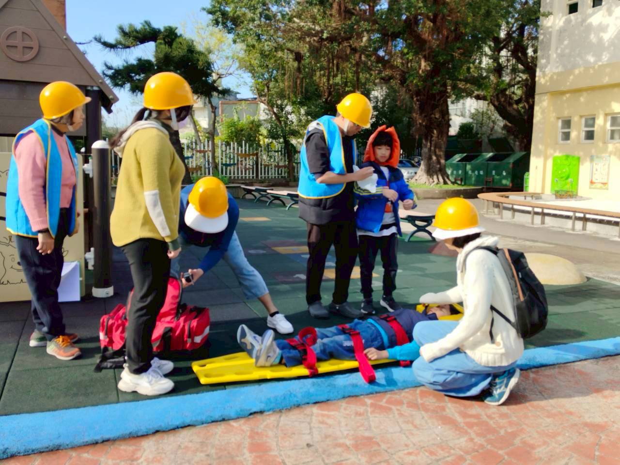 由於演練同步模擬東棟與北棟伸縮縫水泥塊剝落的結構受損狀況,搶救組必須避開危險區域,繞道搜索教室與走廊。最終順利在校舍內尋獲3名學生,其中1名手部受傷,隨即由搶救組以擔架送至急救站,由緊急救護組進行檢傷分類與簡易包紮處置,整體流程順暢到位。