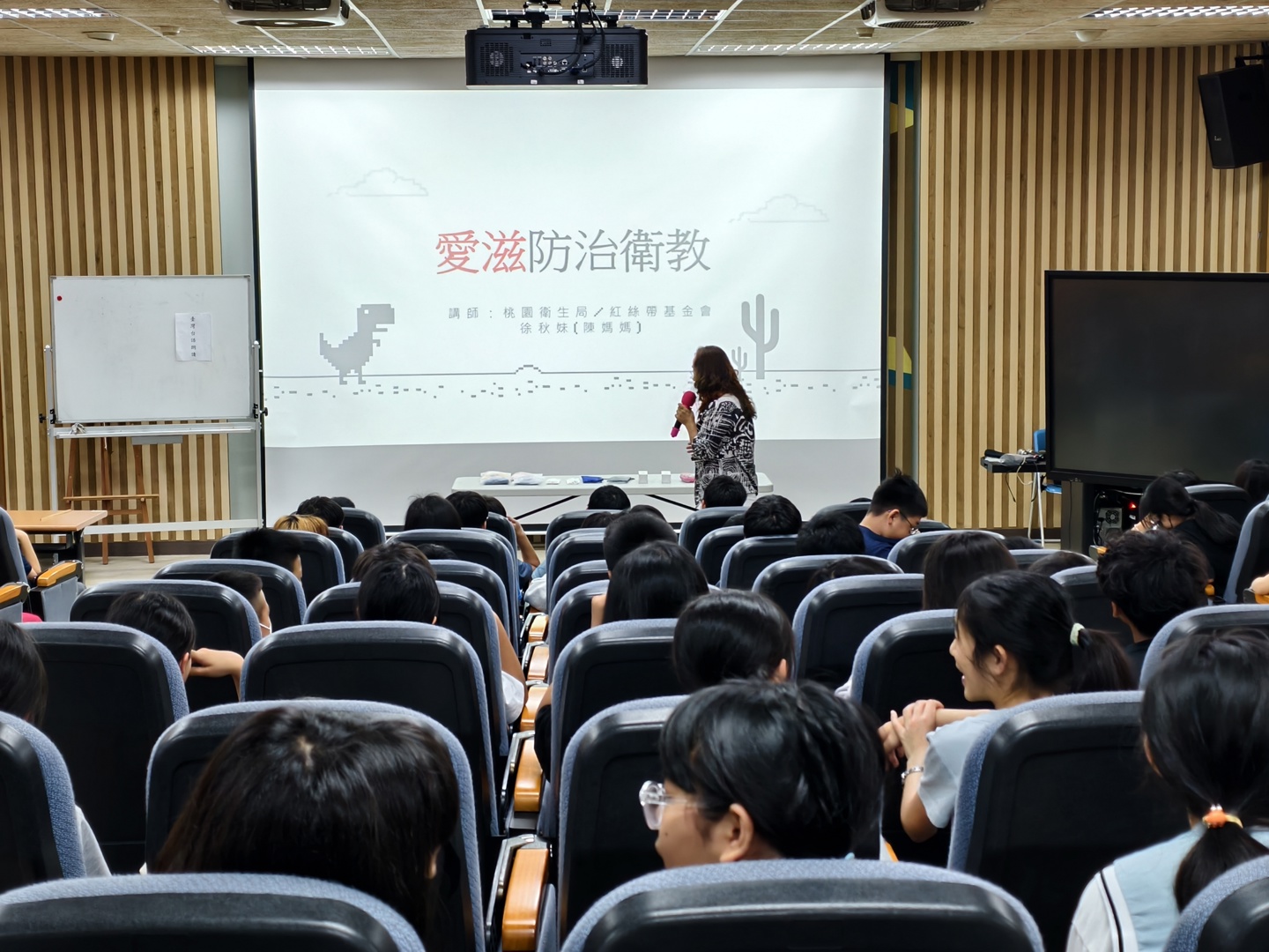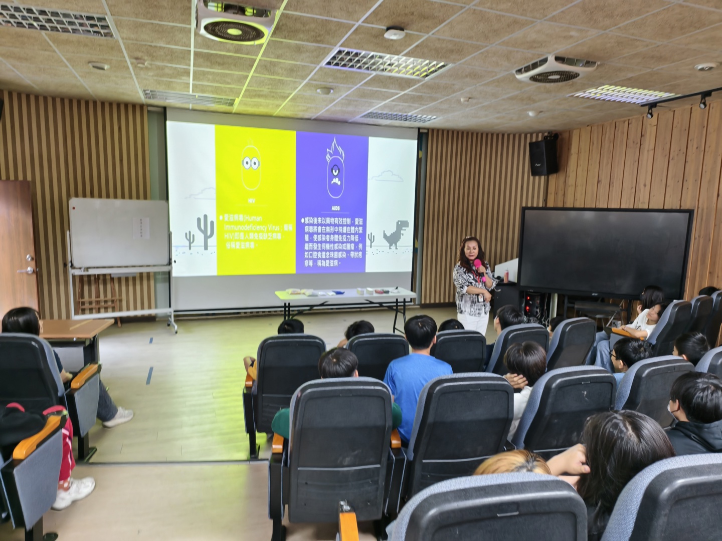 陳媽媽的演講生動活潑,首先運用可愛的插圖帶領學生釐清「愛滋病毒(HIV)」與「愛滋病(AIDS)」的不同,並詳細說明愛滋病毒的三大傳染途徑:不安全性行為、血液傳染及母子垂直感染。為了破除常見的社會迷思,陳媽媽特別強調,愛滋病毒只要離開人體接觸空氣幾乎瞬間死亡,因此日常生活中的牽手、擁抱、共餐、共用馬桶,甚至是蚊蟲叮咬,都「不會」傳染愛滋病毒,呼籲大家不必過度恐慌。