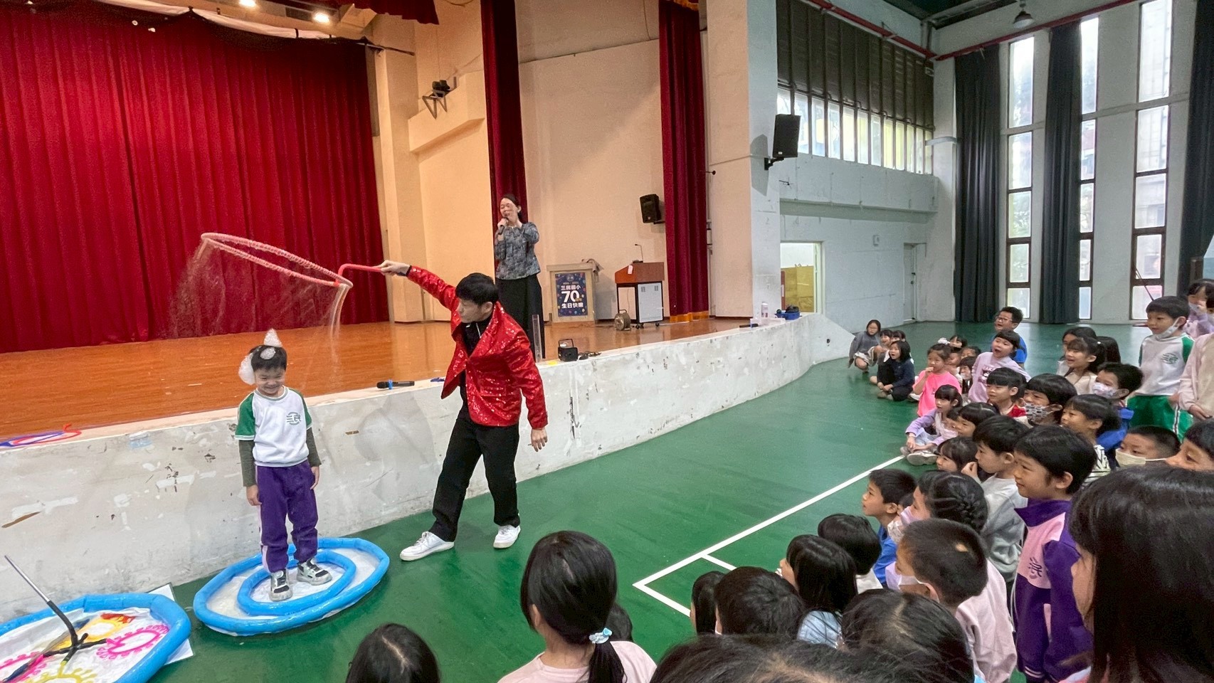 - 人體泡泡:最受歡迎的環節莫過於此,受邀上台的同學站在巨大的泡泡膜中,彷彿穿上了一件透明的魔幻大衣,體驗被泡泡包圍的獨特感受。