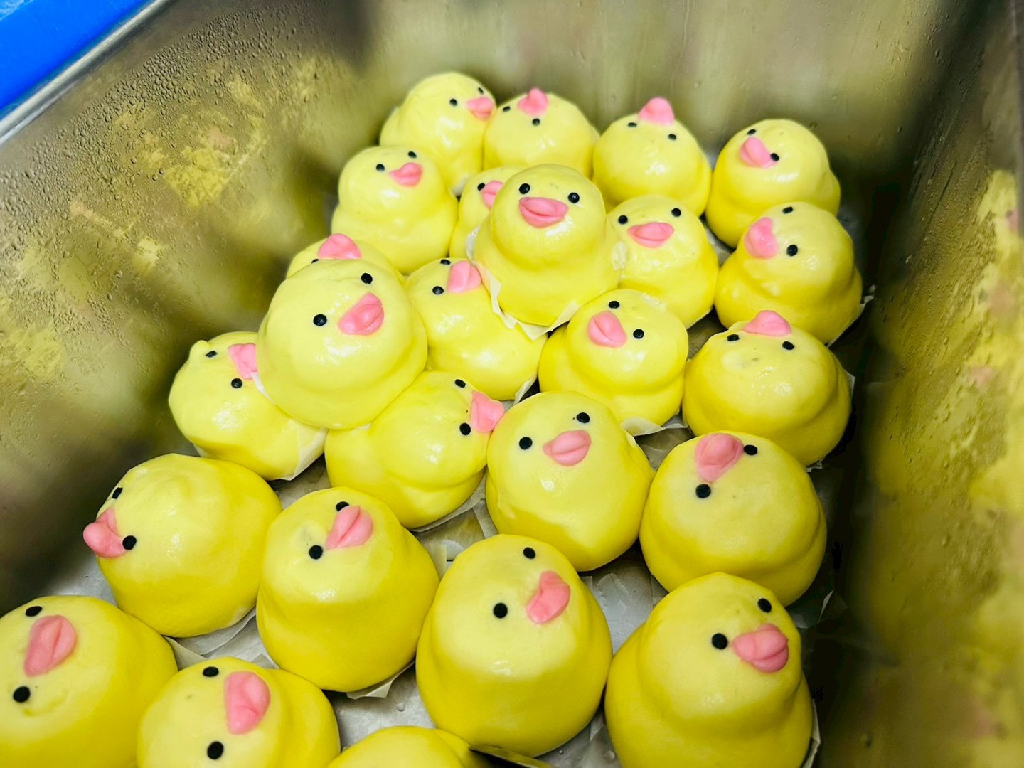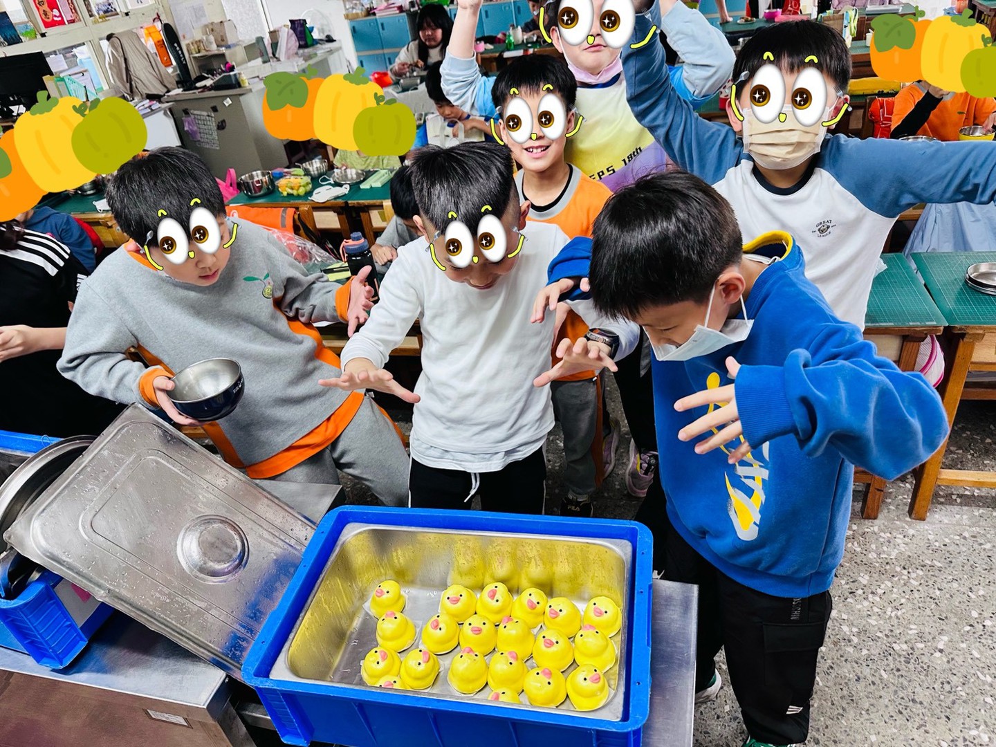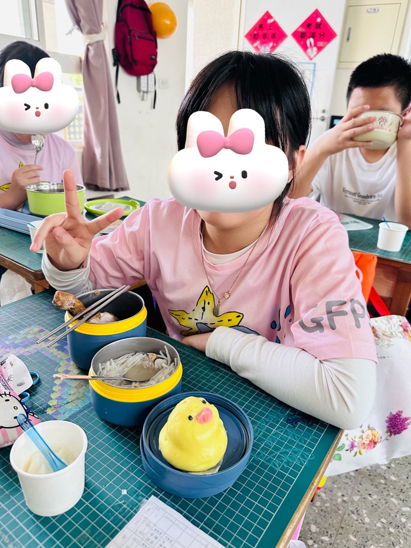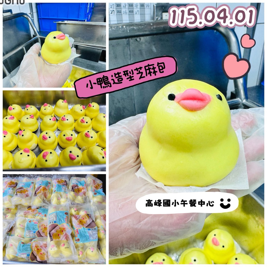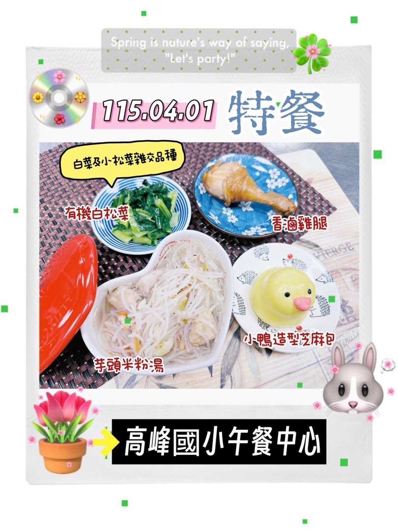 兒童節特餐,香氣濃郁的產銷履歷芋頭米粉湯,提供豐富蛋白質的CAS滷雞腿,小鴨造型的芝麻包,白菜及小松菜雜交品種的有機白松菜,均衡飲食,營養滿分。