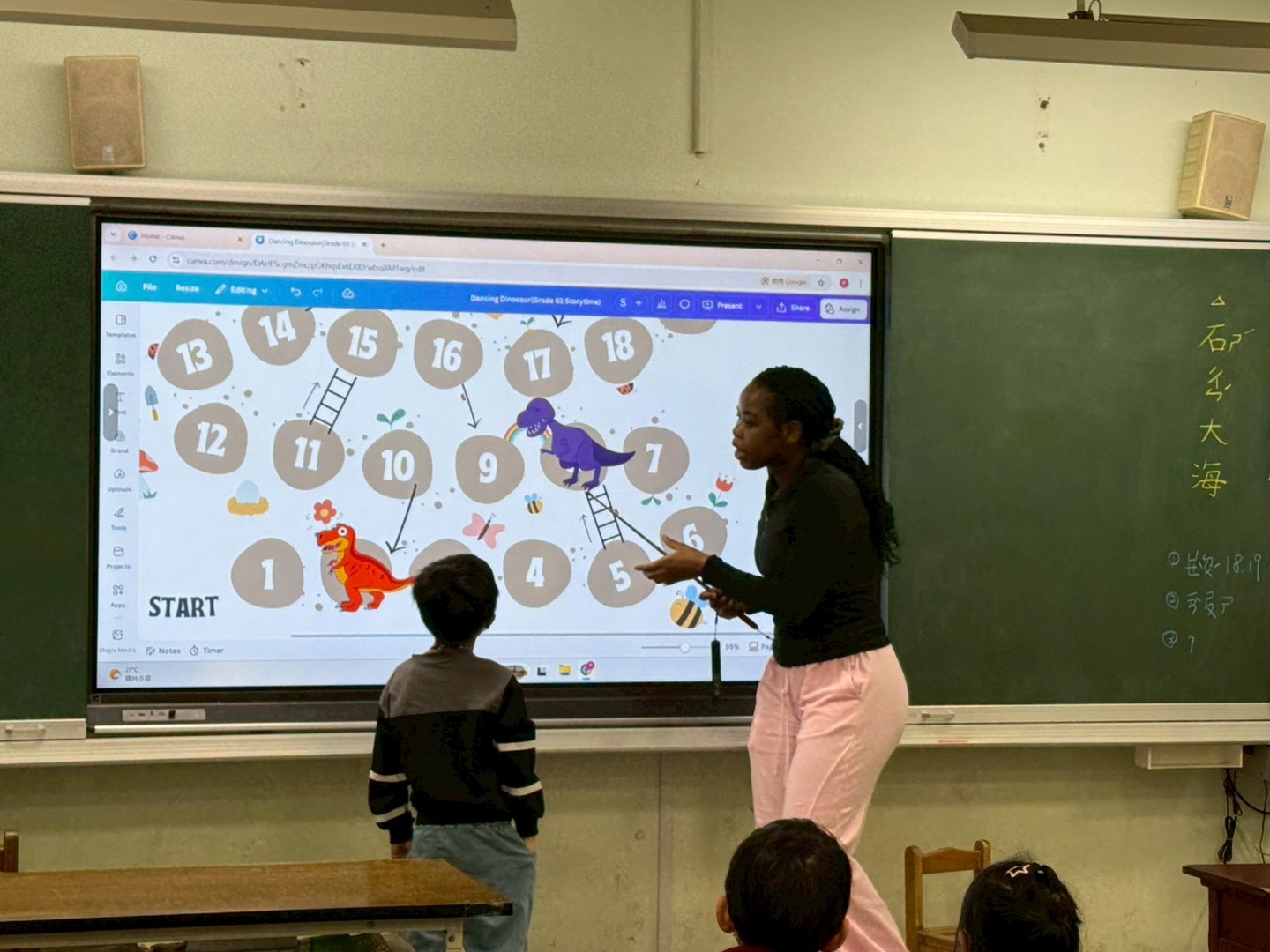 孩子們一邊認識各種恐龍、一邊學顏色,最後直接開啟「恐龍動起來」遊戲模式,全班笑聲+動作同步爆發![]()