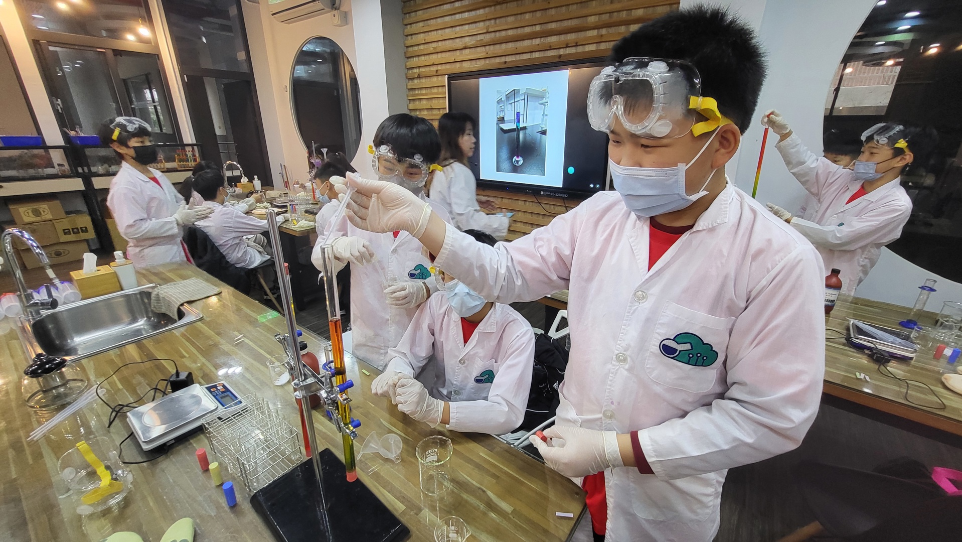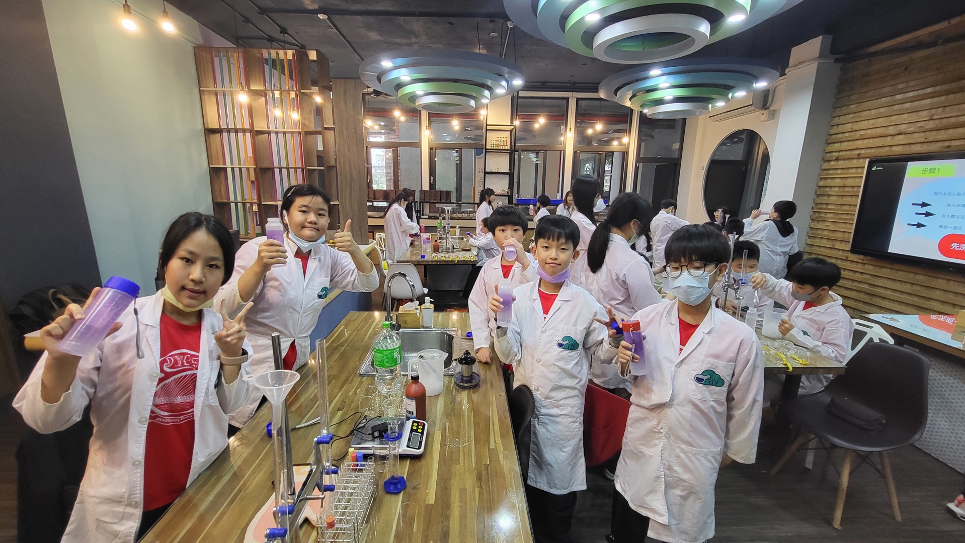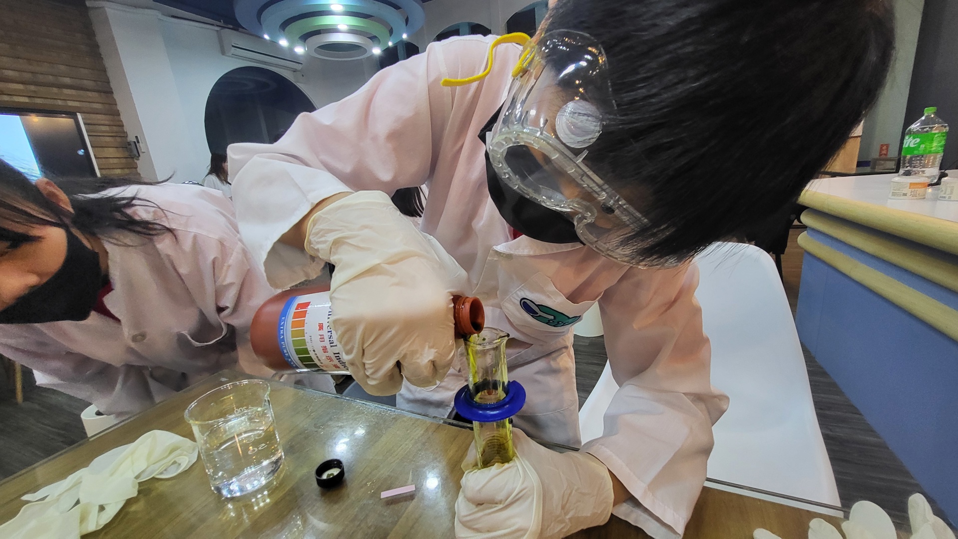 在實驗課程中,學生首先進行「酸鹼彩虹玻璃管」操作,透過加入食鹽、氫氧化鈉與醋酸等試劑,觀察不同溶液在酸鹼變化下所呈現的顏色層次。繽紛的色彩變化不僅吸引目光,也讓學生理解酸鹼指示劑的原理,提升學習興趣。