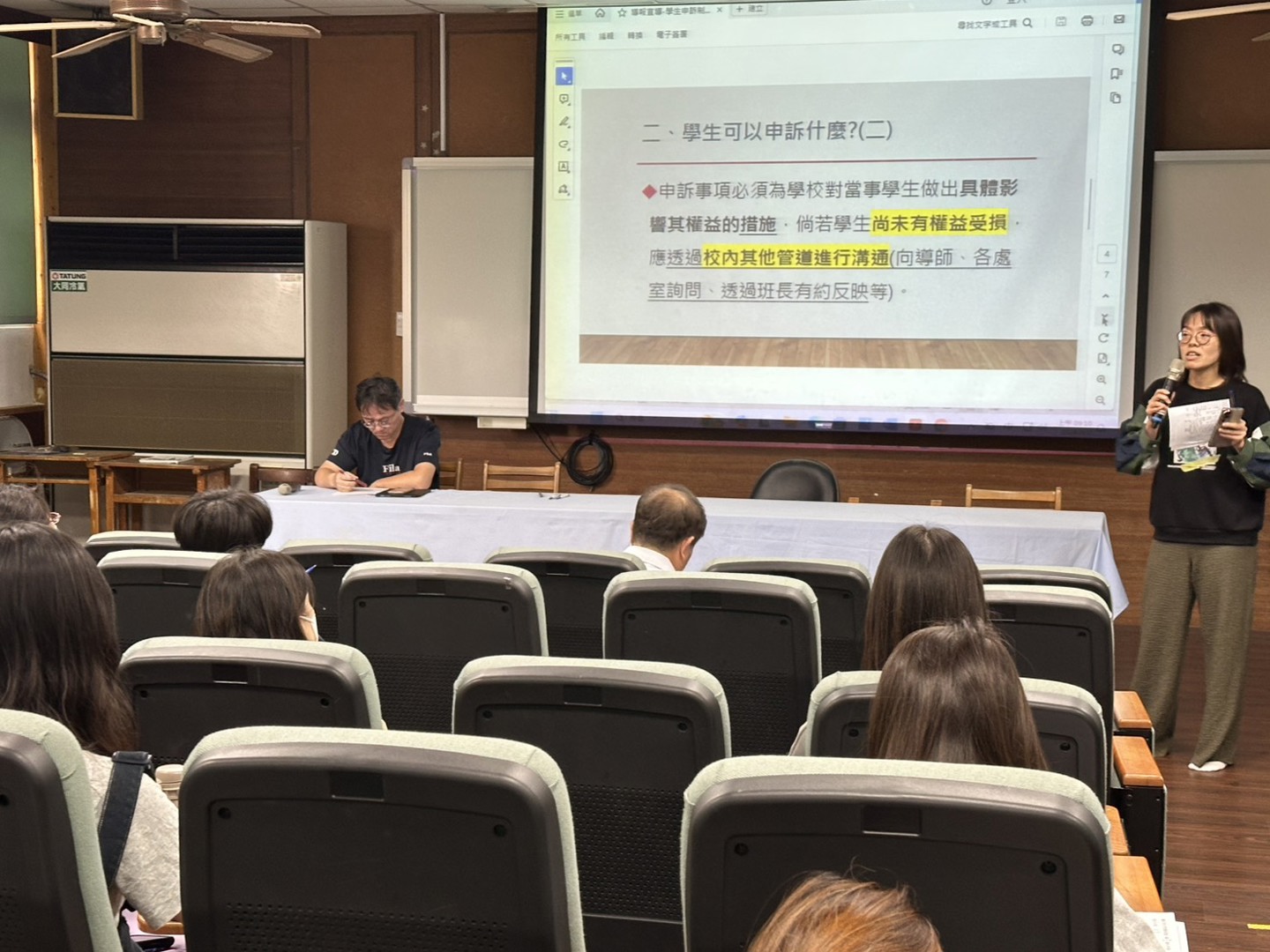 為強化校園民主素養與學生權益保障,本校輔導處辦理「學生申訴與再申訴制度」全校導師宣導研習。由輔導主任說明相關制度之設立精神,並針對申訴與再申訴之流程、適用對象及受理範圍進行清楚解析,協助導師釐清學生申訴之內涵與實務操作。
