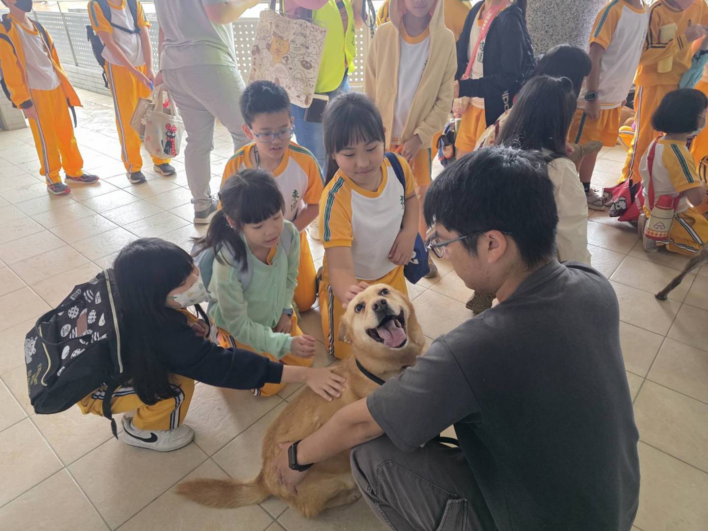 在獸醫王醫師、Apple 志工老師及多位志工的專業引導下,孩子們學習了與犬隻互動的正確禮儀。志工提醒:「想交朋友,要先蹲下來,讓狗狗聞聞你的拳頭。」這簡單的動作教會了孩子「同理心」——在親近之前,先給予生命足夠的安全感。