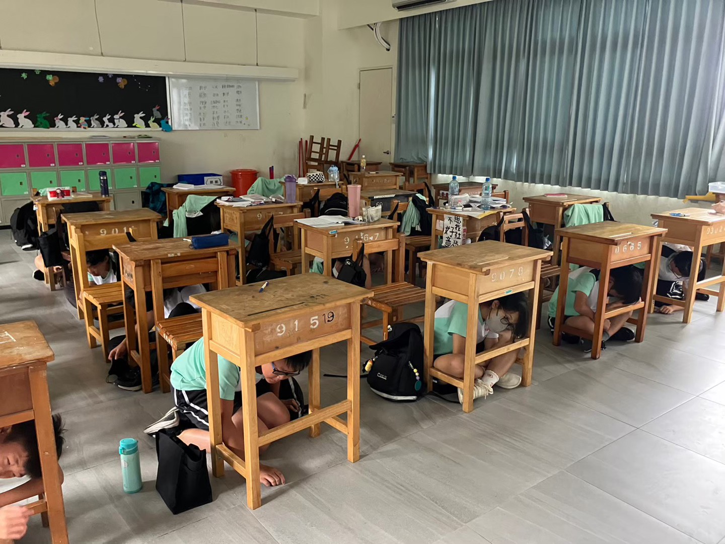 模擬地震發生時,師生落實「趴下、掩護、穩住」三步驟。
