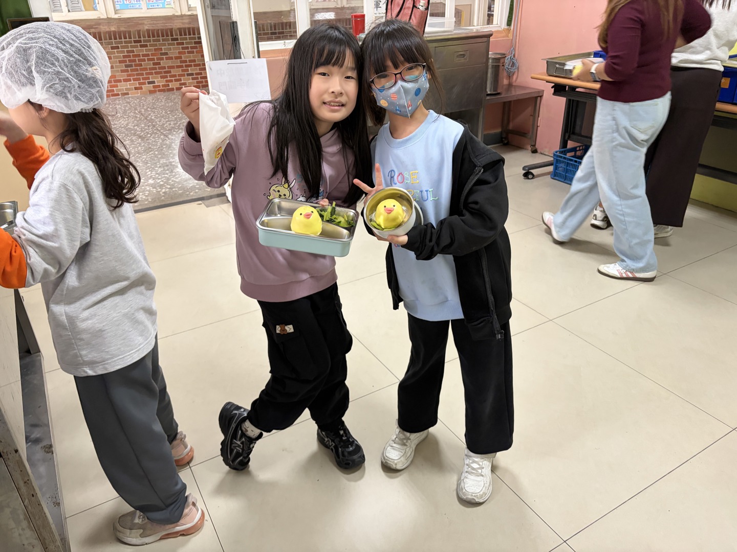 除了玩得開心,學校在飲食上也展現巧思。午餐時間,學校餐廳特別推出了節日特餐,其中最引人注目的莫過於手工製作的「小鴨造型芝麻包」。可愛逗趣的黃色小鴨造型讓孩子們驚呼連連,紛紛拿起餐具與這份萌度破表的點心合影。香甜的芝麻內餡配上討喜的外觀,不僅填飽了胃,更療癒了大家的心。