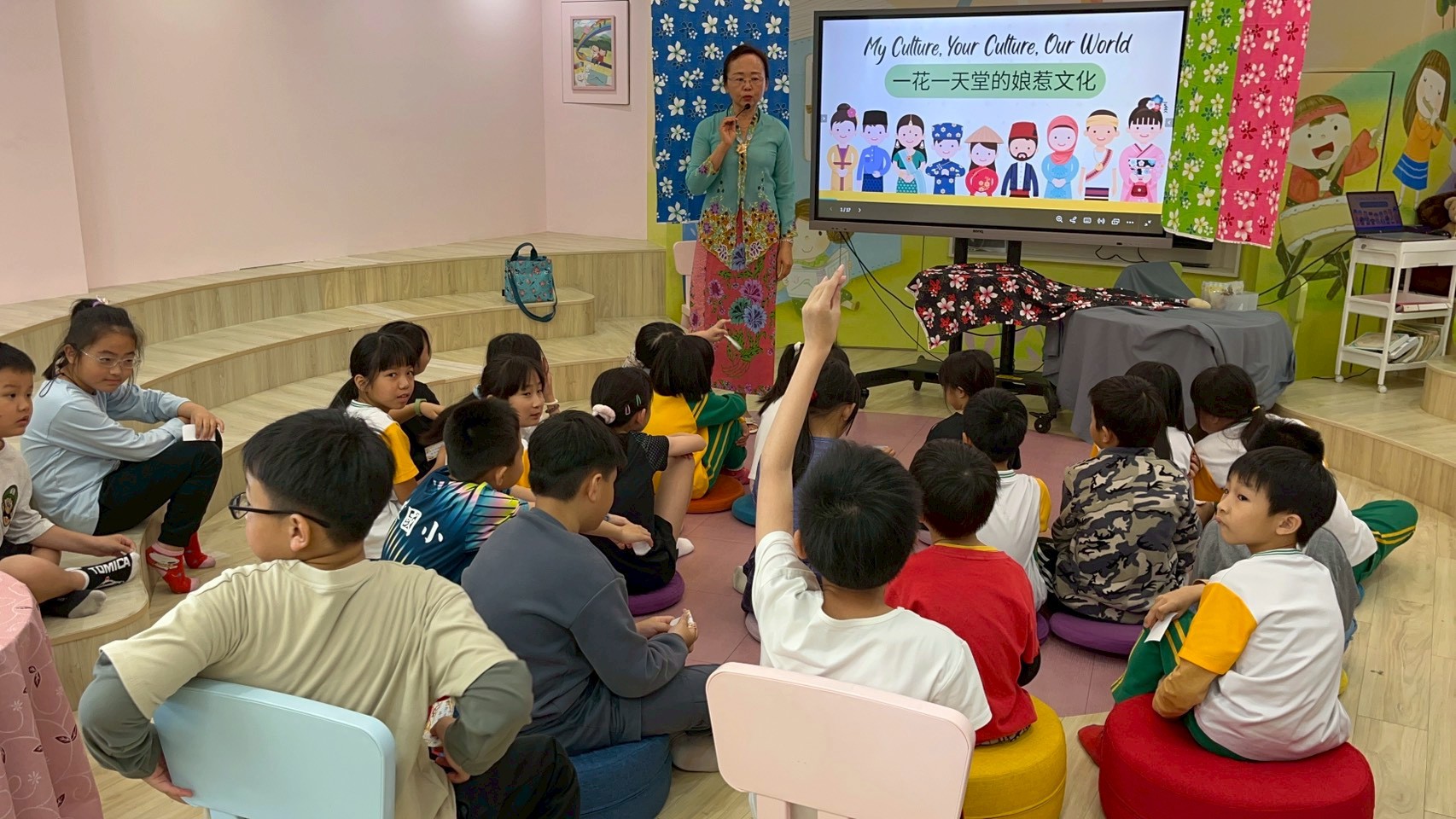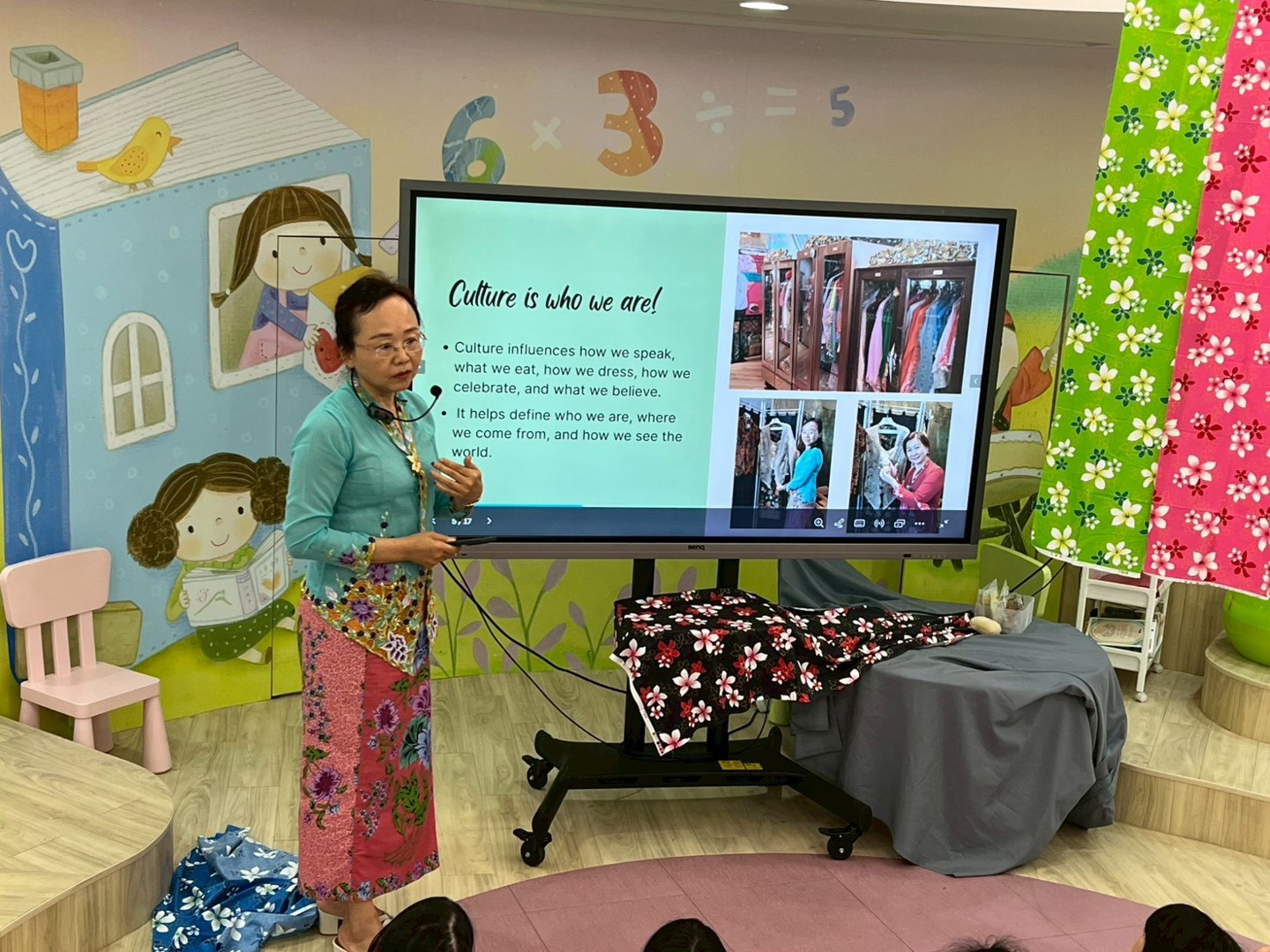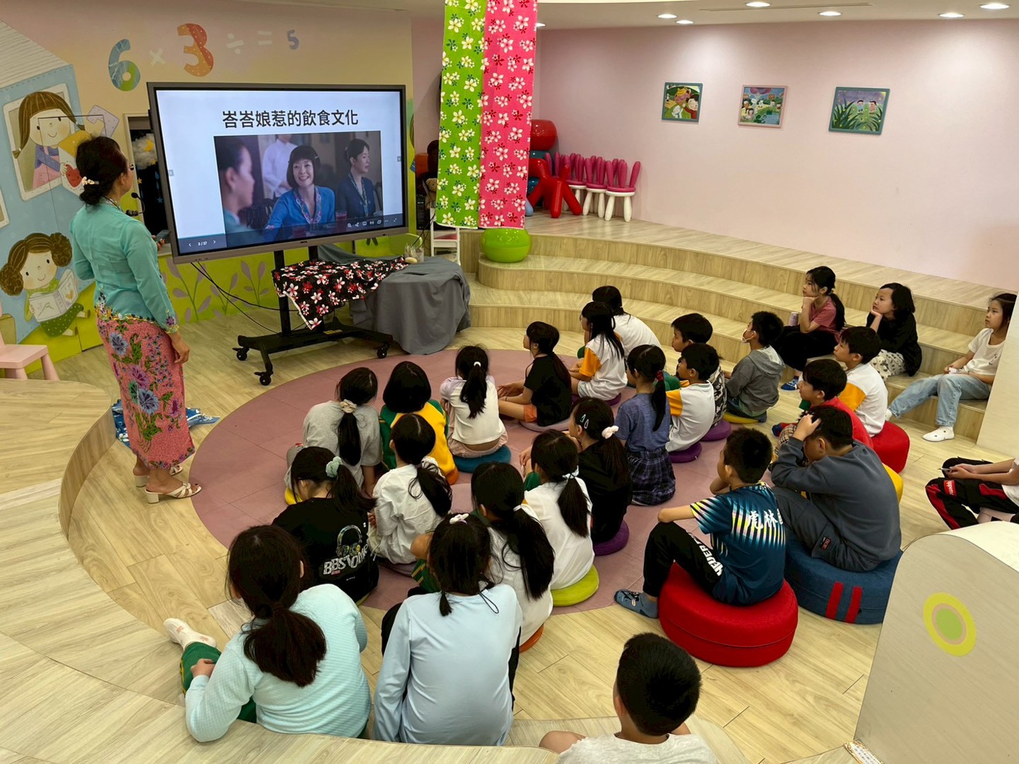 當天,慧珍老師特別身著華麗的傳統娘惹服裝現身,驚豔全場!色彩鮮豔、繡工精緻的服飾,瞬間將孩子們帶進了那個融合中華文化與南洋風情的神秘世界。慧珍老師娓娓道來娘惹文化的由來與精髓——從細膩華麗的服飾、香氣四溢的飲食,到充滿南洋色彩的傳統建築,每一個細節都令孩子們目不轉睛、嘖嘖稱奇。