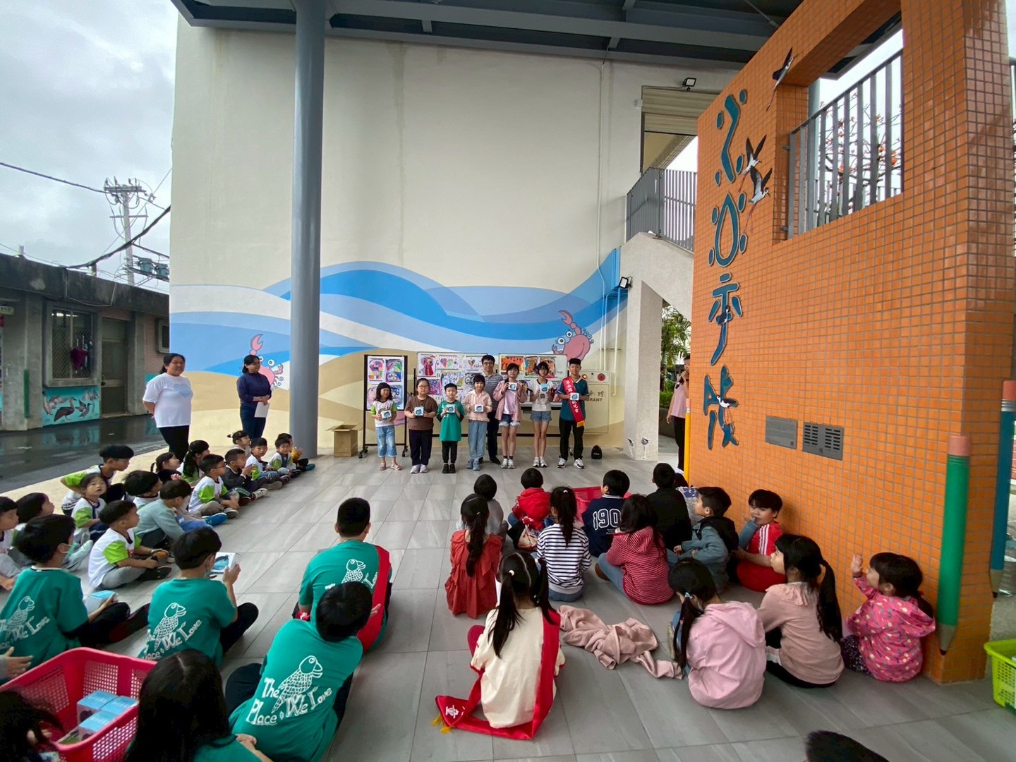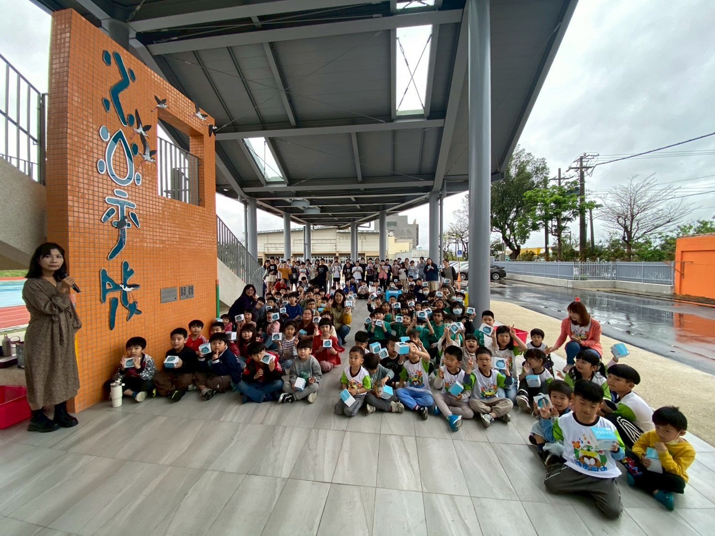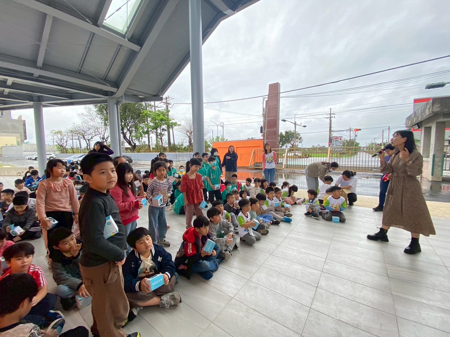 115.04.01 課間活動時段,港南全校學童齊聚前庭鋼棚區。