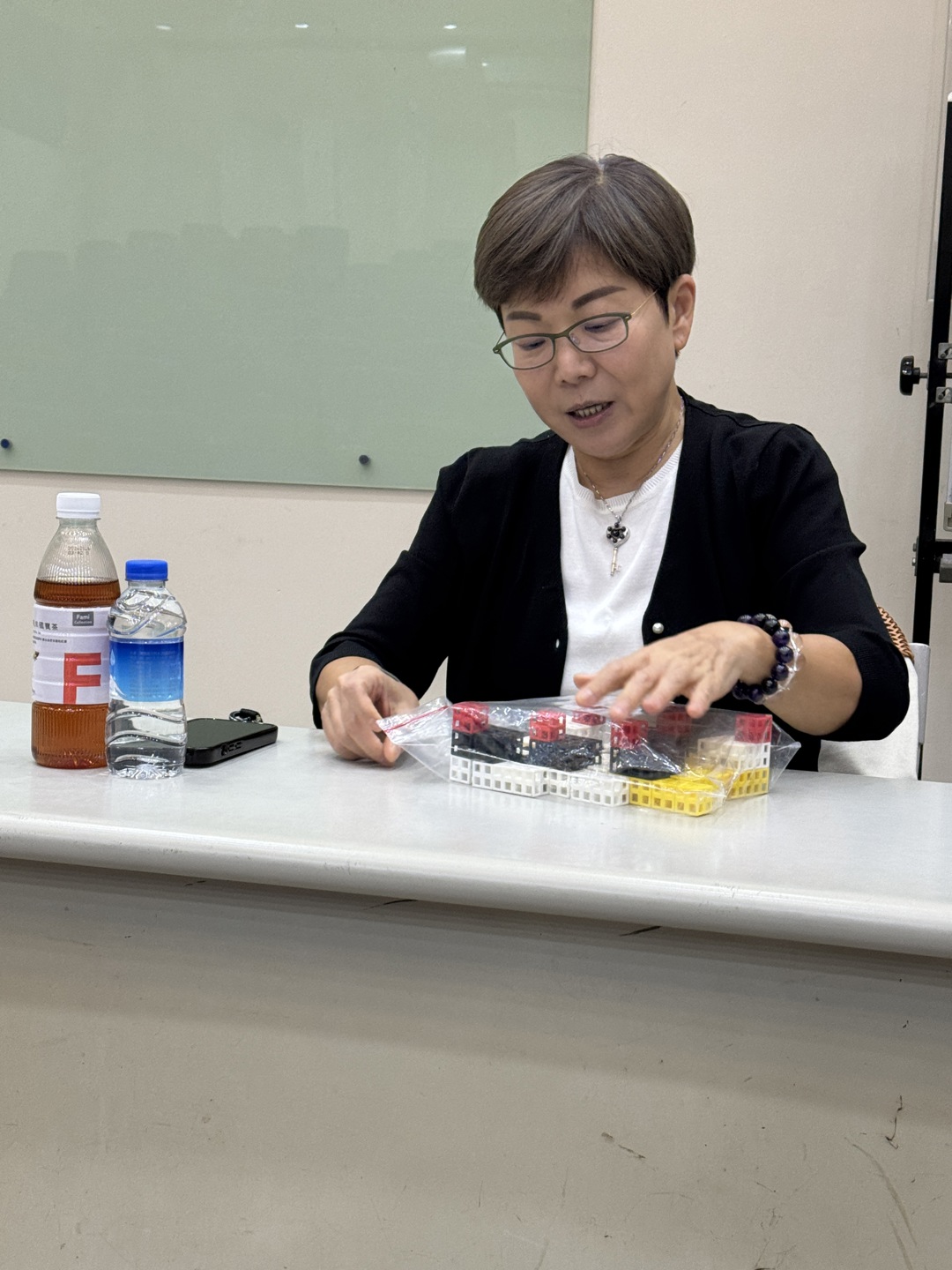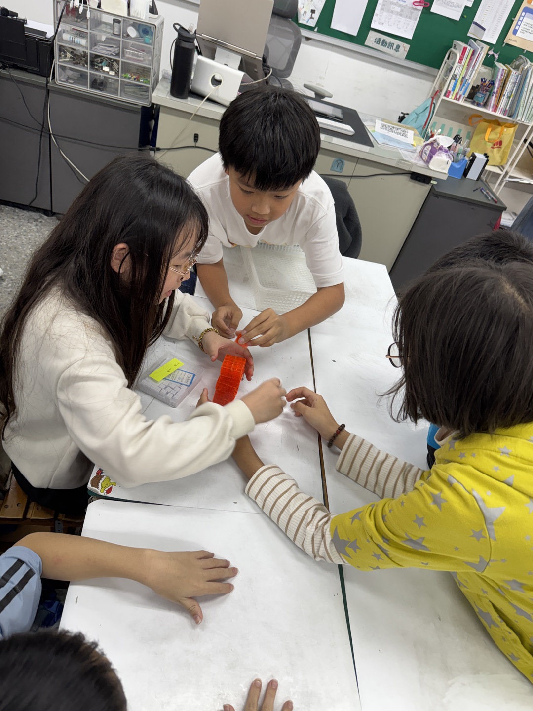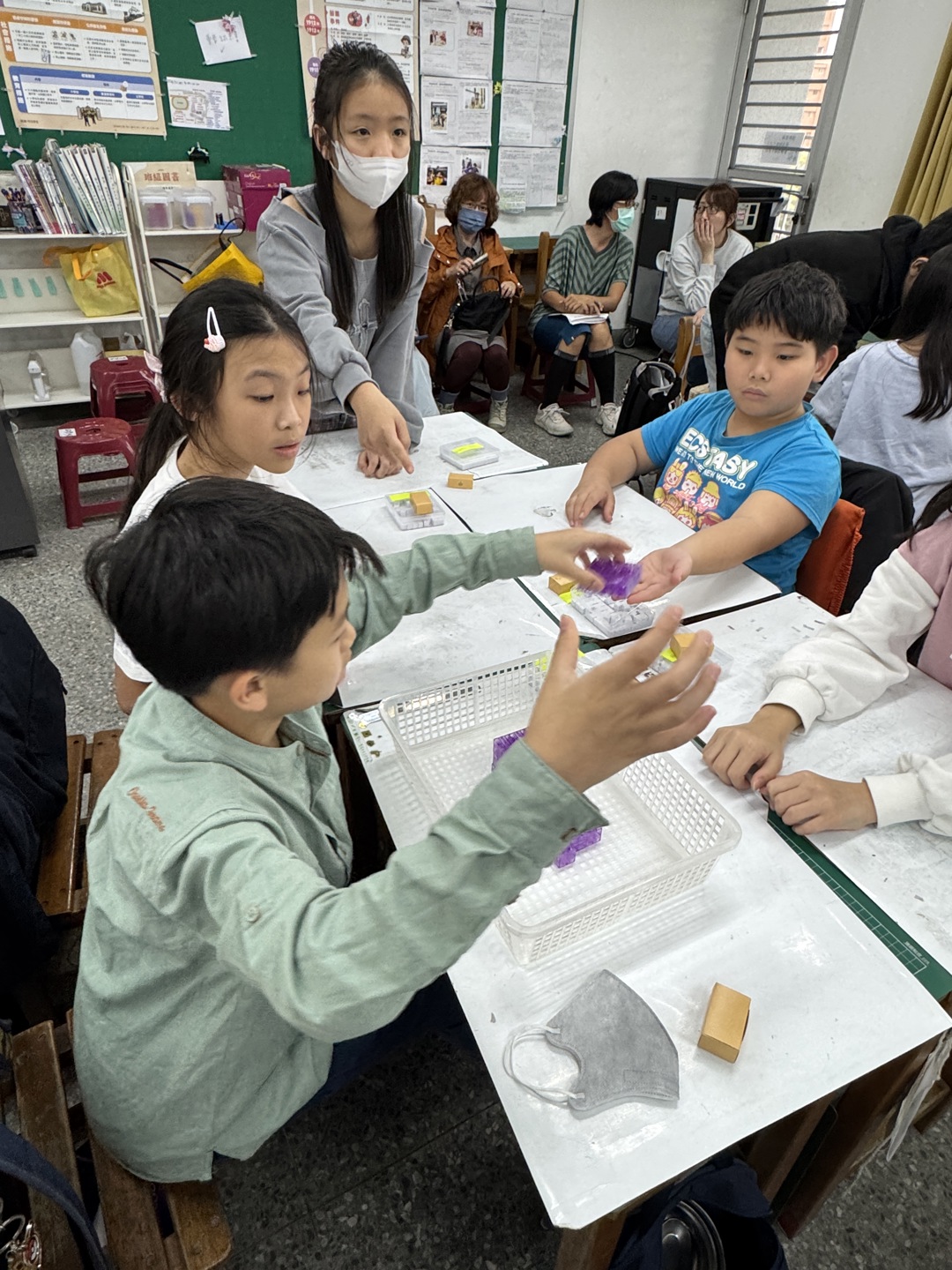 房老師運用教具,透過堆疊示範長方體體積的計算方式,引導學生實際操作與觀察,讓抽象概念具體化。課後的議課交流中,參與老師分享課堂觀察,並從房老師身上獲得教學策略調整的啟發。