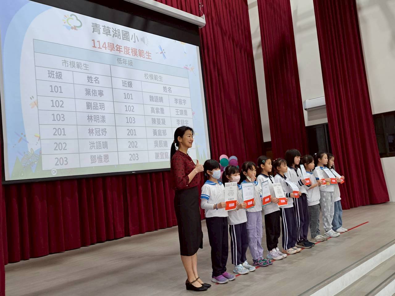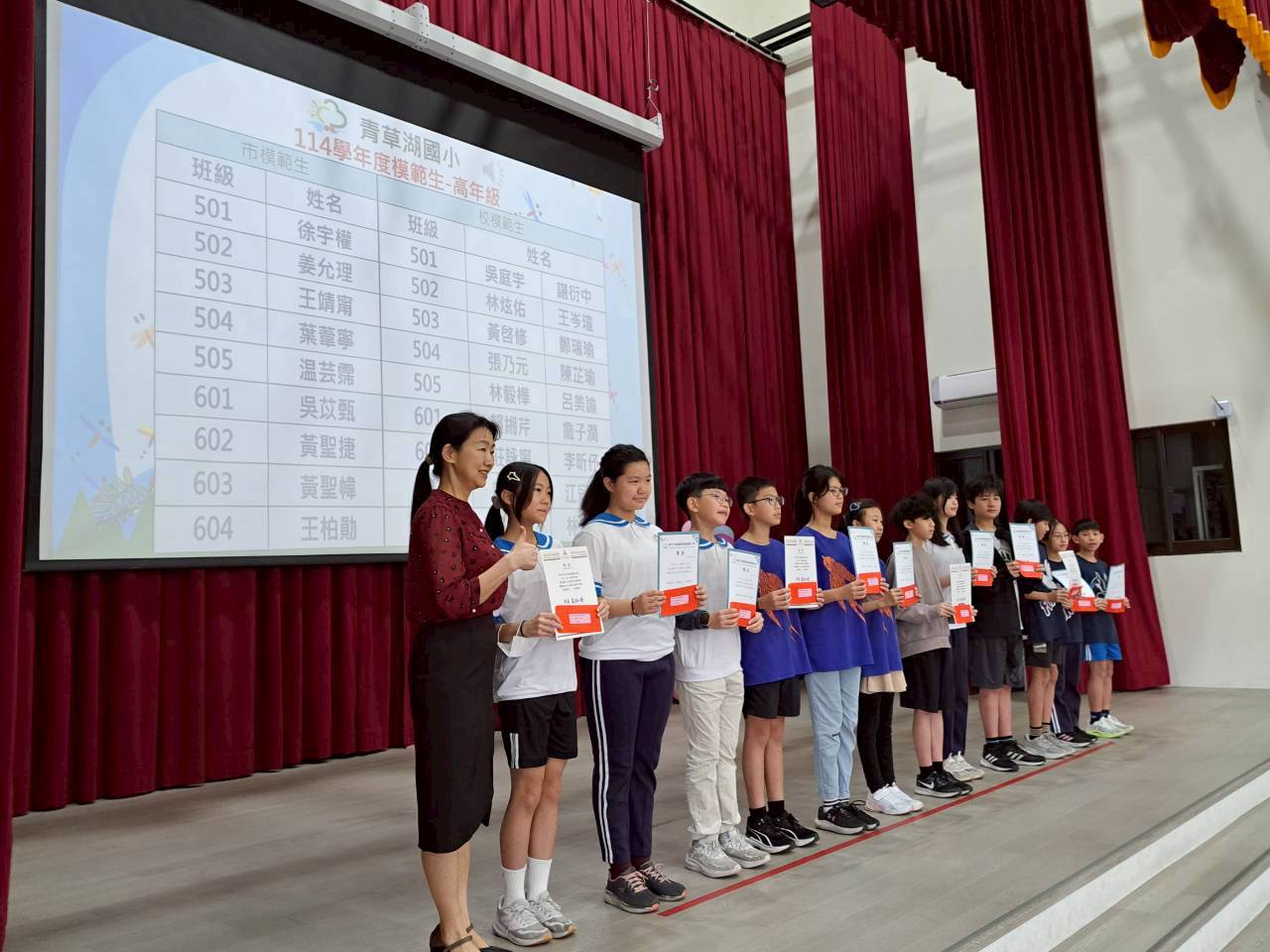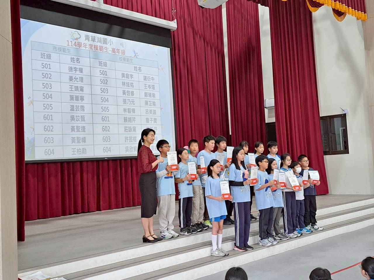青草湖國小於115年3月30日(星期一)利用兒童朝會時間,舉行「114學年度模範兒童頒獎與表揚」活動,公開肯定學生在各方面的優異表現,並樹立良好典範,激勵全體學生向上學習。