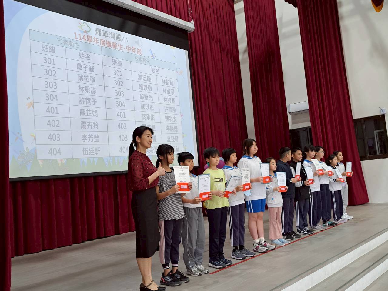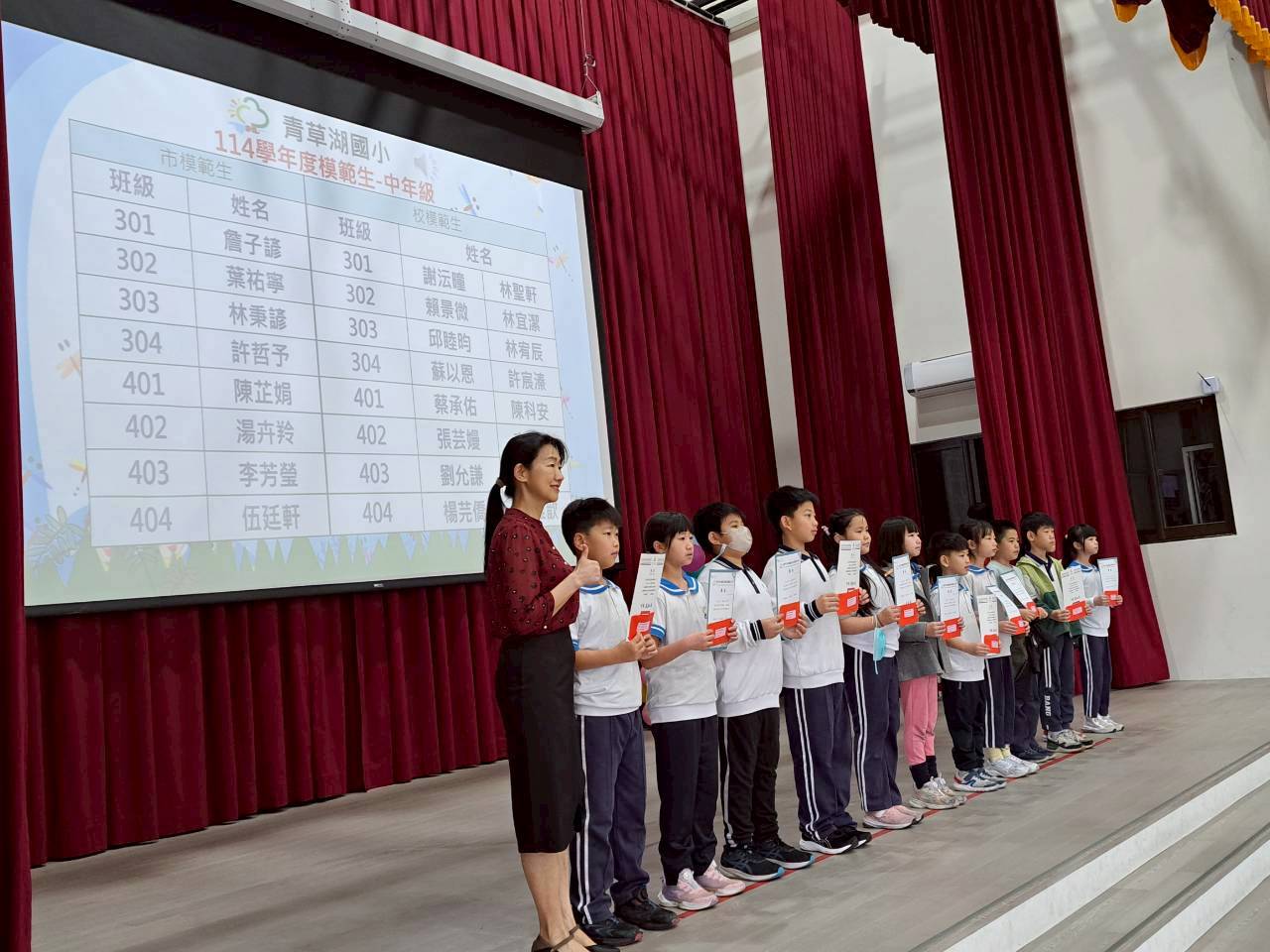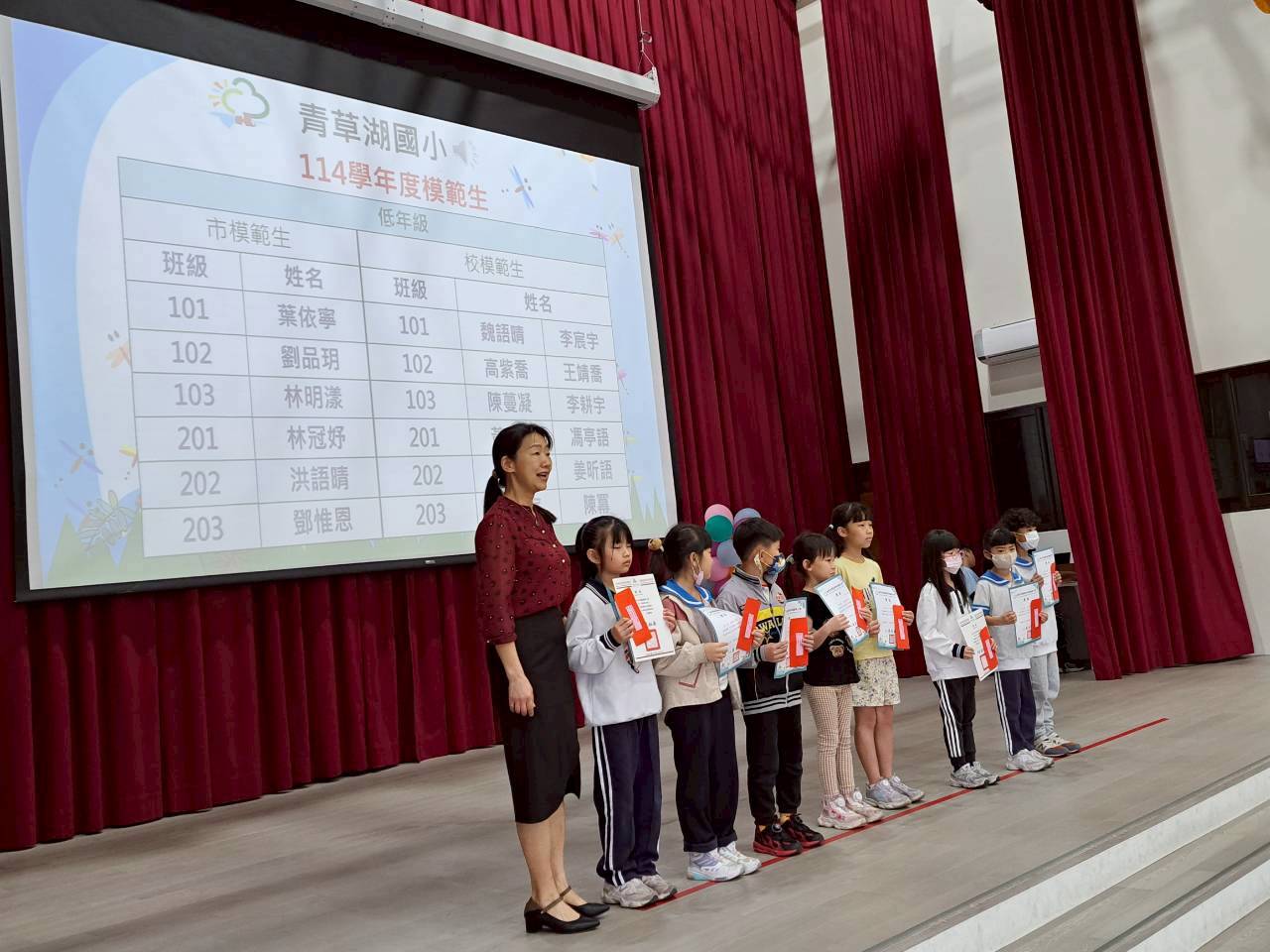 青草湖國小於115年3月30日(星期一)利用兒童朝會時間,舉行「114學年度模範兒童頒獎與表揚」活動,公開肯定學生在各方面的優異表現,並樹立良好典範,激勵全體學生向上學習。