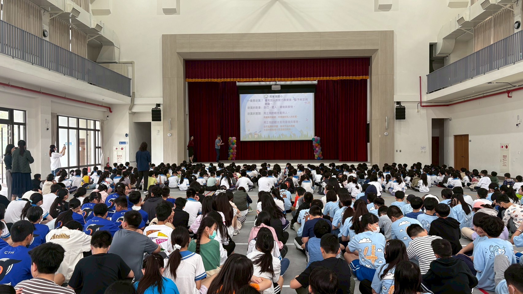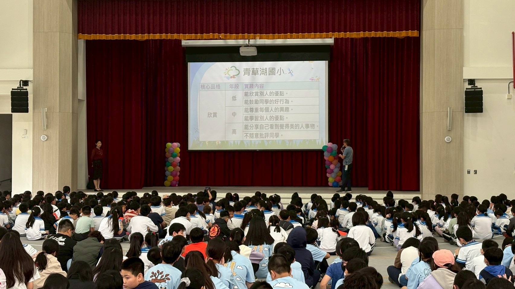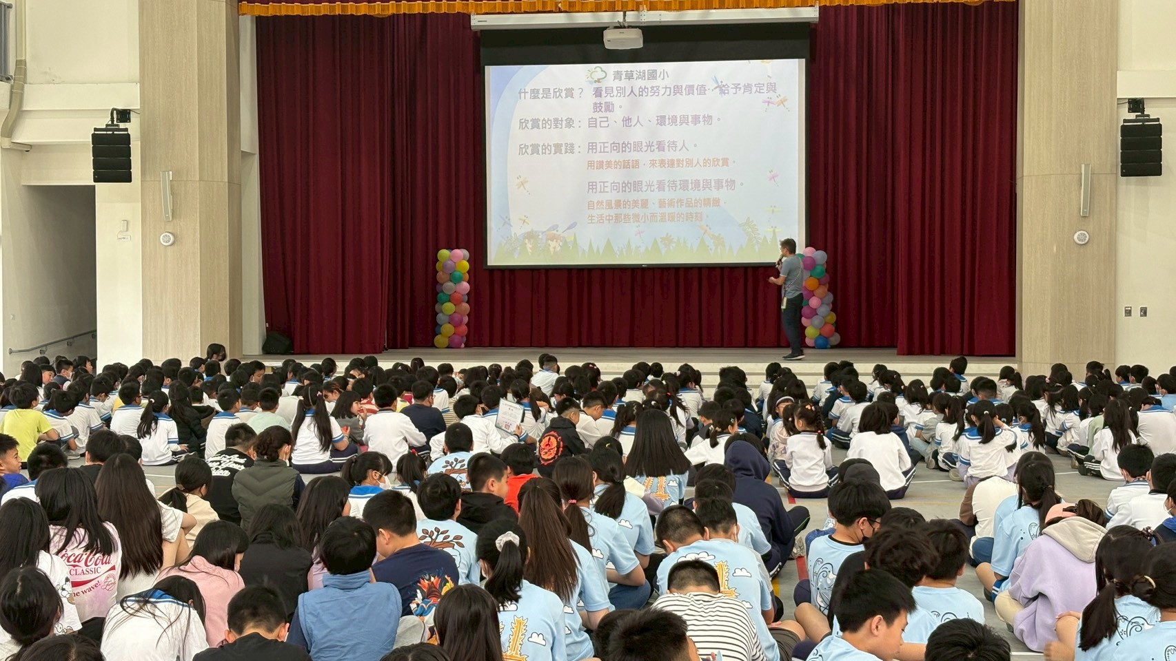 青草湖國小於115年3月30日(星期一)利用兒童朝會時間,進行品德教育宣導活動,持續推動學生良好品格的培養。此次宣導聚焦於115年4月份核心品德「欣賞」,引導學生學習以正向眼光看待自己與周遭世界。