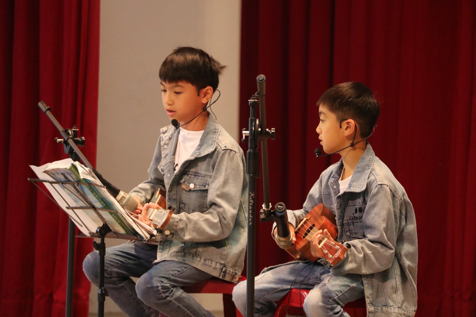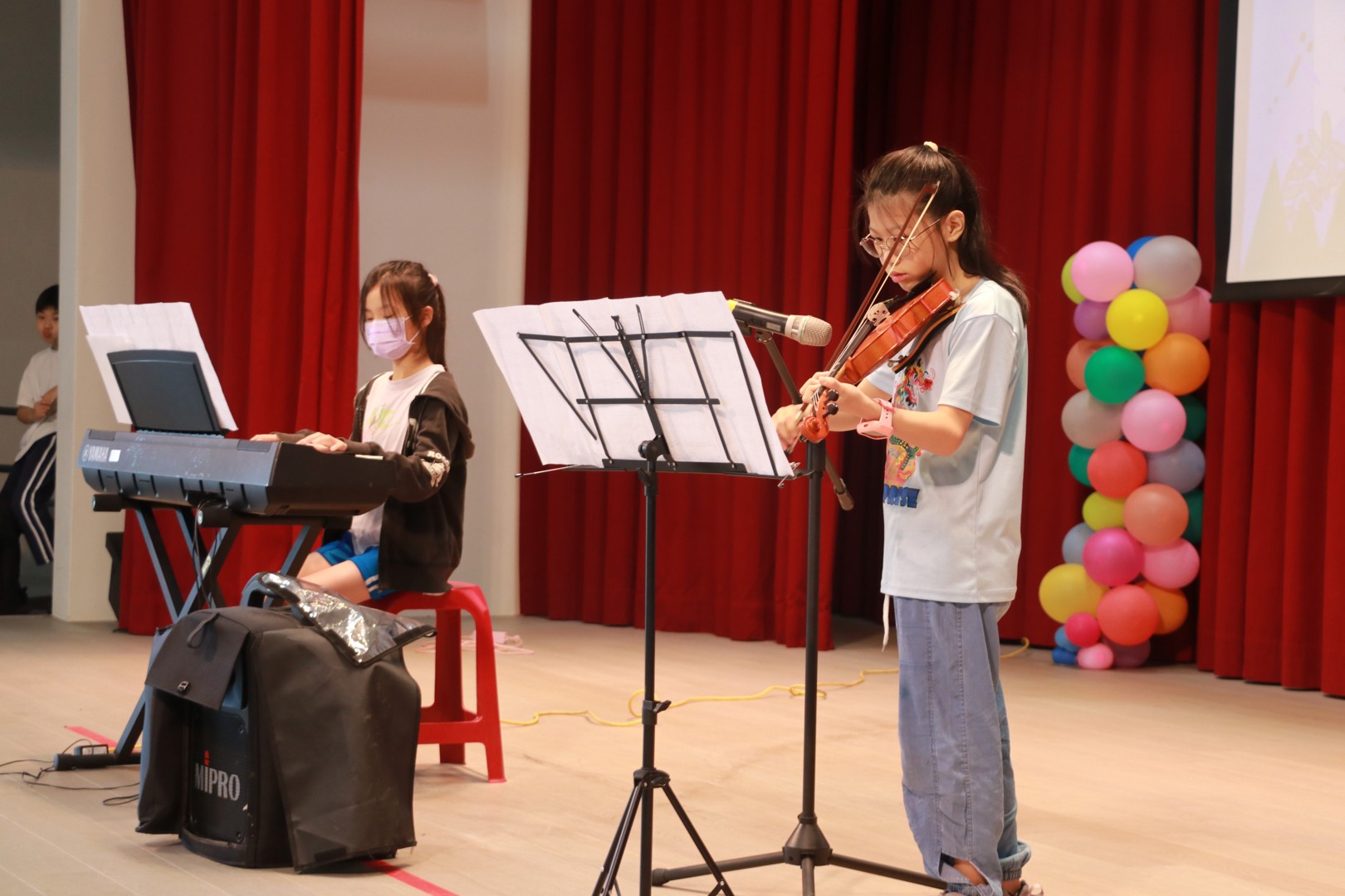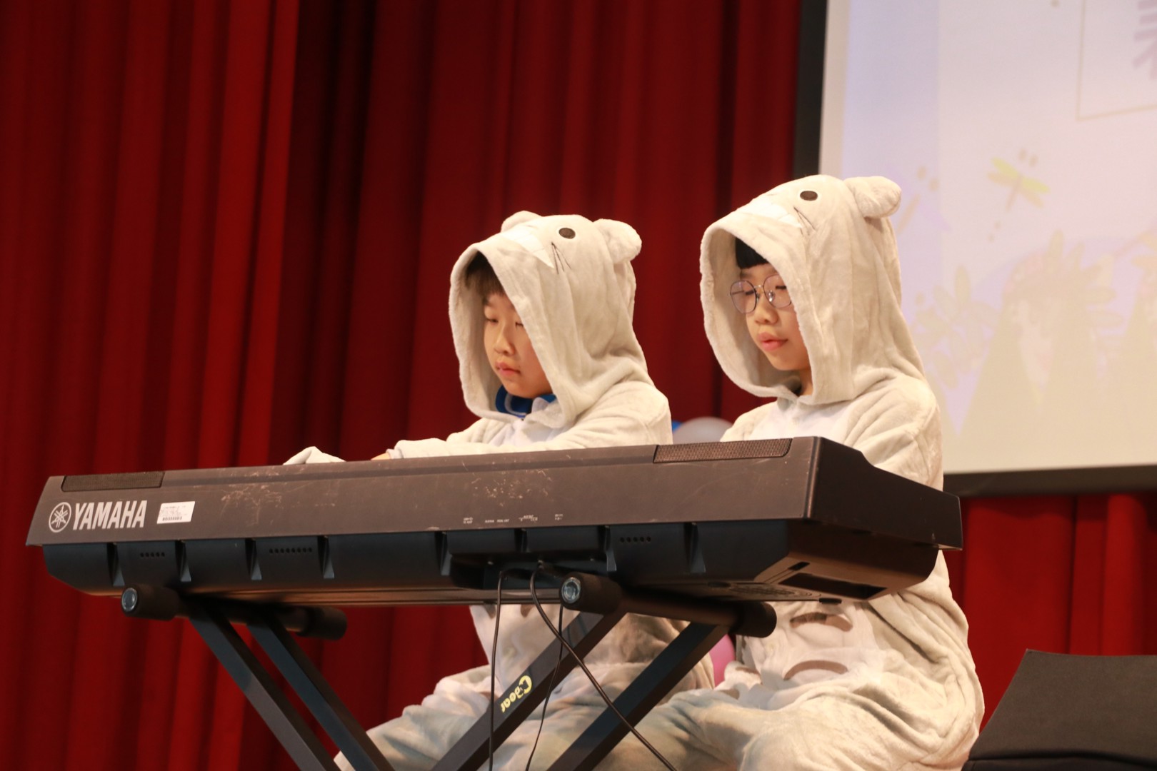 本次演出內容多元豐富,包括鋼琴四手聯彈、鋼琴與小提琴二重奏、烏克麗麗彈唱、男子二重唱、跆拳道三姊弟演出、熱舞表演、扯鈴、韻律體操及太鼓等,每一組皆使出渾身解數,贏得現場熱烈掌聲。此外,學校也同步進行現場直播,讓無法到場的家長能在線上欣賞孩子們的精采表現,共同分享喜悅。