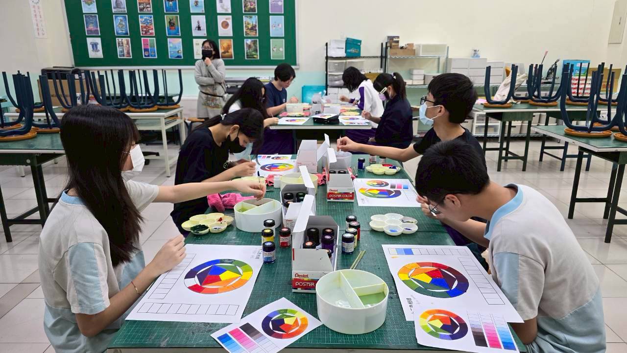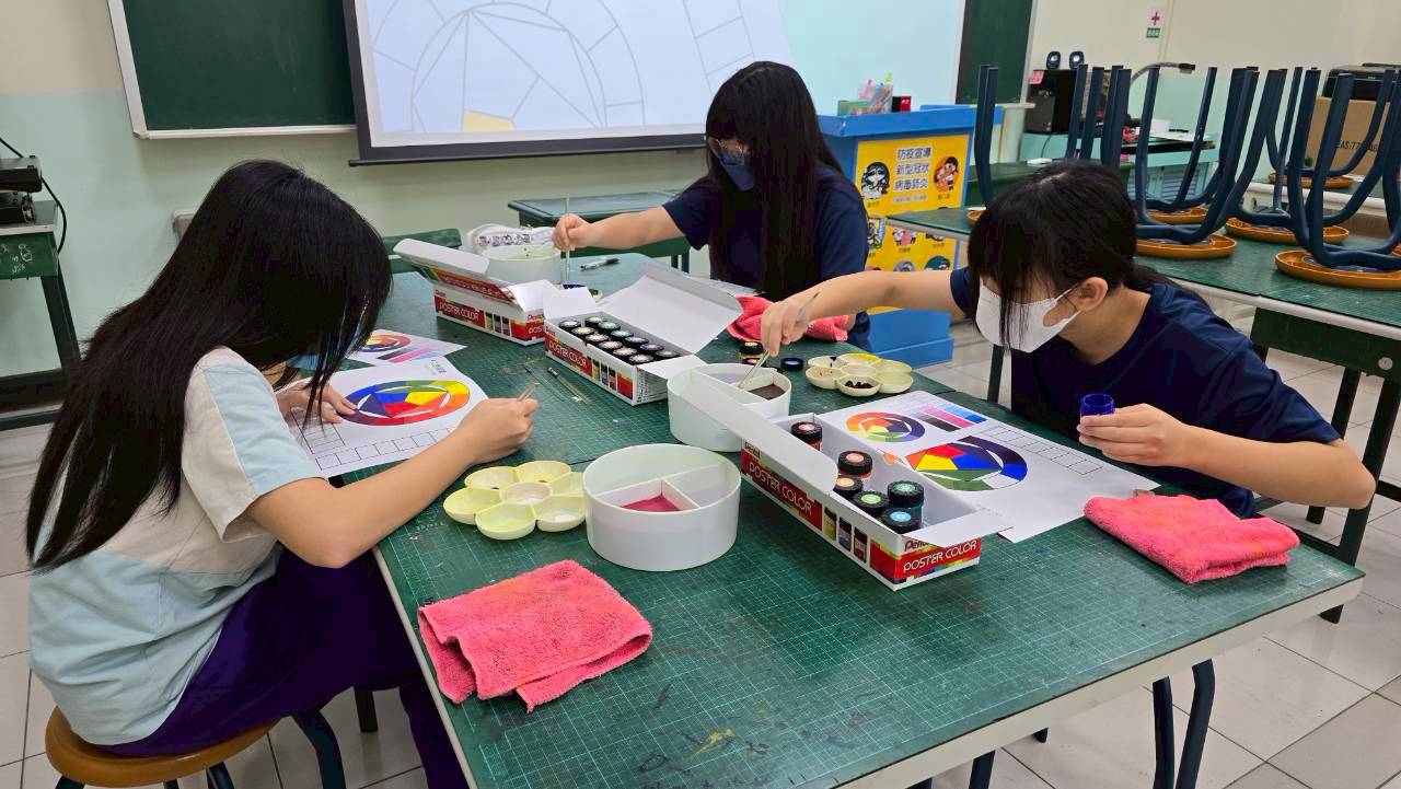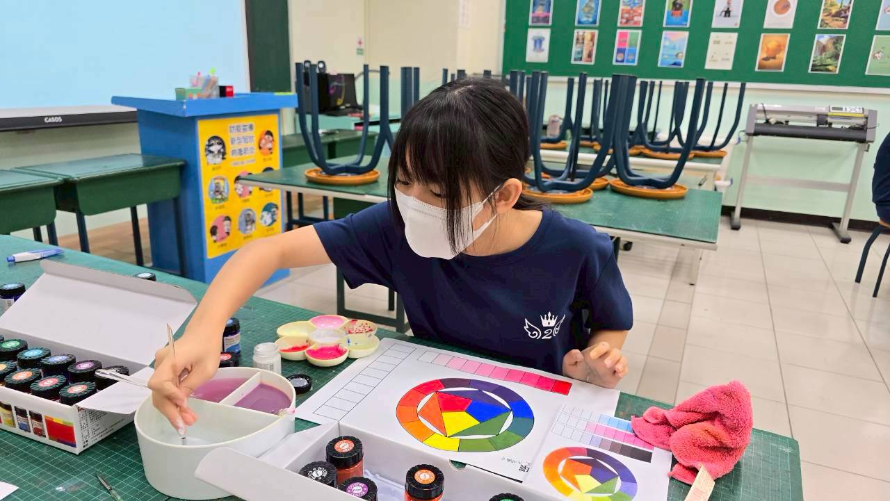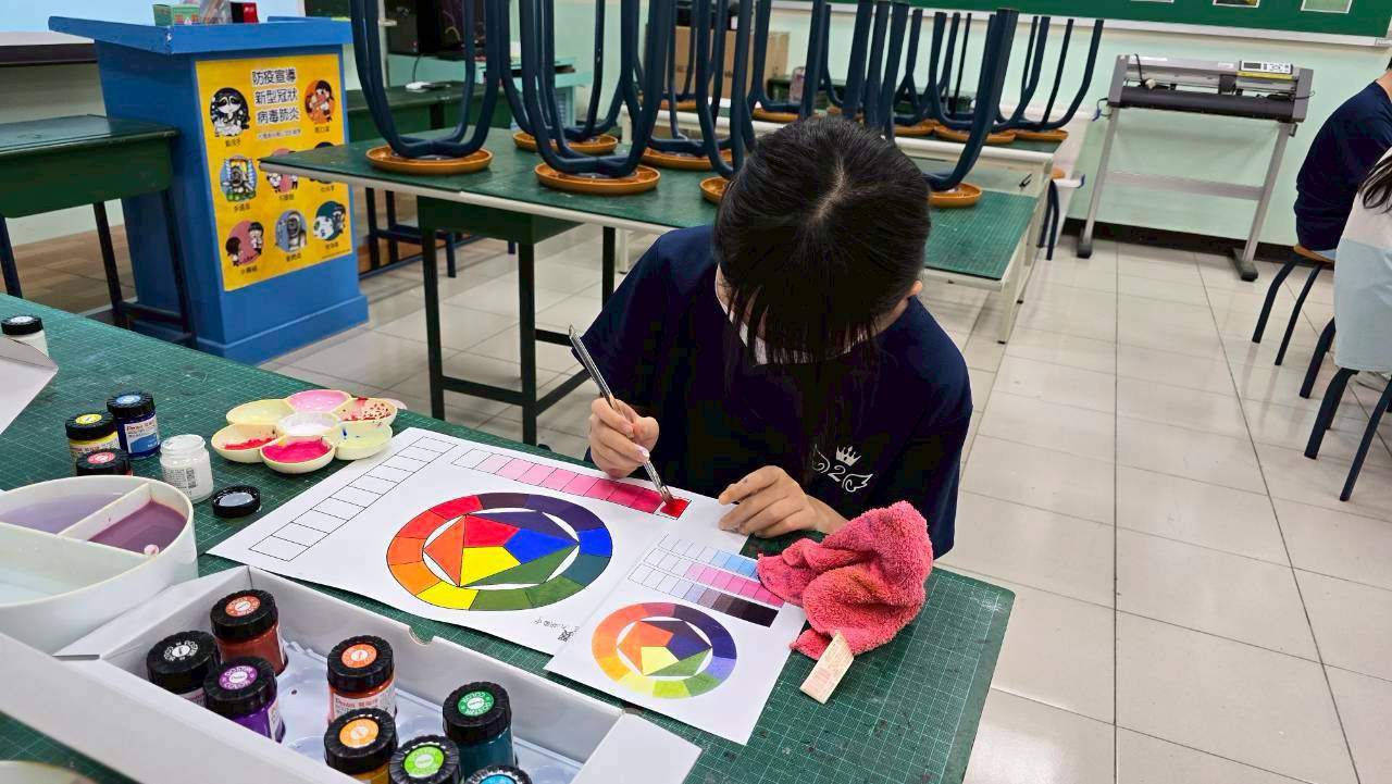 今日課程學生們學習漸層技法,將顏色由淺至深平塗在指定的格子裡,並做二色比較,慢慢將色調加深做變化。
