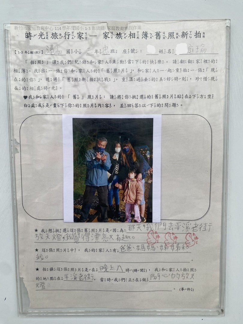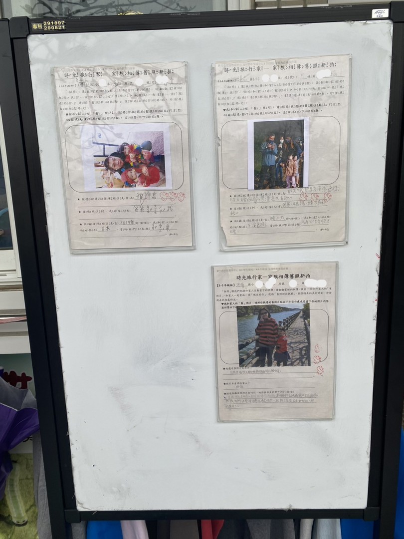 近期在學務處走廊上張貼了數張 115年度家庭教育寒假作業-時光旅行家-家族相簿舊照新拍的優秀作品。靜怡主任將作品張貼在走廊,讓走廊化身為「校園美術館」,讓路過的親師生都能參與這場時光旅行,營造共融的校園氛圍。