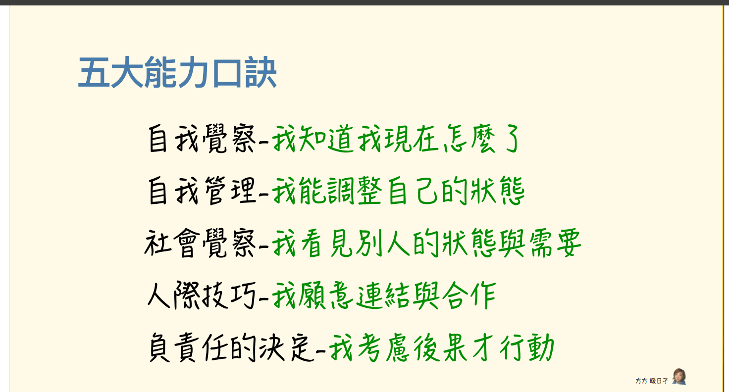 藉由五大能力口訣,教師們期許教導孩子看見自己,透過培養覺察力、同理心和懂得與他人相處的技巧,建立正向的人際關係和情緒管理能力。