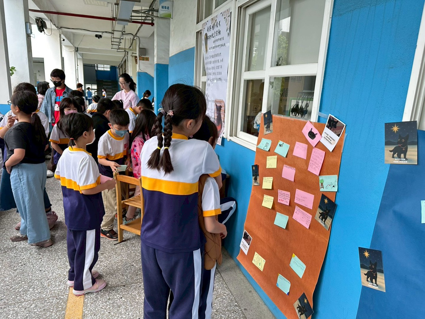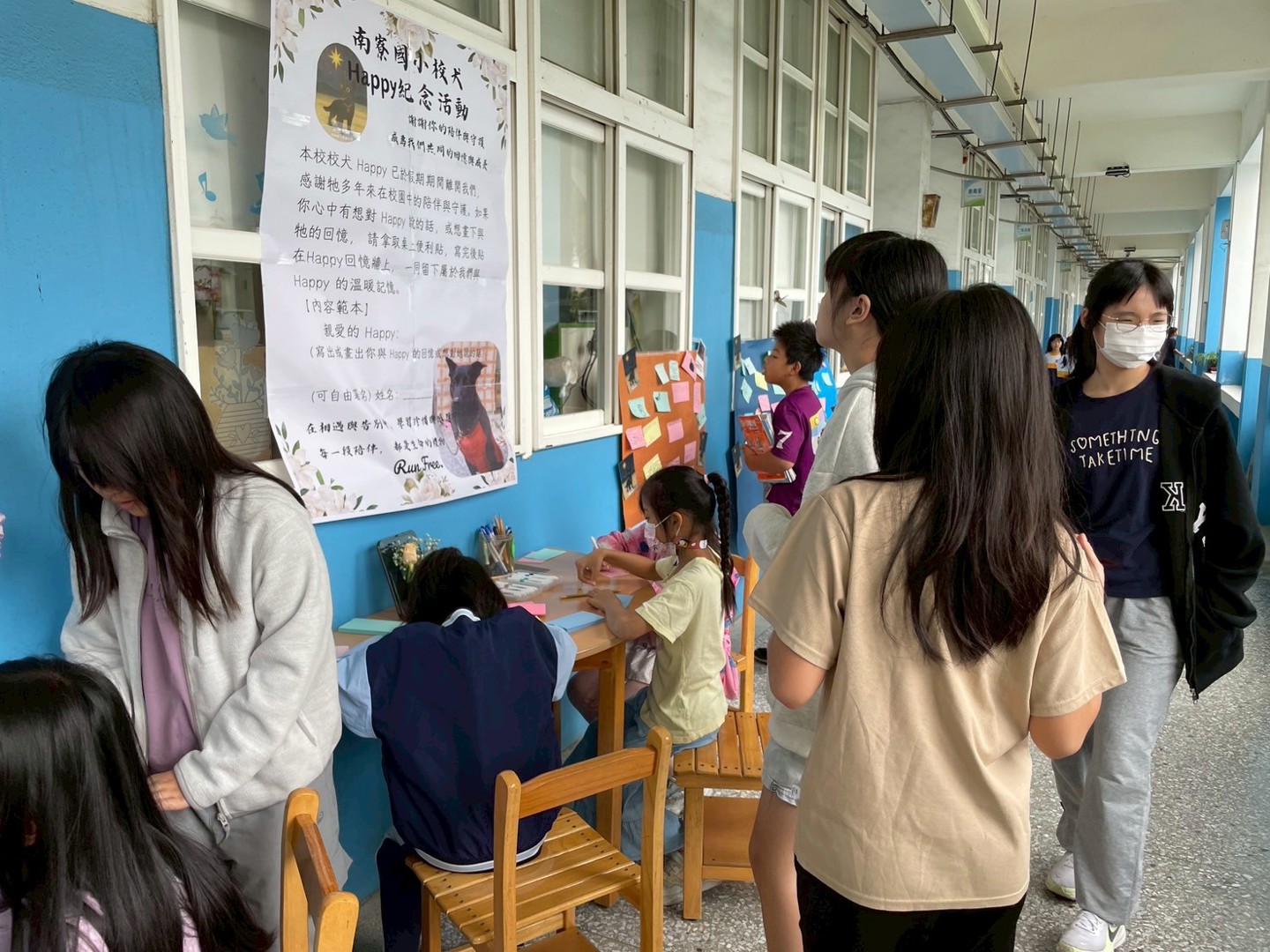 為了紀念Happy,學校特別於校園走廊設置「Happy紀念專區」,並舉辦回憶卡片書寫活動。師生可自由取用小卡,寫下對Happy的思念或畫下與牠相處的點滴,再張貼於「Happy回憶牆」上。活動期間,不少學生主動前往參與,有的低頭專注書寫,有的彼此分享與Happy的互動回憶,現場氣氛溫馨而感人。