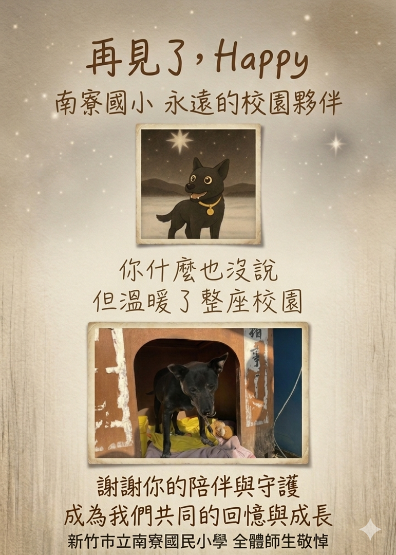 新竹市南寮國小校犬Happy於日前安詳離世,結束陪伴校園約十五年的時光。Happy長年在校園中穿梭,無聲守護師生,已成為孩子們心中最熟悉、也最溫暖的校園夥伴。牠的離開,不僅讓全校師生深感不捨,也讓大家重新體會「陪伴」與「告別」的意義。