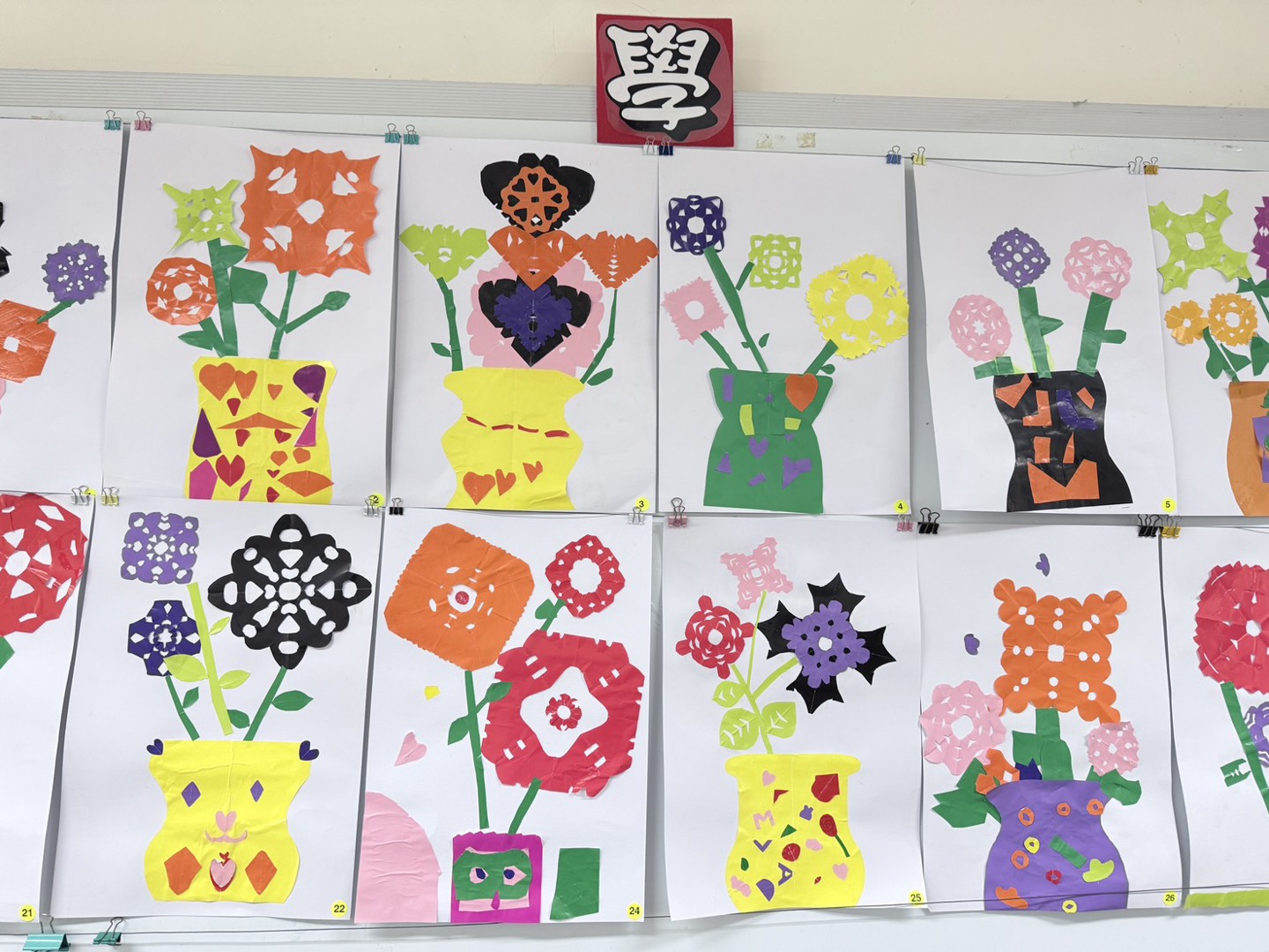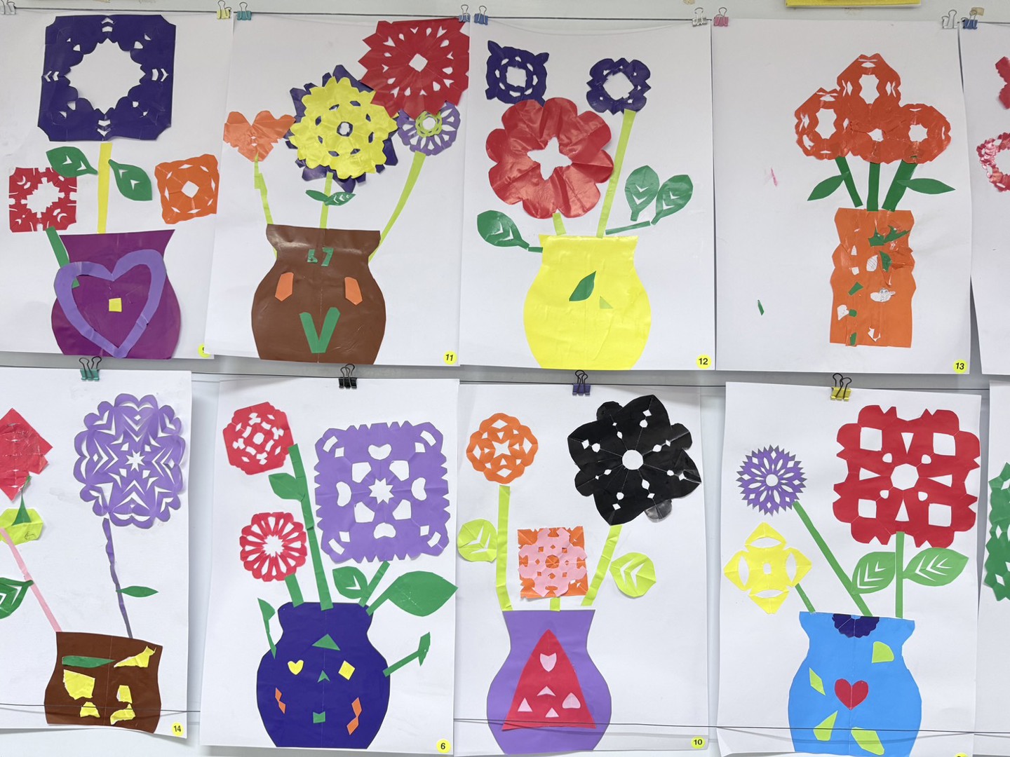 上完自然軸-花樹小尖兵後,我們讓孩子動手進行藝術創作,時值春季,春暖花開,大家一起動手剪窗花,貼出一幅幅美麗的春天花朵。配上線對稱技法剪出花器及愛心等可愛小裝飾,運用剪貼技法剪出一幅幅春花。可別小瞧一年級孩子的想像力與創造力,每幅作品都讓孩子滿意得不得了。