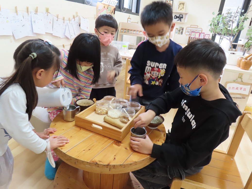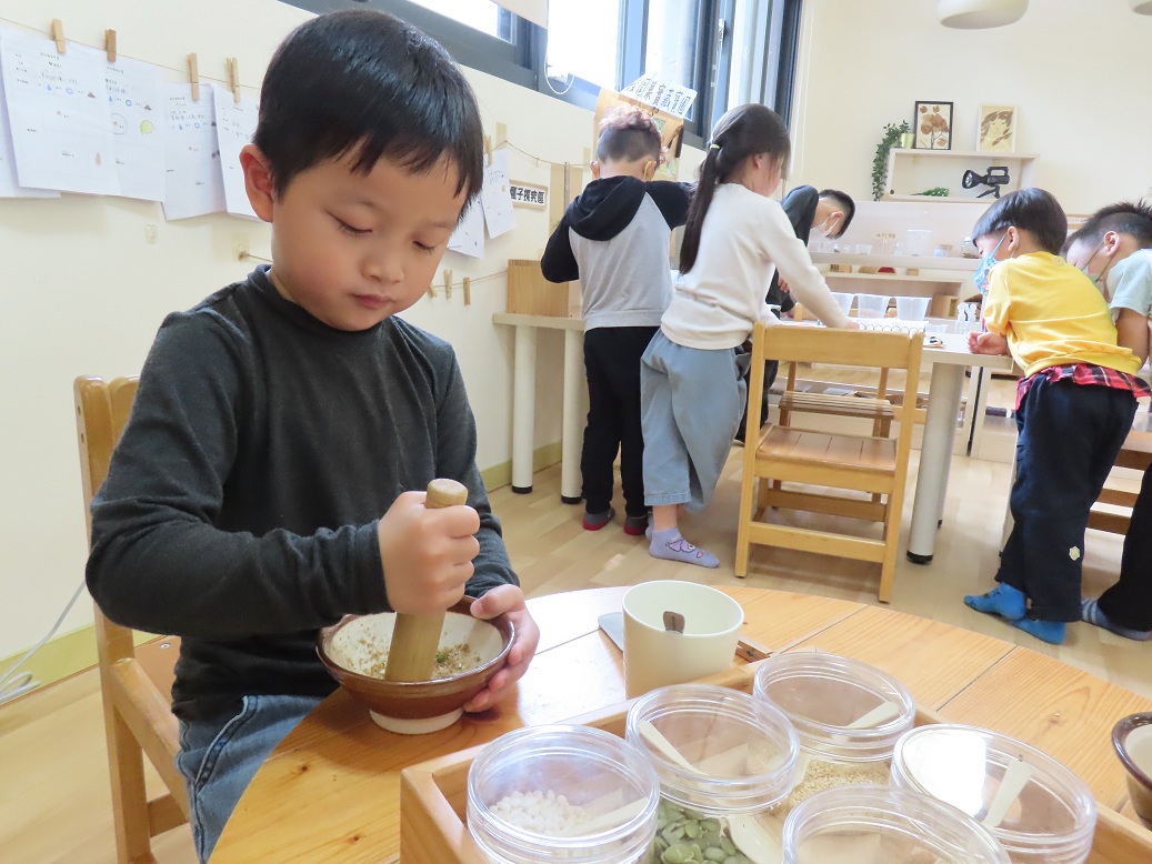 延續上學期在自然風味區沖泡麥茶的經驗,孩子們驚喜地發現,原來小小的種子也能化身為好喝的飲品!這次,我們特別準備了花生、南瓜籽、黑白芝麻等豐富堅果與研磨工具,帶領孩子體驗客家傳統的迎賓美食——「擂茶」。