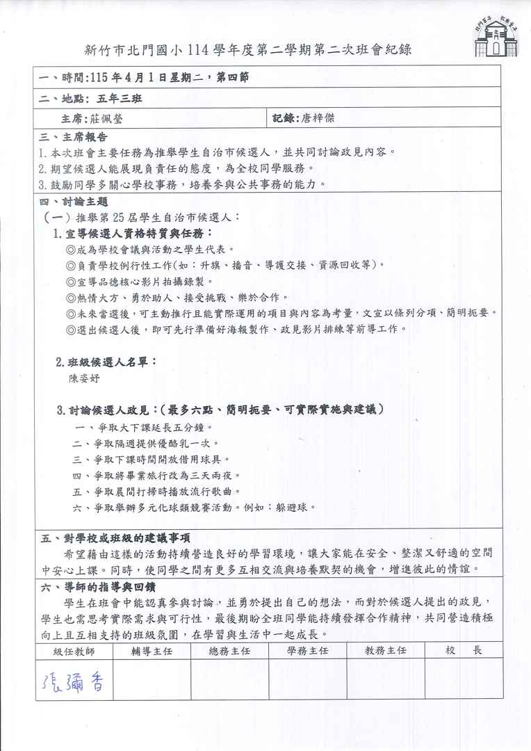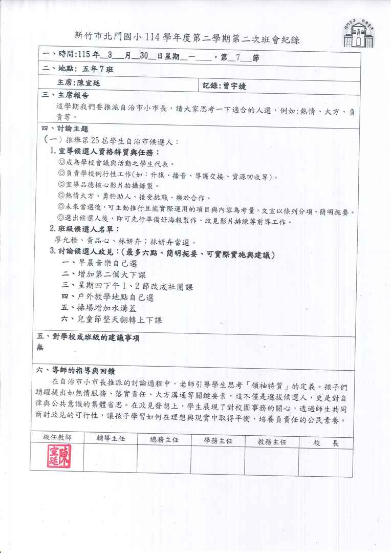 為深化學生民主人權素養,培養公共參與精神,北門國小於114學年度辦理第26屆學生自治市選舉活動,正式揭開校園民主人權實踐的序幕。本次選舉依舊由五年級學生擔任自治市長候選人,各班透過班會討論,推選具服務熱忱與責任感的代表參與競選。