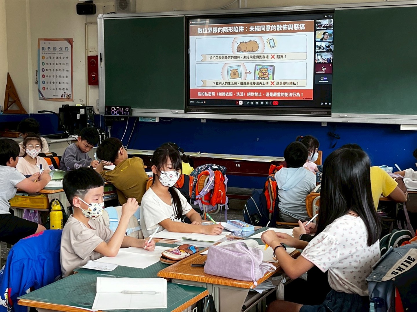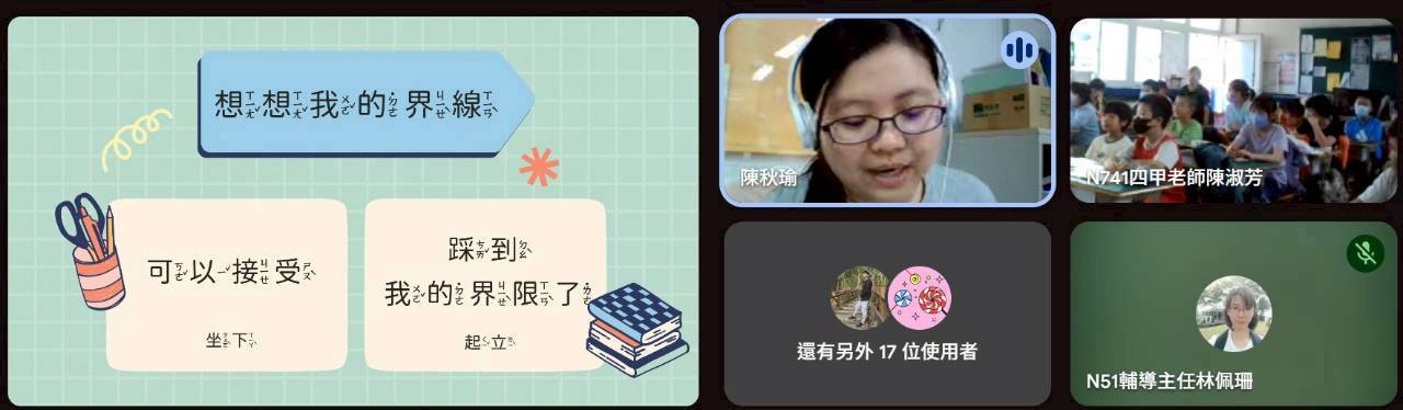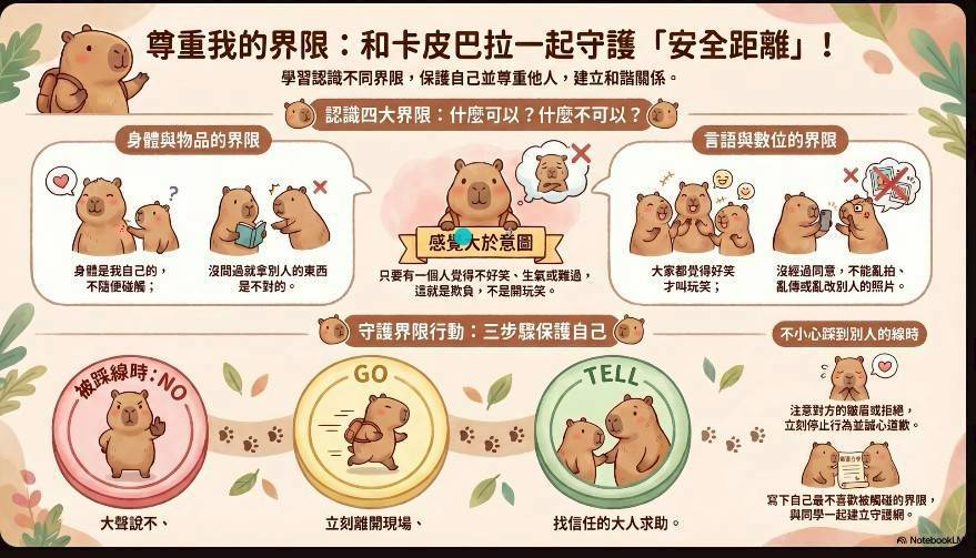 本次宣導以可愛的卡通角色為引導,從學生生活經驗出發,說明「身體的界線」與「言語的界線」。課程中強調:「身體是自己的,沒有經過同意,不可以隨意碰觸他人」,同時也提醒學生,不嘲笑、不取笑他人的身體或行為,培養彼此尊重的態度。