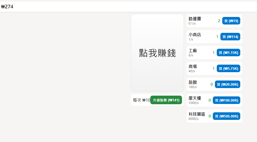 內容從簡單的「點擊方塊加分」,到刺激的「砲彈射擊方塊」,學生一步步學習與AI對話,自己動手打造遊戲世界。其中最受歡迎的是「大亨經營遊戲」,孩子把點擊賺來的金錢拿去開小吃店、蓋工廠,甚至打造科技園區,體驗越玩越有錢的成就感。