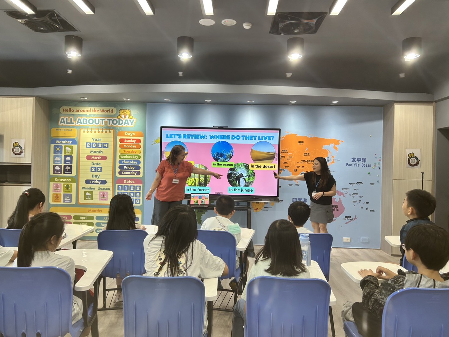 能移地到英語體驗教室上課,同學們期待中,帶著好奇、新鮮以及些許緊張。幸而上課的老師們親切活潑的引領,讓大家開始收整思緒,回到完整豐富的英語課程。
