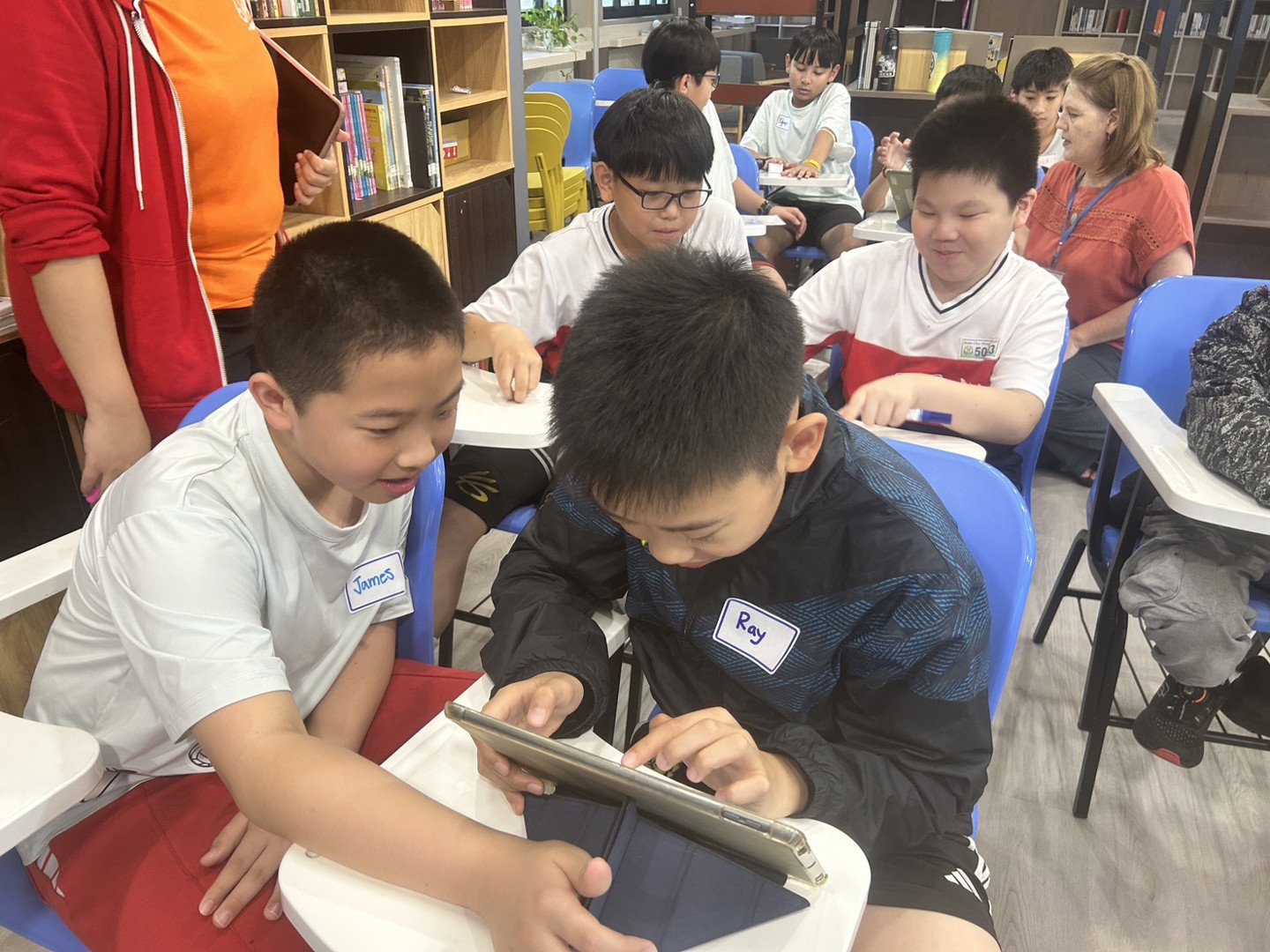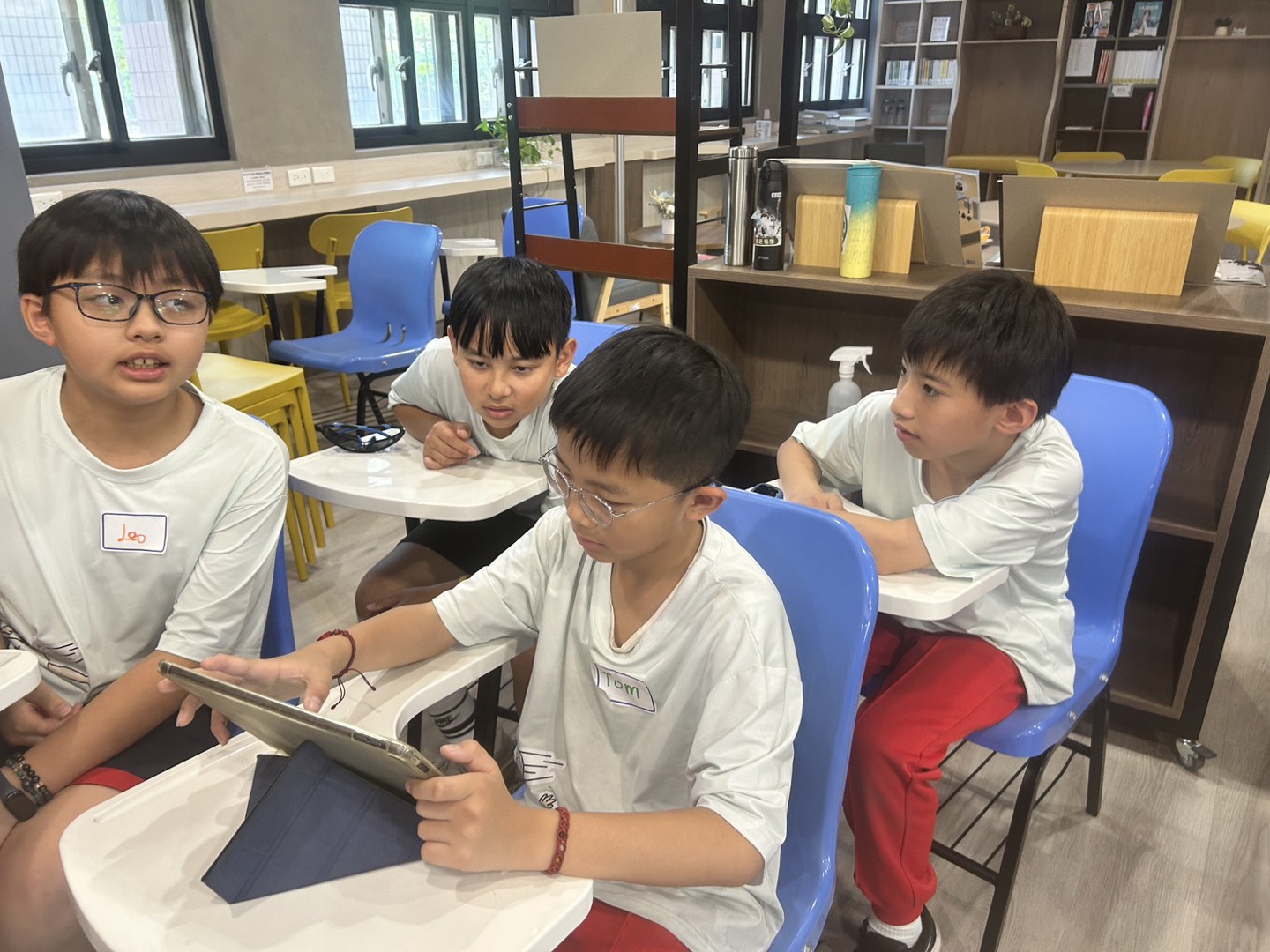 課程主題是認識動物。外師全英語從動物的棲息地、特性到趣味知識分享。孩子們此堂課最大的任務就是運用平板、小白板準備好的材料,分組上台與全班分享各自的動物介紹。