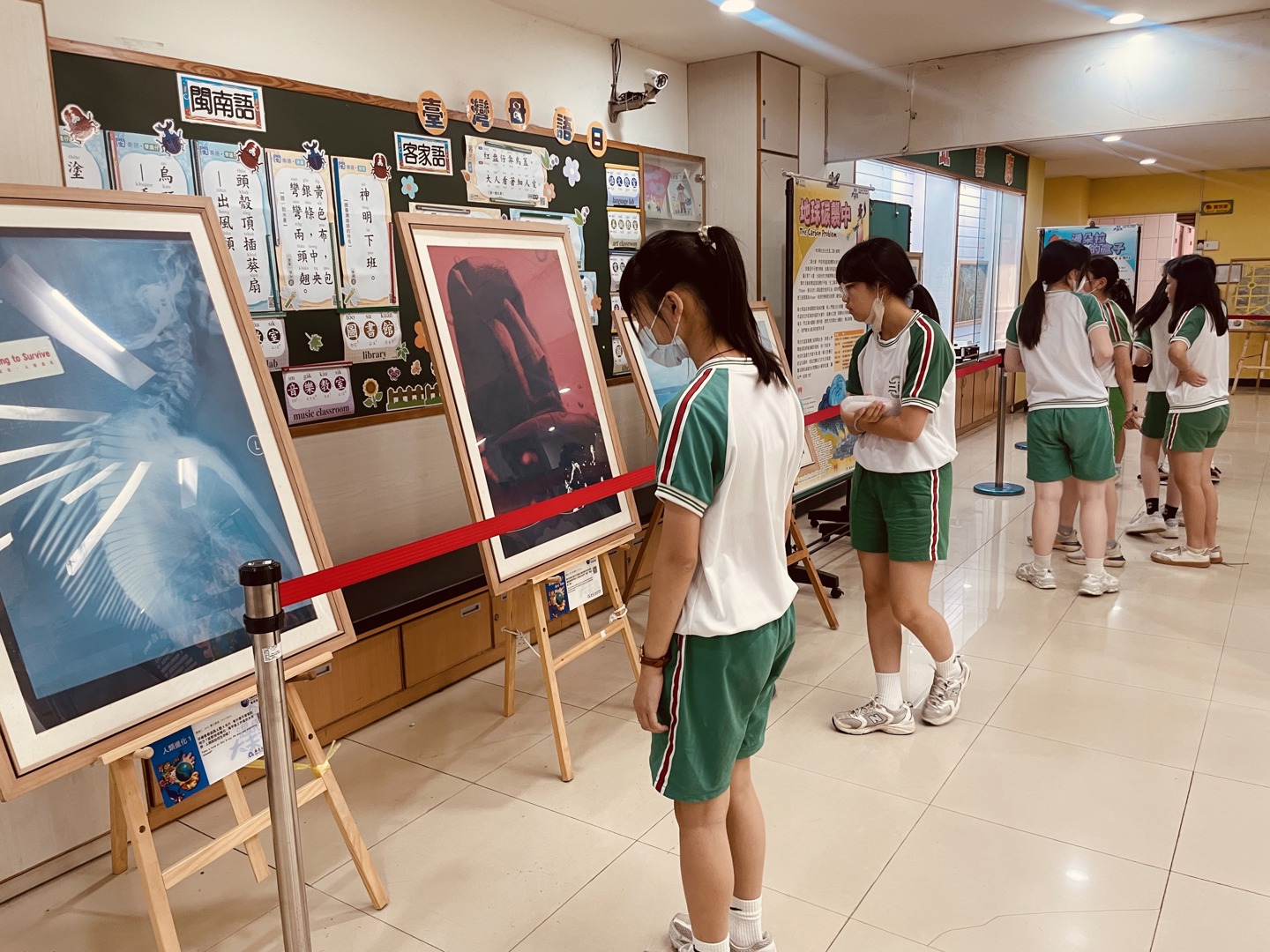導覽結束後,導師進一步帶領學生完整參觀整個展場,讓孩子們能以更從容的步調細細欣賞每一件作品。學生們三三兩兩駐足觀察,彼此交換心得,從藝術作品延伸到全球環境保護、永續發展等重要議題,展現出跨領域的學習成果。