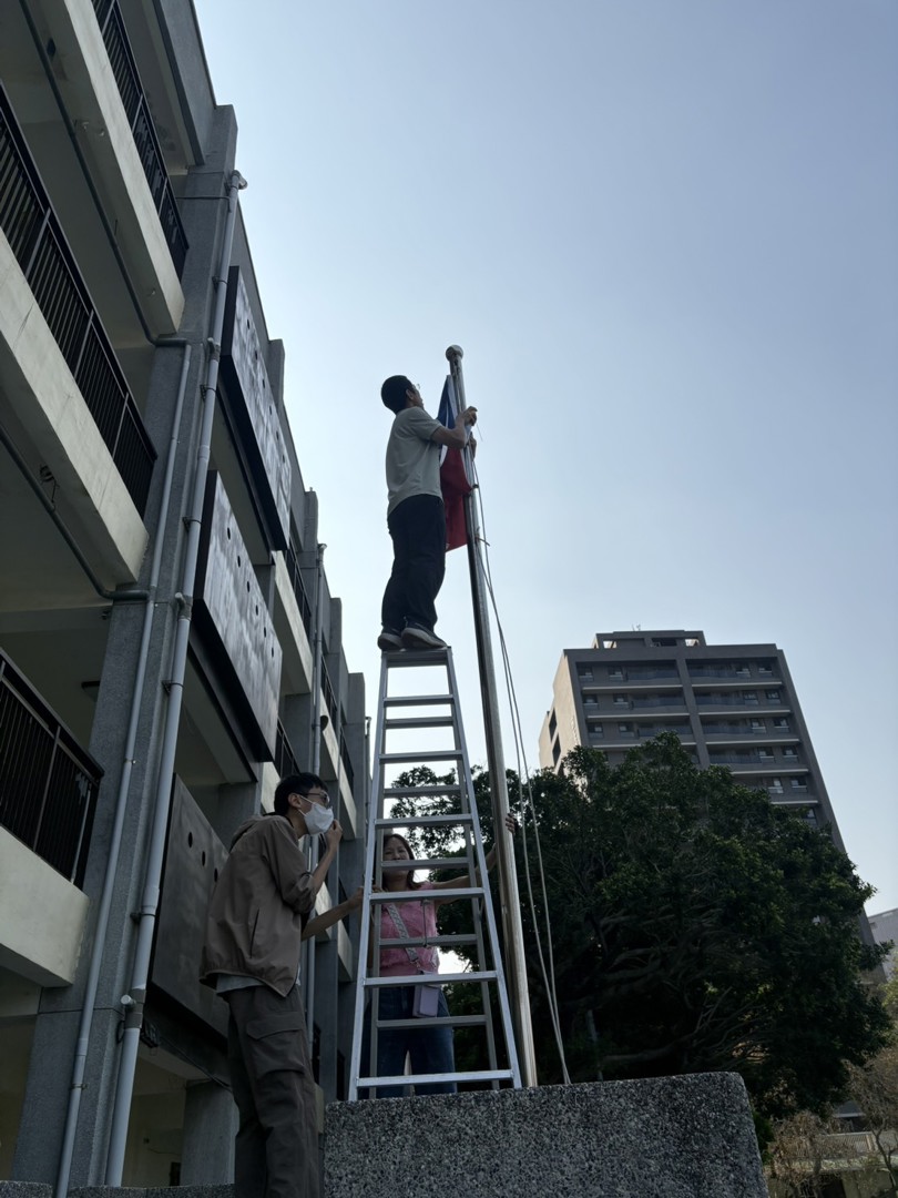 今天一早總務主任特別帶領服務團隊前往操場,站上A字梯幫忙在國旗桿上滾輪上潤滑油,讓滾輪因潤滑油的滋潤而滾動好,在下次升旗時轉動可以更順暢!