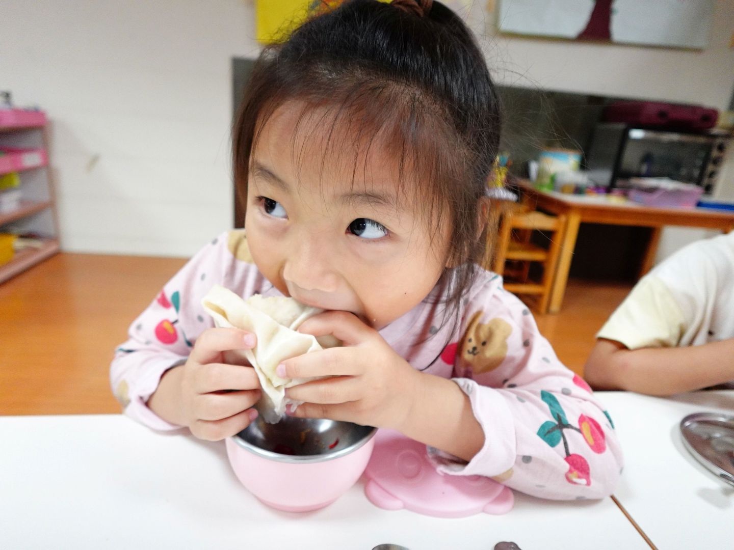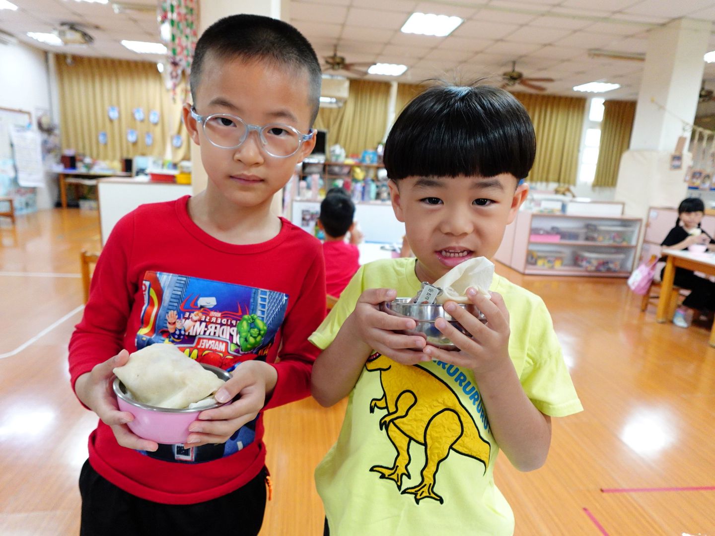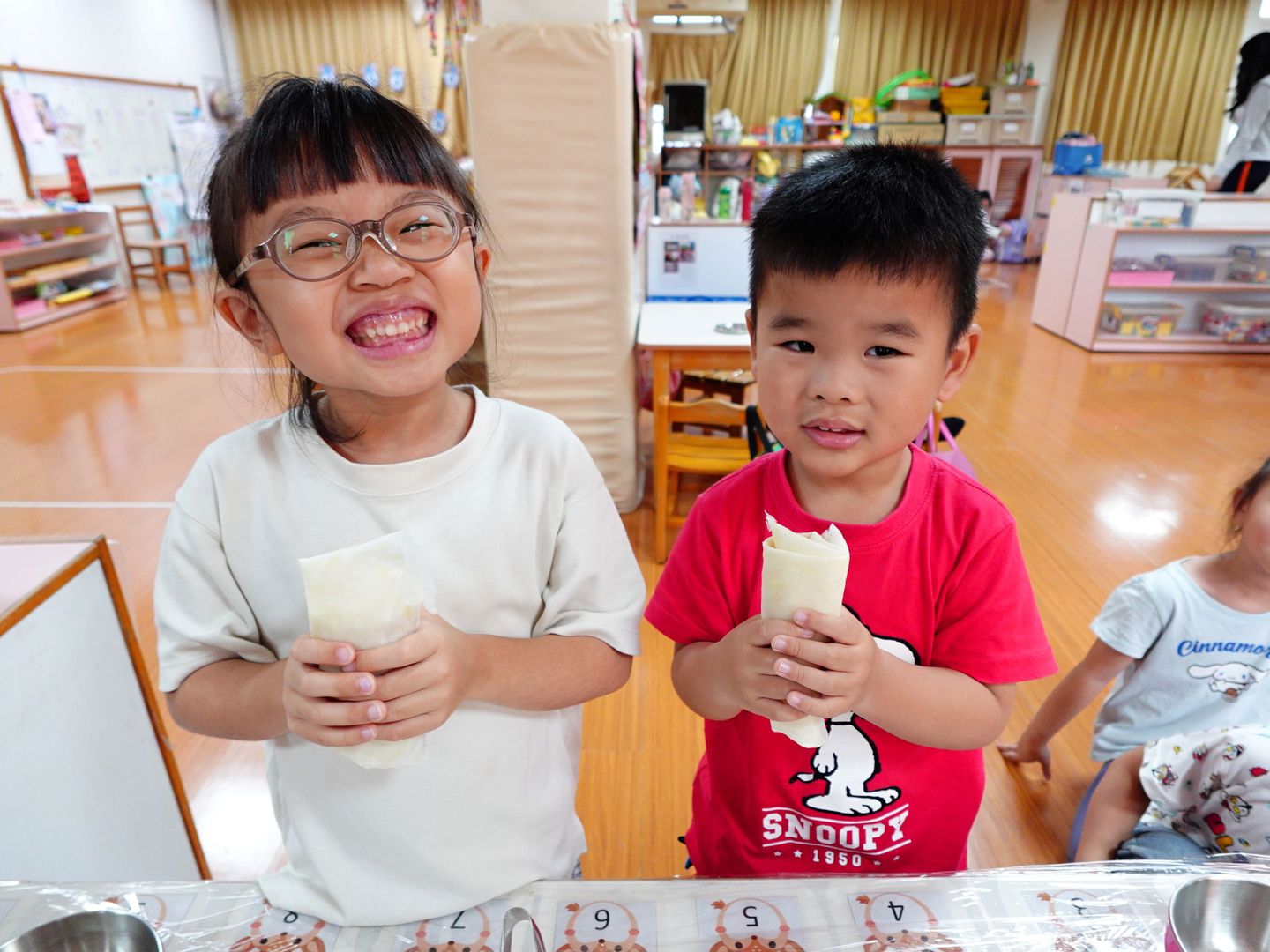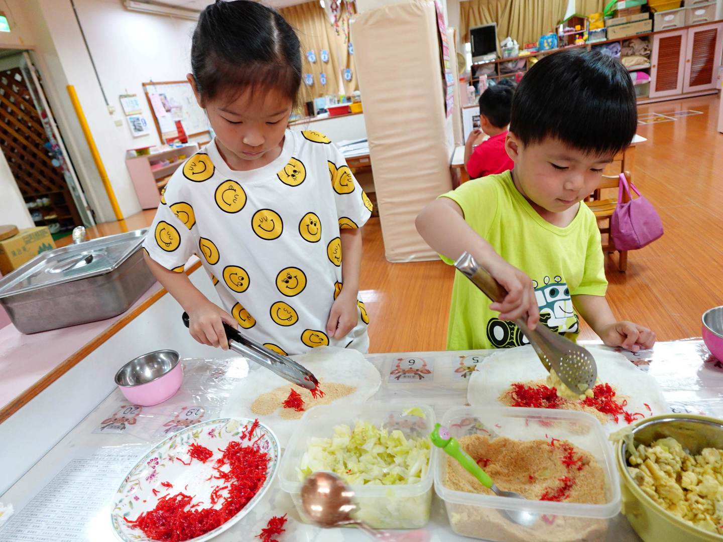 「做中學」是我們最重視的教育理念。阿姨幫我們準備了蛋、高麗菜、豆棗、潤餅皮及花生粉等材料,讓孩子們體驗包潤餅的樂趣。過程中不僅可以動手製作,更能學習到各種食材的特性和使用方式,一邊吃一邊玩,既好吃又好玩。
