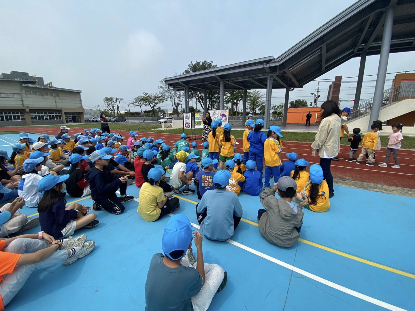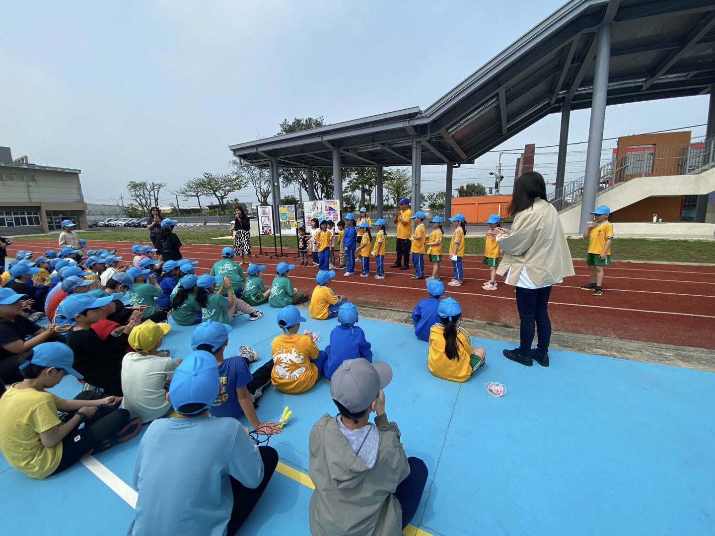 115.04.09 週四課間活動-全校大跳繩結束後,學務處 靜怡主任表揚本週優秀筆記以及優秀畫作的港南孩子。令人驚喜的是,這次的獲獎名單中,許多都是低年級孩子和幼兒園小寶貝呢!