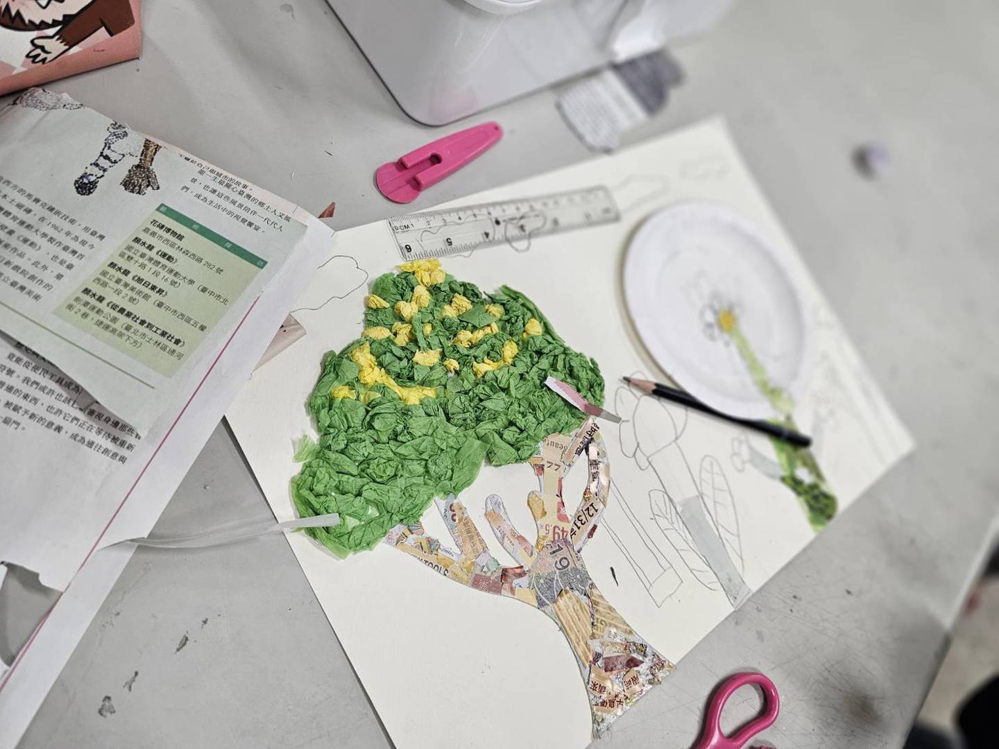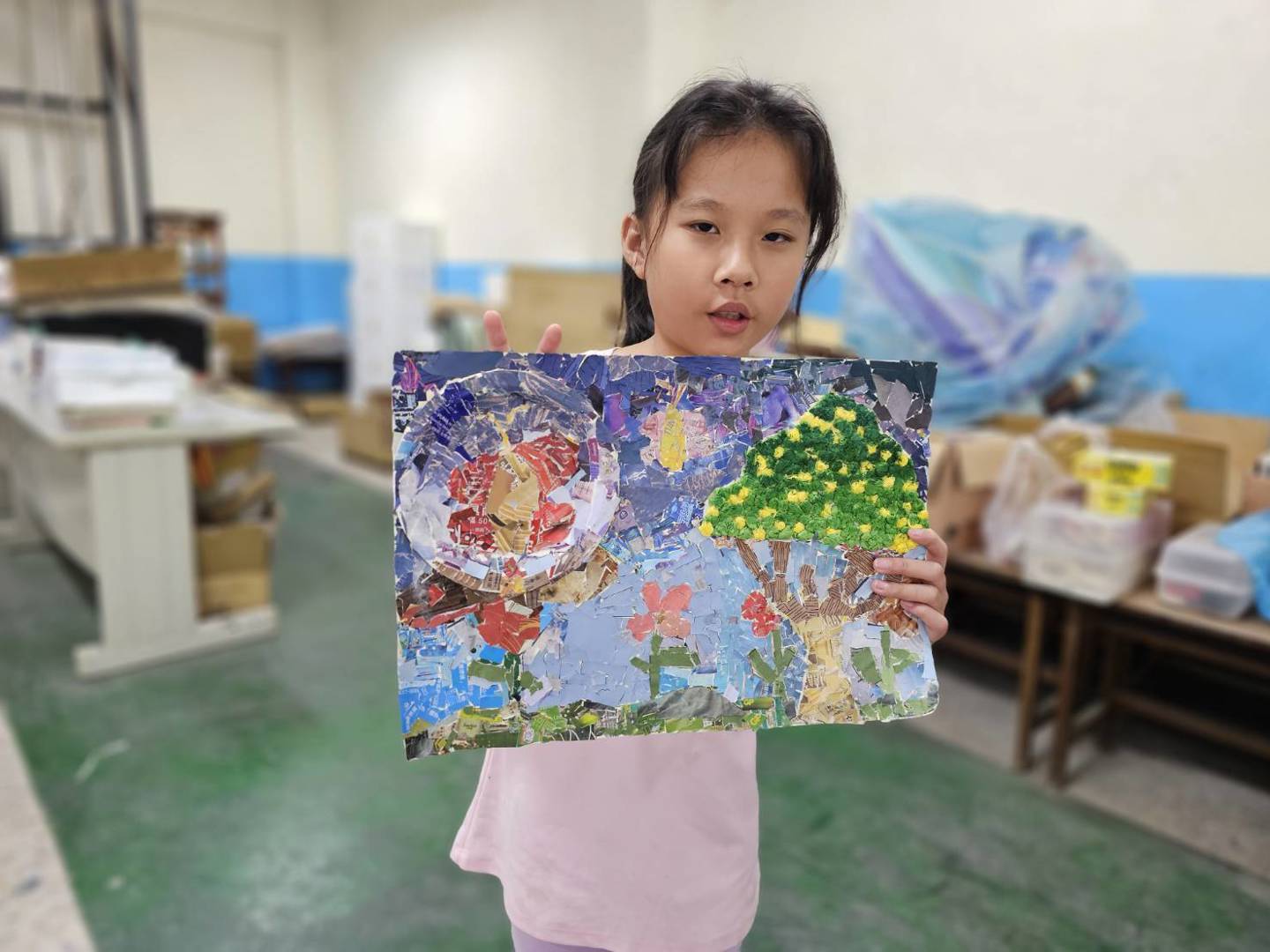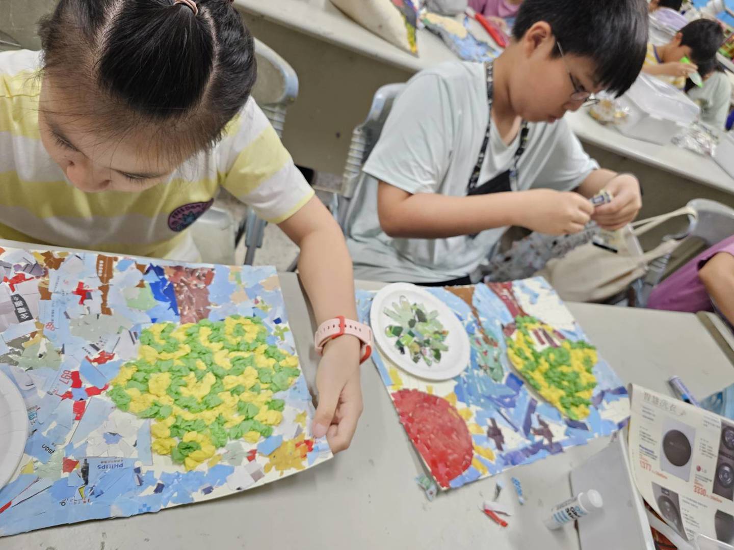 在這堂藝術課中,我們將 #回收紙張化身為創作素材,運用平時蒐集的廣告紙、包裝紙與報紙,透過不同色彩與質感的拼貼,展現出豐富的視覺層次。拼貼不只是「貼一貼」,更是一場 #耐心與細心的挑戰!