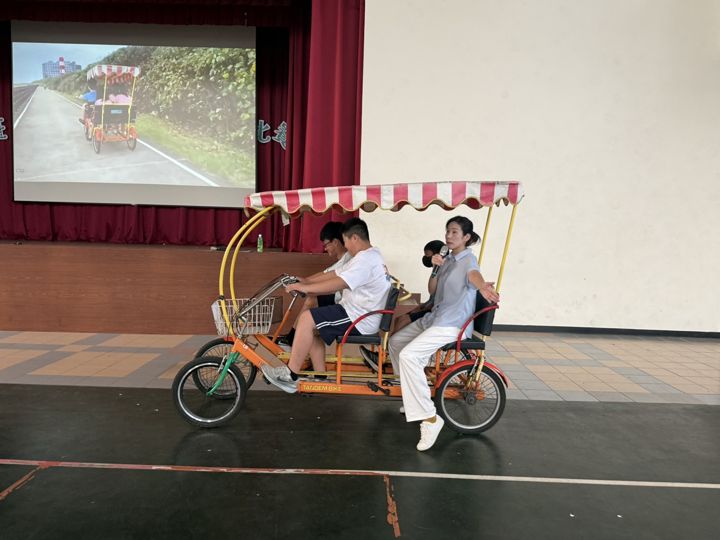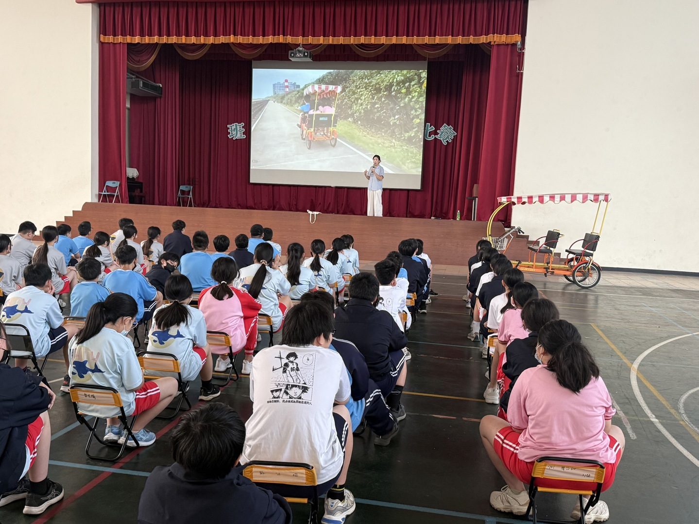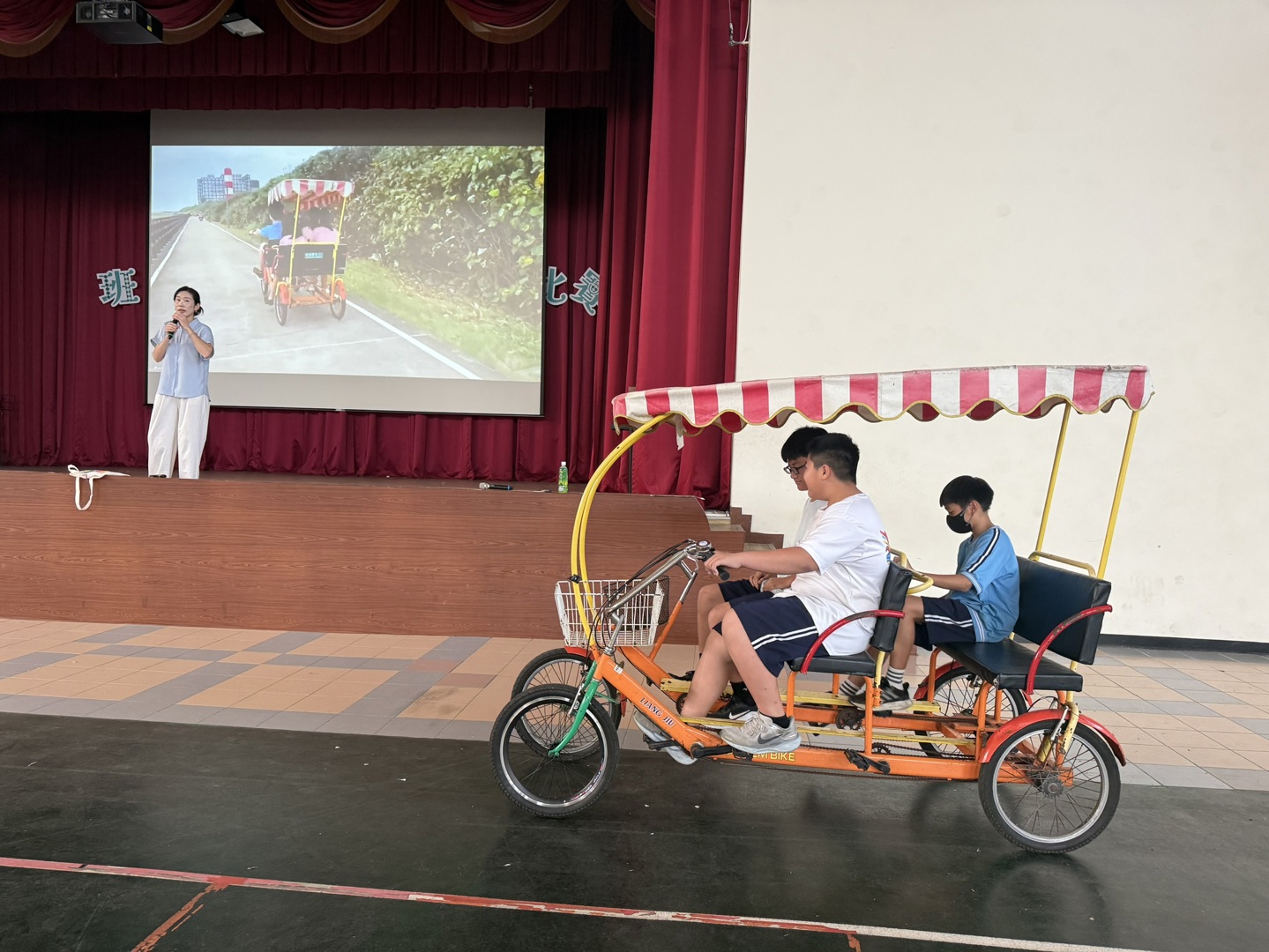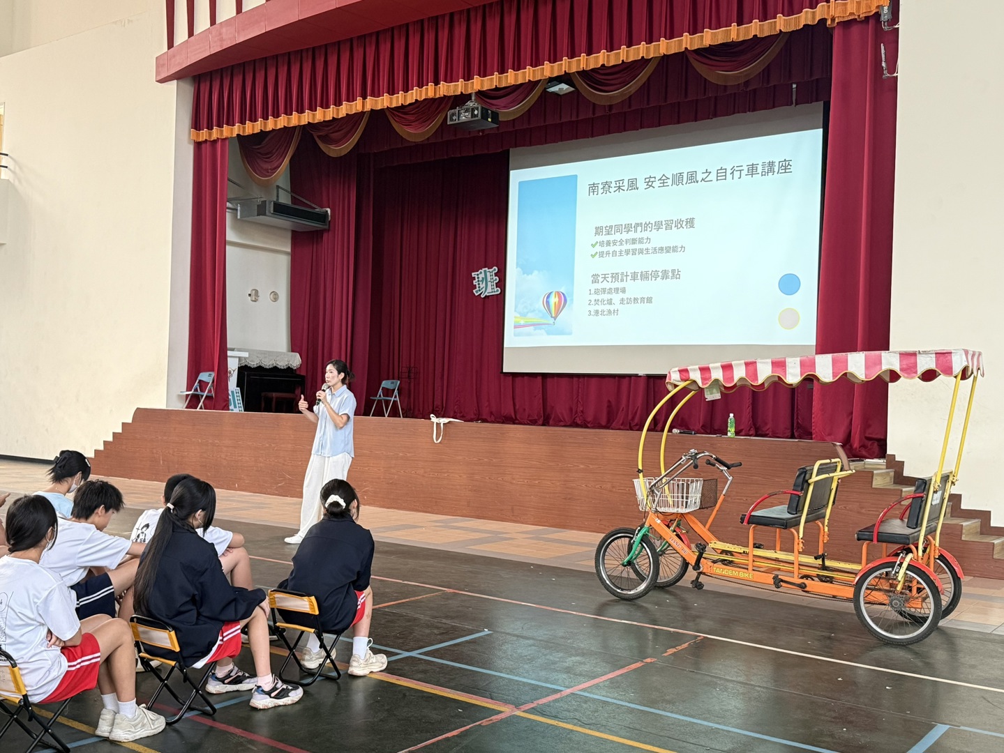 講座中指出,四人協力車車體較重、煞車距離較長,且海岸線風勢強勁,騎乘時須特別留意車輛穩定與轉彎安全。宣導重點包含駕駛負責控制方向與煞車、乘客穩定踩踏不隨意晃動,並提醒學生於會車、路口及人多處主動減速,落實「提早煞車、慢速轉彎」之原則。