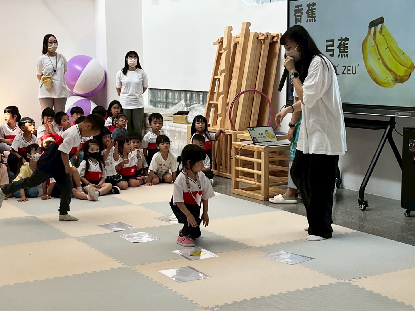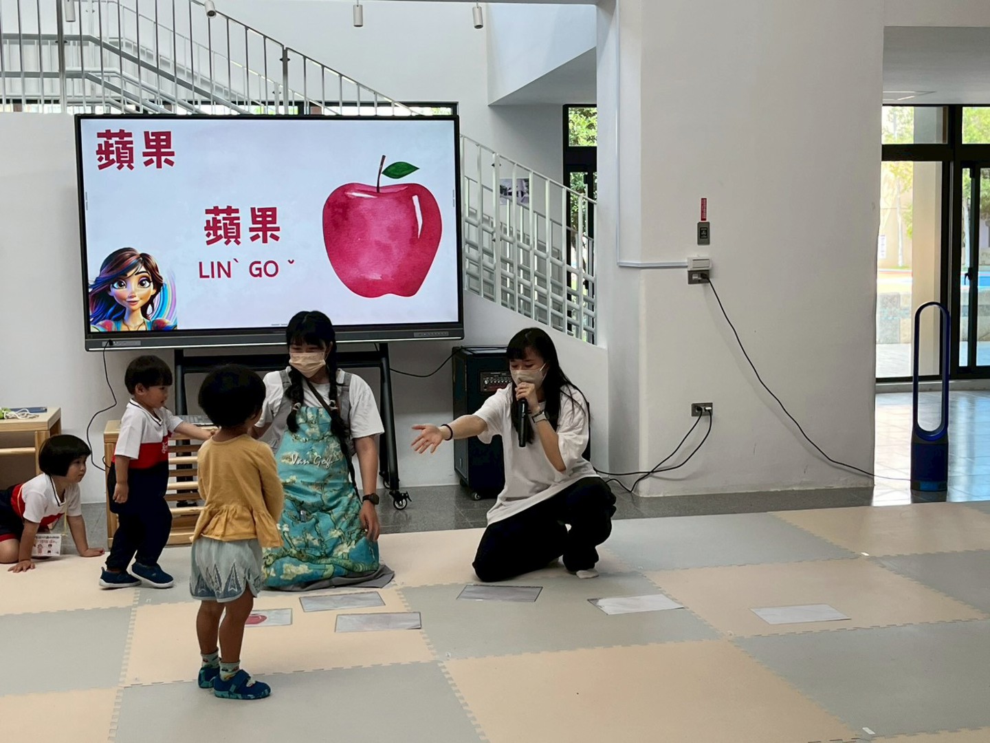 本週晨會結合本土語與大肌肉活動,帶著孩子們透過朗朗上口的水果歌,一起認識蘋果、香蕉、芒果的客家話怎麼說。