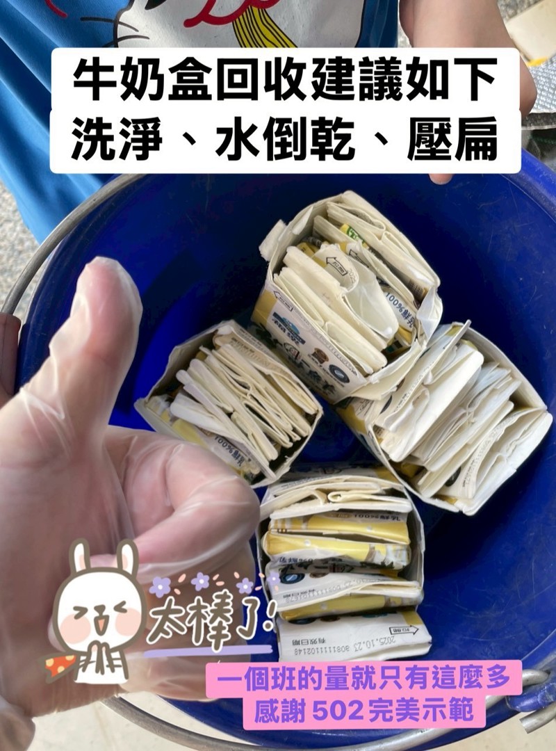 在全校師長的指導下,學生們落實分類,更進一步學會「減量」的重要。例如周周的鮮奶盒,各班都會清洗乾淨並妥善摺疊,養成良好的環保習慣。