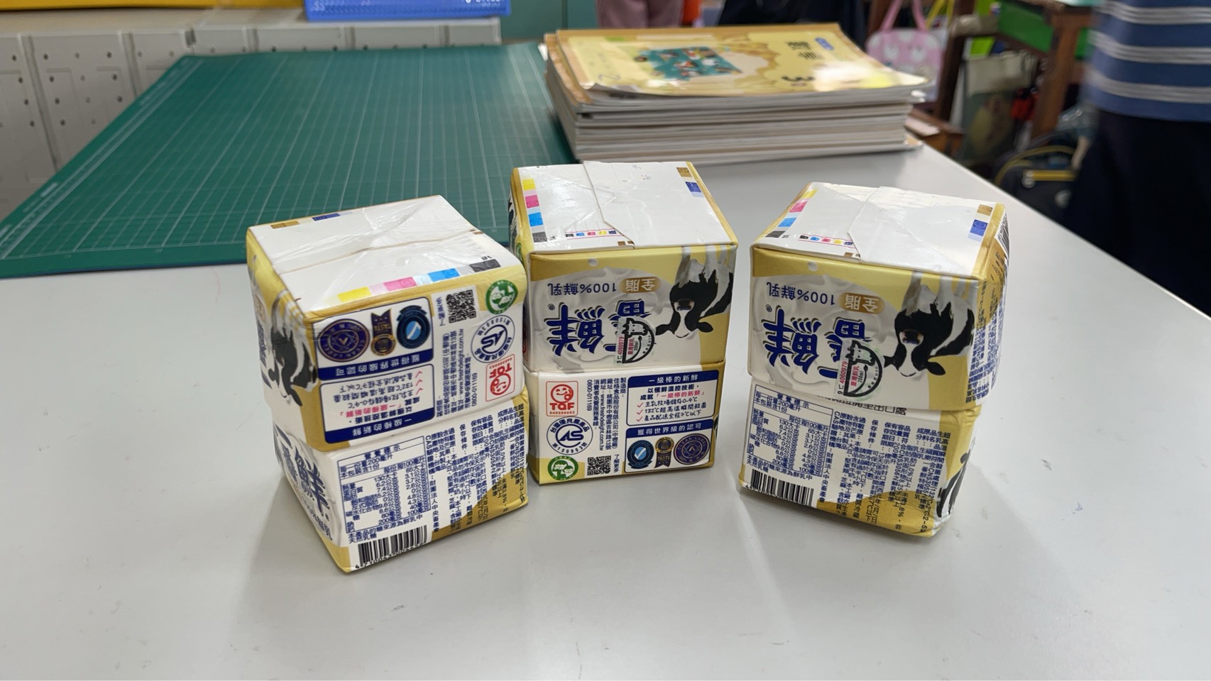 令人驚喜的是,三年12班的孩子們發揮創意,將洗淨的牛奶盒轉化為排列組合的積木,化回收物腐朽為神奇的巧思。