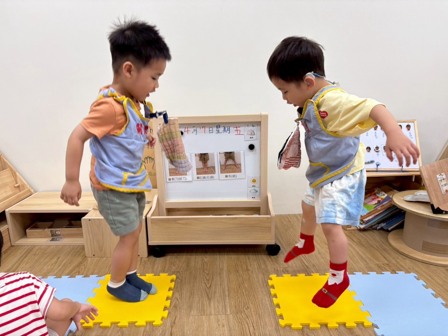 延續之前用手玩「鉸刀 、石頭、紙」,這次配合主題「我的腳」,我們挑戰用腳玩! 全班分成兩組來PK,大家都玩得好開心;另外也一起唱跳母語童謠「點仔膠」。