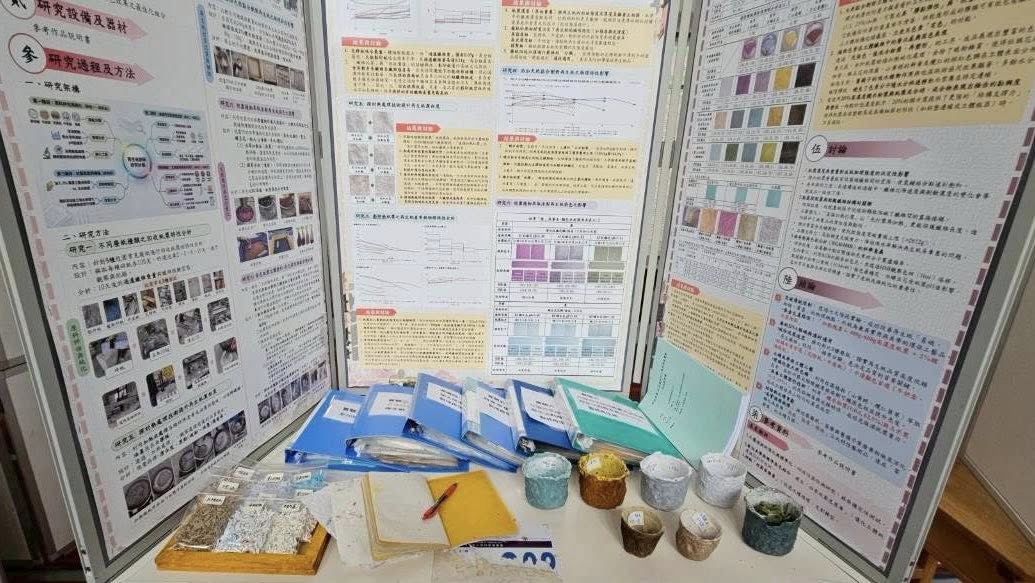 感謝梅英老師指導學生:晨軒、承昀、京凱與智宇,以「校園四季」為題:春季杜鵑、夏季蝶豆花、秋季山黃梔與冬季大葉欖仁,帶領廢紙廢紙箱走出資源回收室,華麗轉身為紙工藝,展現「創客」精神與環保永續理念。