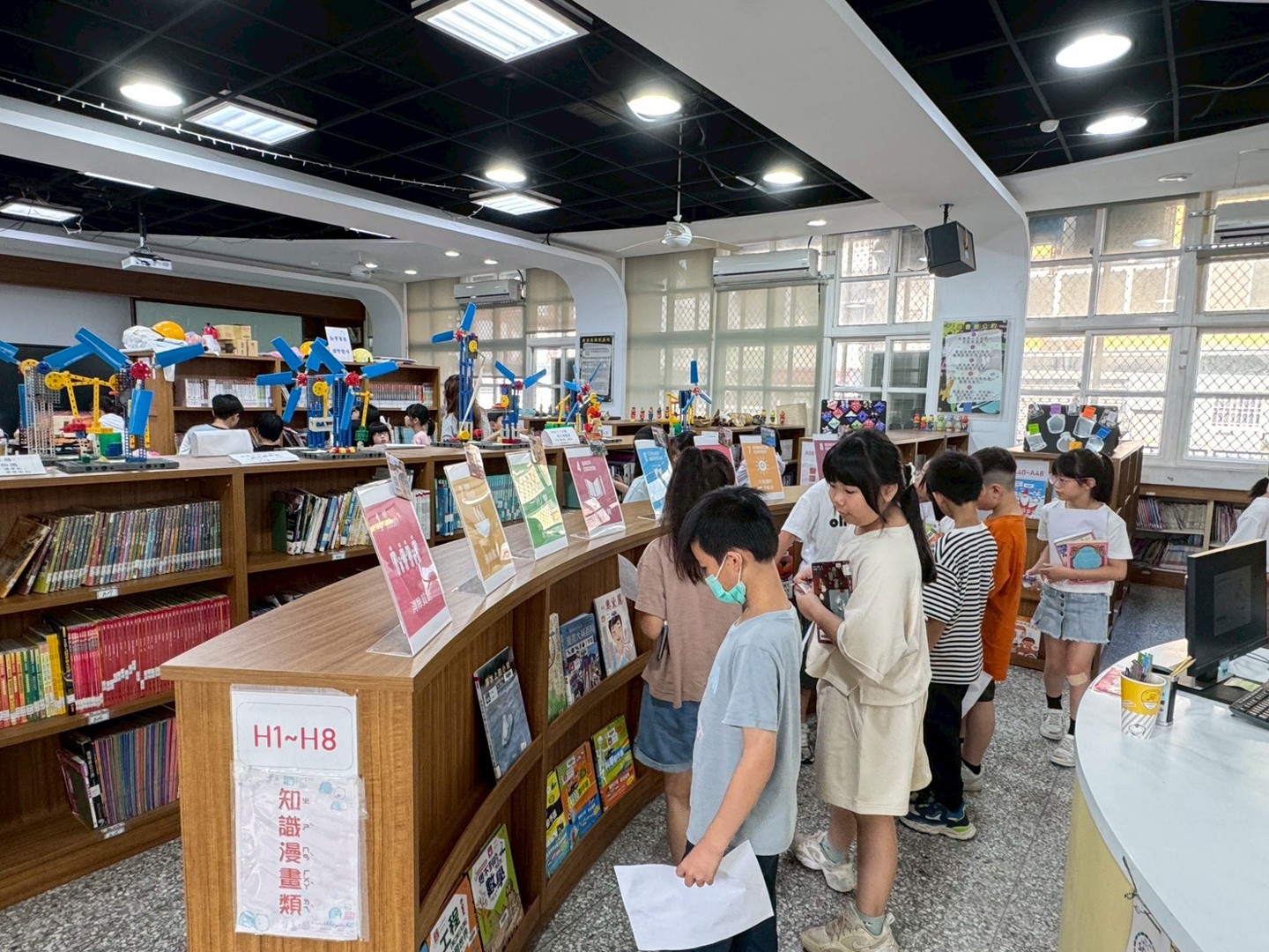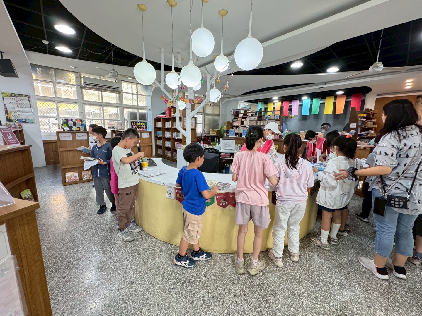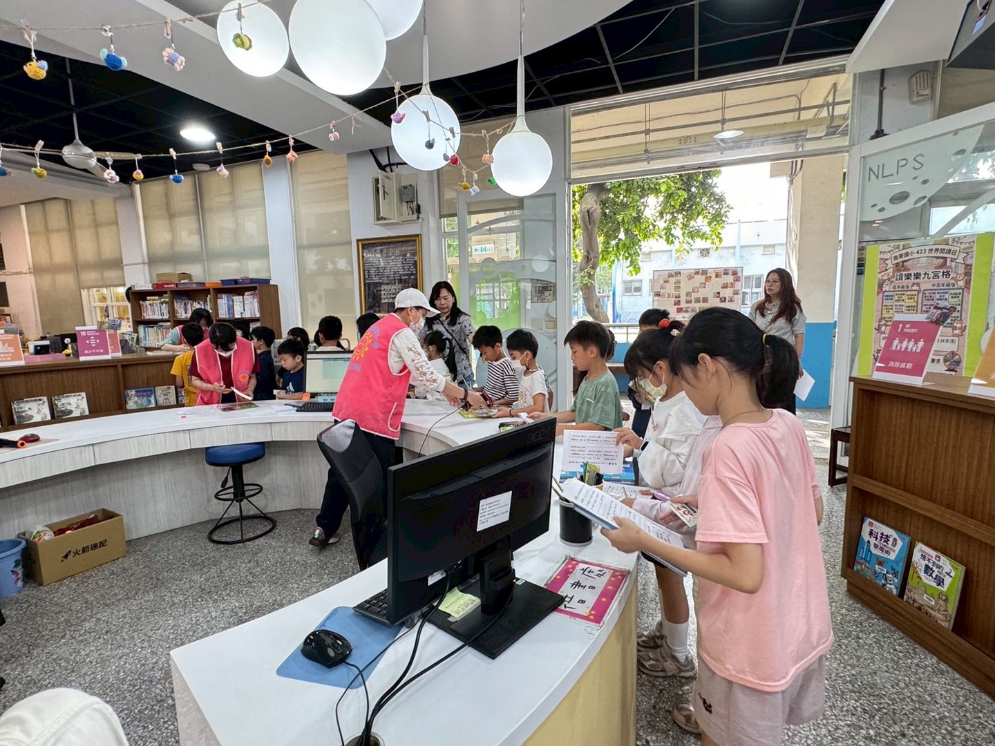 一早圖書館就擠滿了小小探險家,大家拿著闖關卡,穿梭在書架間尋找科學、藝術與海洋的足跡,志工老師們熱情引導孩子認識圖書館分類。