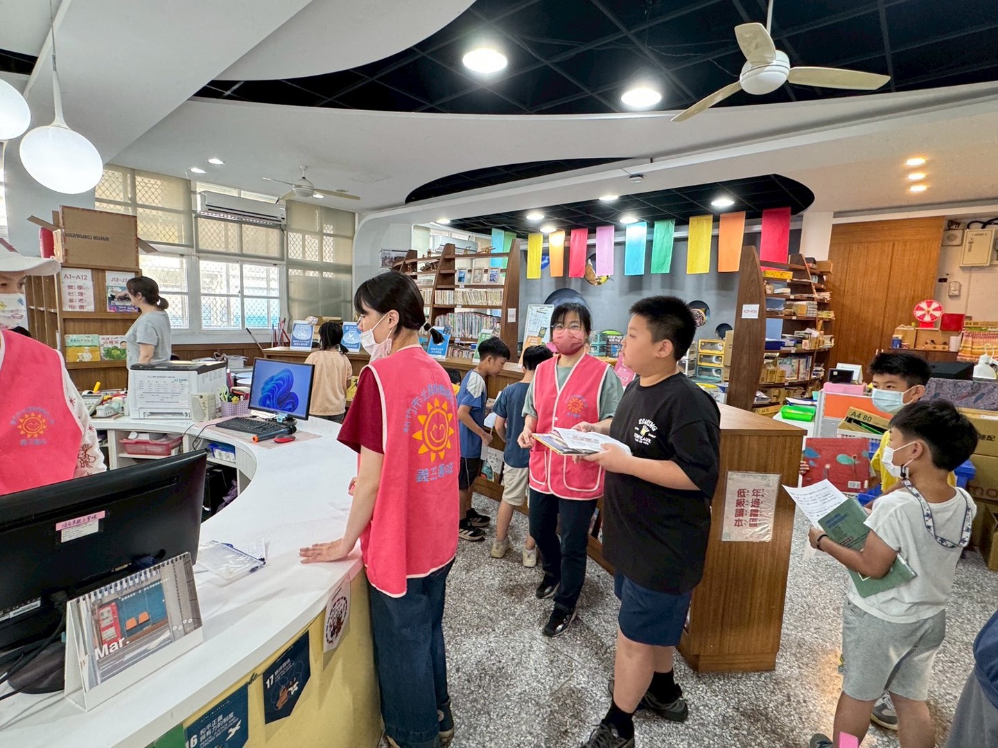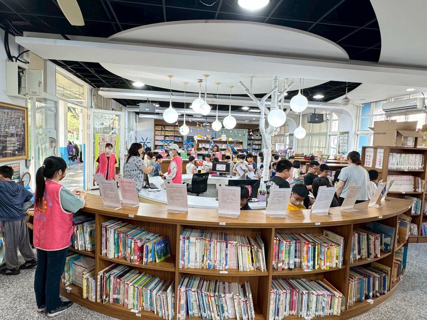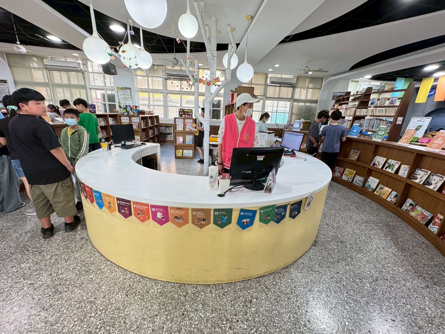 一早圖書館就擠滿了小小探險家,大家拿著闖關卡,穿梭在書架間尋找科學、藝術與海洋的足跡,志工老師們熱情引導孩子認識圖書館分類。